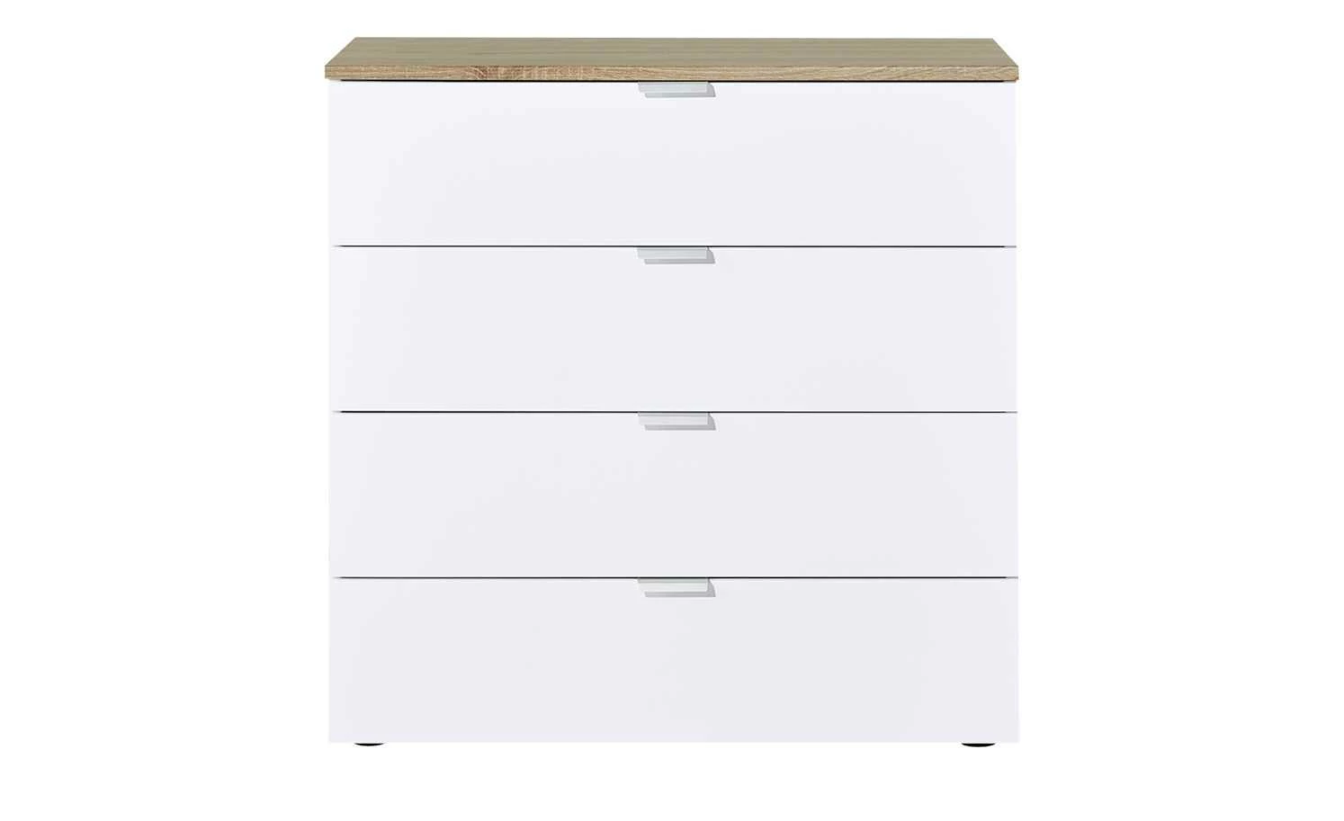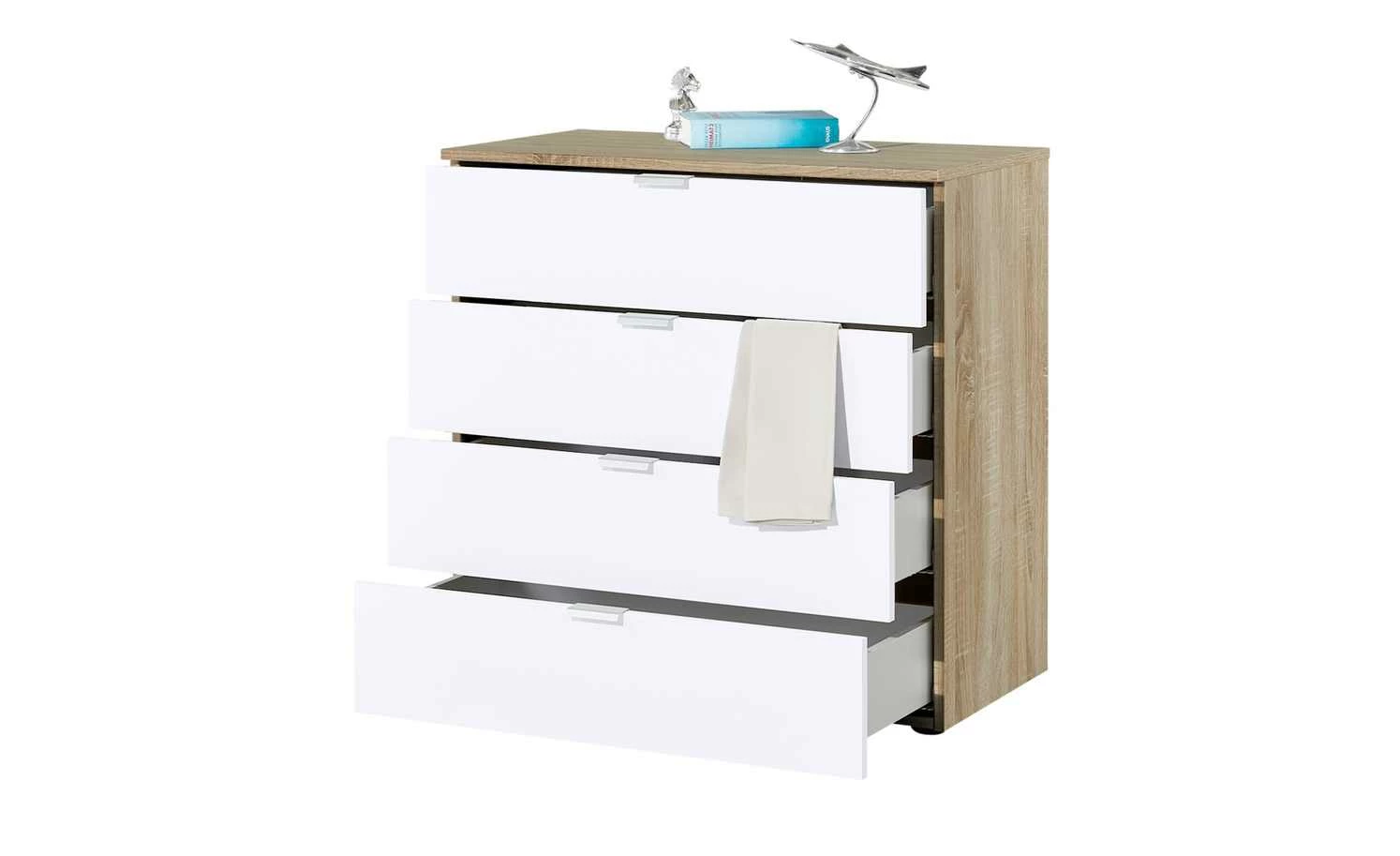 Viel Stauraum für zusammengelegte Shirts und andere Kleidung bietet Ihnen das Sideboard Dreamer. Die vier länglichen Schubfächer sind untereinander angeordnet und gleich groß. Der Korpus hat ein attraktives Holzdekor in Eiche sägerau (Nachbildung). Es wirkt sehr natürlich und hat eine charmante Maserung. Die Front setzt sich in Weiß ab. Und punktet mit ihrem edlen Glanz. Dank des geschmackvollen Designs passt Dreamer zu vielen Einrichtungsstilen. Am besten jedoch zu den anderen Modellen der Serie Dreamer. Die Griffe sind alufarben und setzen sich so schön vom Weiß ab.