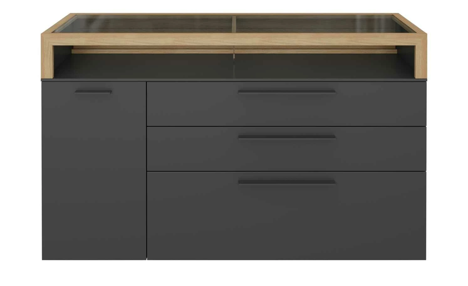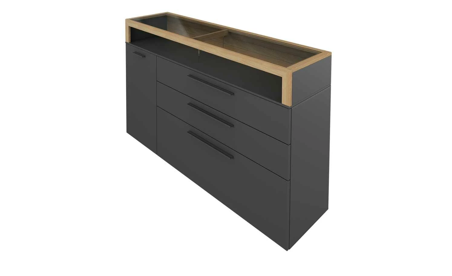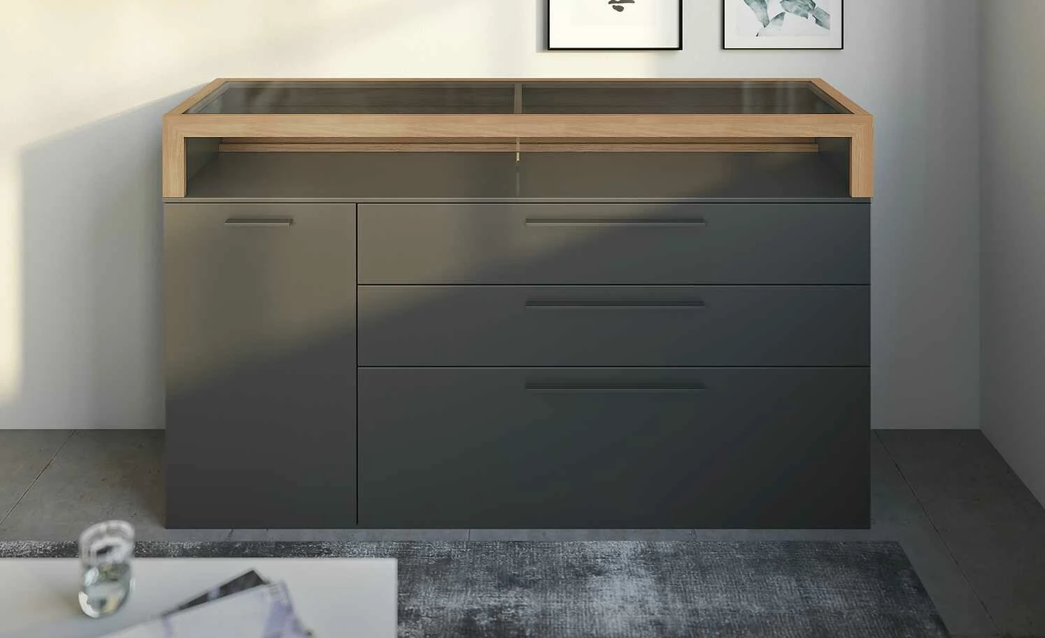 - Mehr zum Material: Material sichtbare Rückwand: Holzwerkstoff furniert, Material Absetzung: Massivholz, Material Deckplatte und Stützwange: Glas