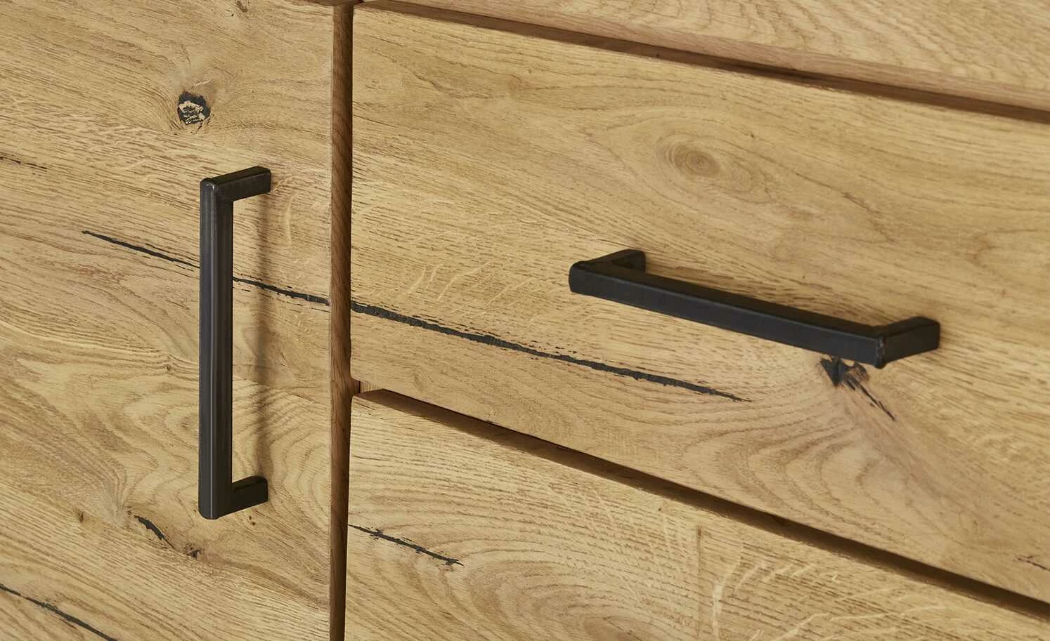 - Mehr zum Material: Korpus und Front: Tischlerplatte Eiche furniert lackiert, Tischlerplatte: Vollholz-Platte mit zwei Schichten aus Eichenfurnier und einer mittleren Schicht aus Kiefer-Massivholz-Leisten, Griffe: Eisen Anthrazit
