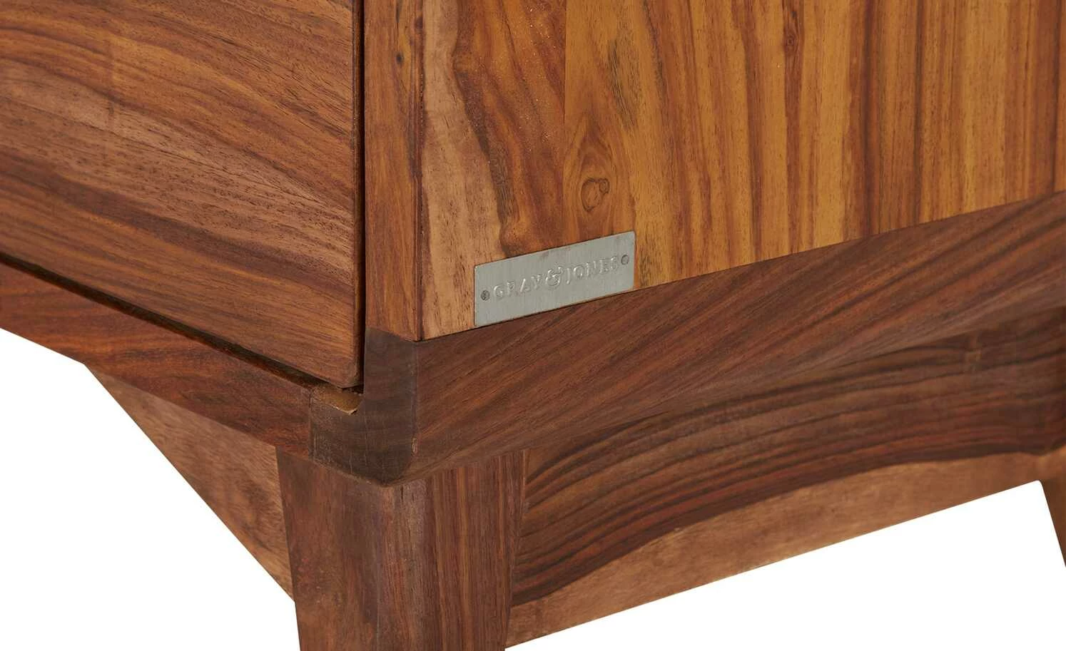 - Mehr zum Material: Front und Korpus Sheesham furniert, Lackbeschichtung Natur / 1 Schubkastenfront mit Kupfer handbeschlagen, lackiert