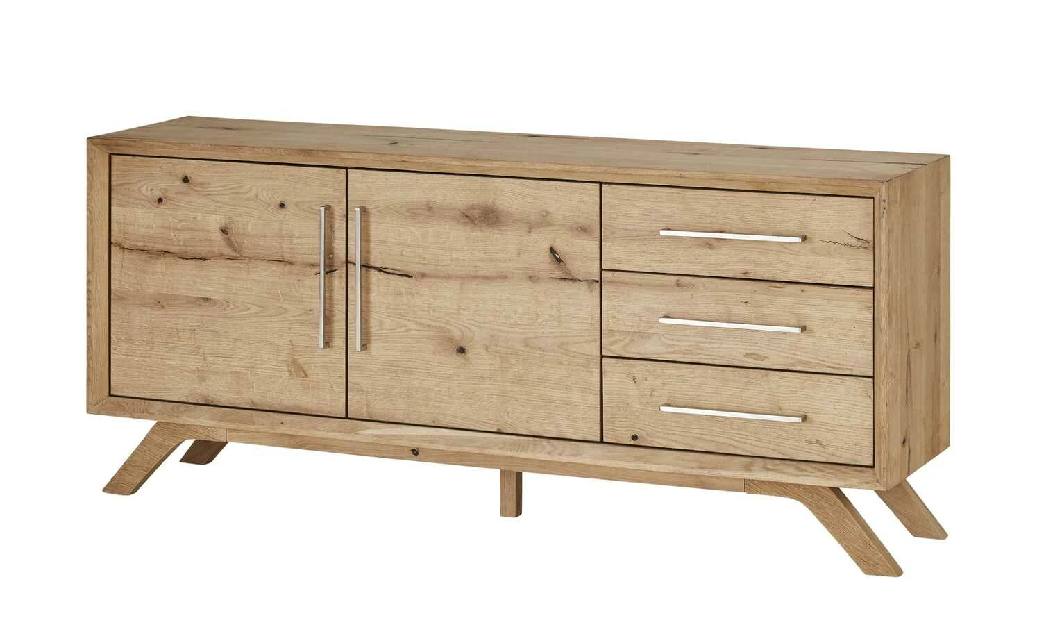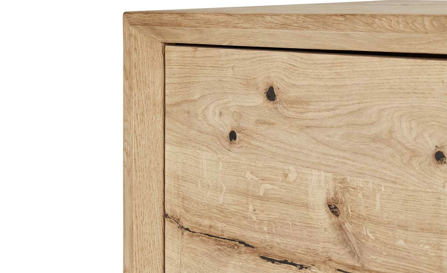 Natürlich und skandinavisch-modern wirkt das Sideboard Cap Ferrat One von der Marke Gray & Jones. Front und Korpus sind hochwertig furniert, für die Füße ist Massivholz verwendet worden. Das Eichenholz hat eine attraktive Maserung mit Asteinschlüssen als Eyecatcher. Die natürlichen Risse wurden schwarz verfüllt. Damit sie voll zur Geltung kommen, ist auf eine zusätzliche Oberflächenbehandlung verzichtet worden. Einziger Akzent: gebürstete Metallgriffe. Cap Ferrat One ist links mit zwei Türen und rechts mit drei Schubladen ausgestattet. Sie haben eine Soft-Close-Funktion und schließen geräuscharm.