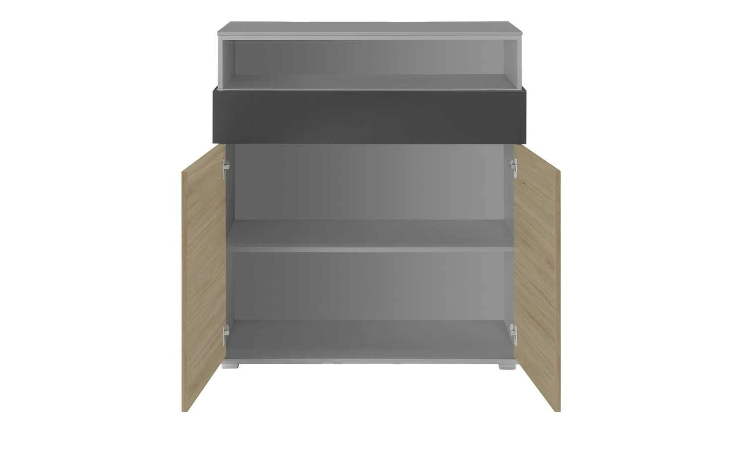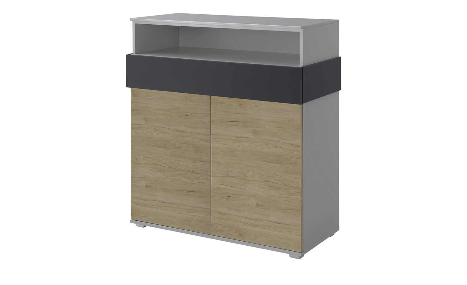 Holly ist ein stylisches Highboard für das Kinder- und Jugendzimmer. Sie können zwei Fächer hinter den beiden Türen und ein farblich abgesetztes Schubfach nutzen. Zusätzlich verfügt Holly über ein offenes Fach.