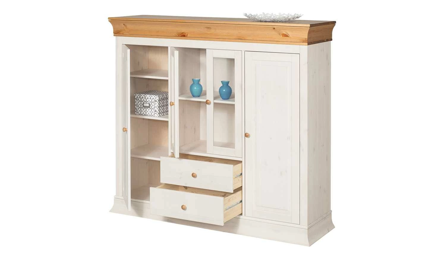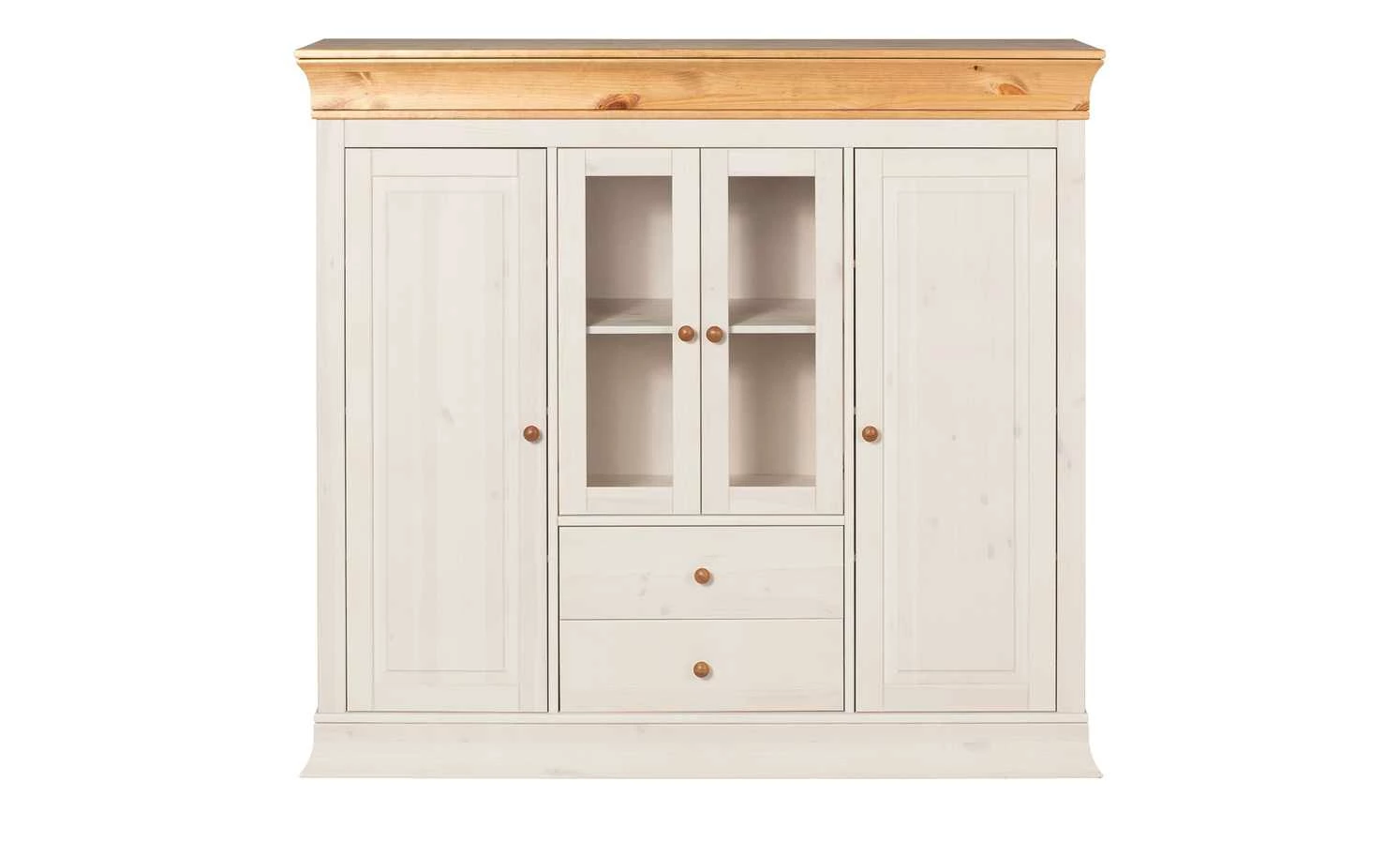 Dieses traditionelle, aus massiver Kiefer bestehende Highboard verleiht Ihrem Wohn- oder Esszimmer ein behagliches Landhaus-Ambiente. Es ist weiß gewachst und besitzt dekorative Absetzungen aus Kiefer mit einer Antik-Optik. An den Türen befinden sich sogenannte Kassettenfüllung, also eingefräste gradlinige Muster. Diese passen ideal zum leicht geschwungenen und eingefrästen Sockel und Kranz. Das Highboard ist nicht nur ein stilvoller Blickfang, sondern bietet hinter seinen vier Türen auch viel Stauraum für Geschirr. Im Herzstück des Highboards, der mittleren, zweitürigen Vitrine, können Sie besonders schönes Geschirr oder dekorative Wohnaccessoires geschmackvoll in Szene setzen.
