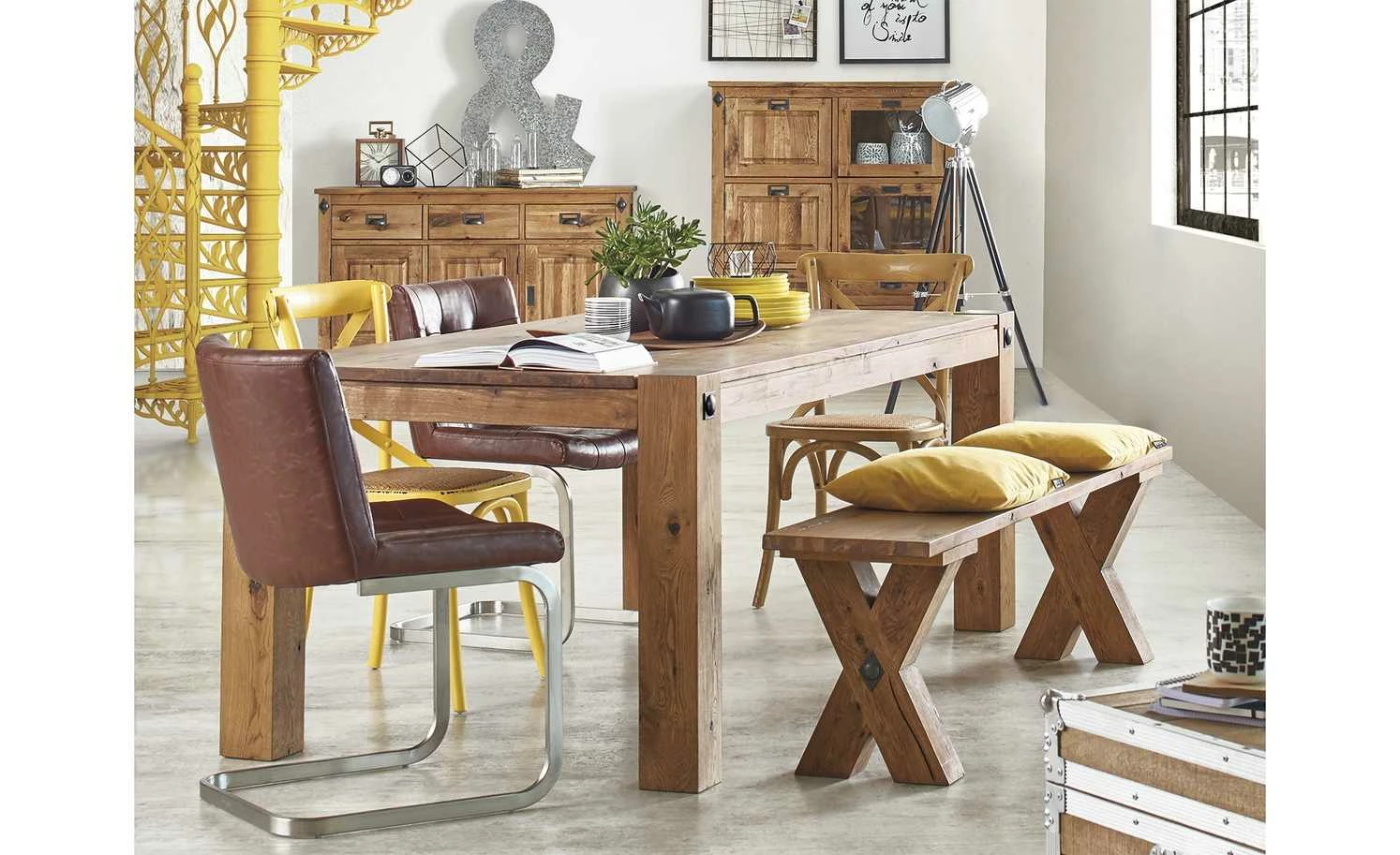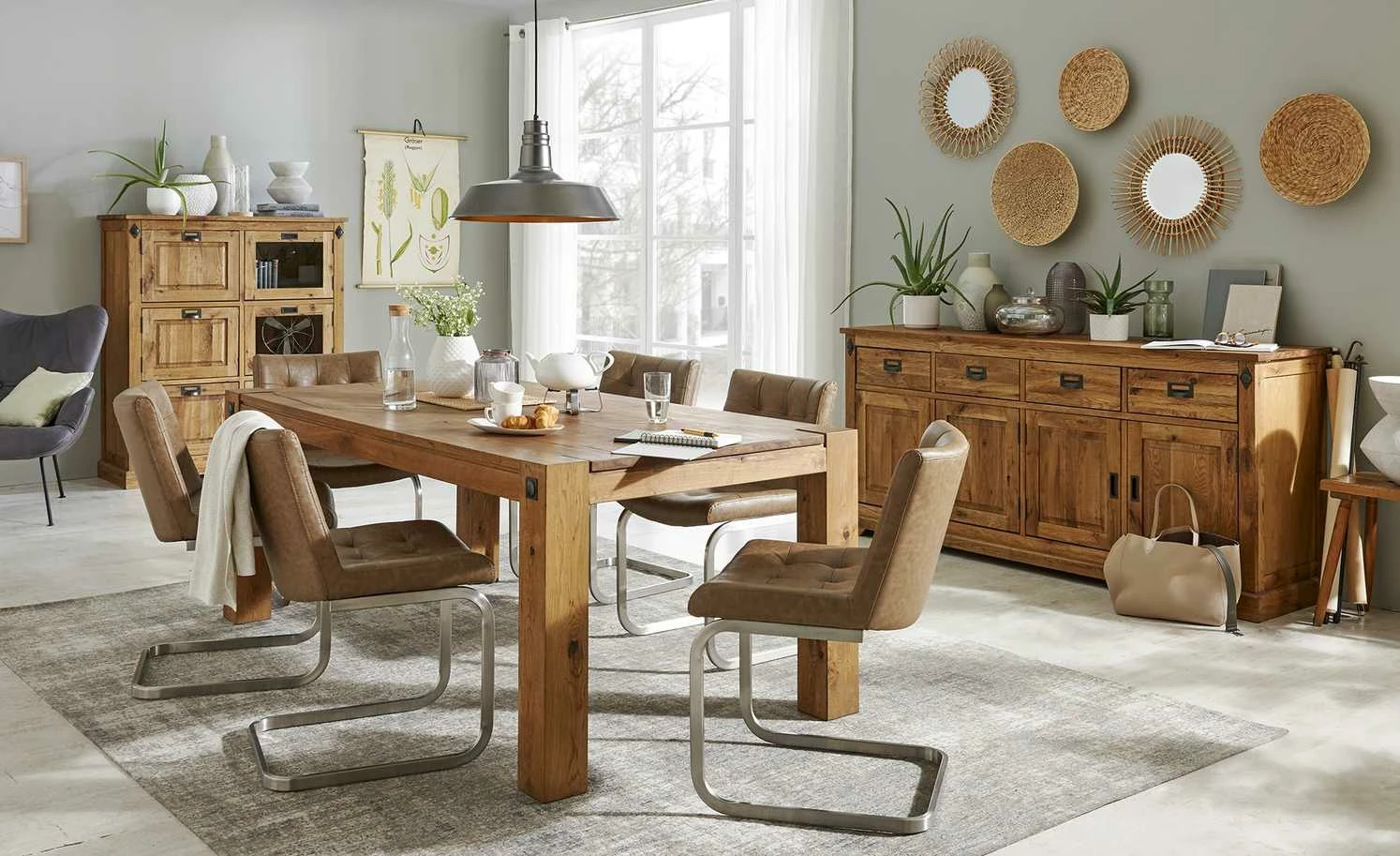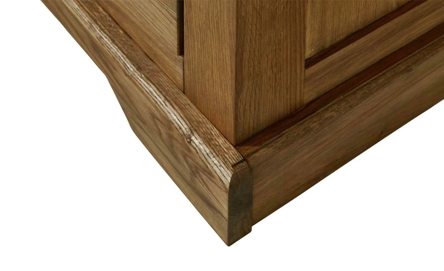 Der dunkle Holzton, die Eisenbeschläge und Verzierungen prägen den Vintage- und Kolonial-Stil des Highboards Freddy. Freddy ist teilmassiv. Das bedeutet, dass die Fronten, der Rahmen und die Abdeckplatte aus Eichenmassivholz sind. Der Korpus und die Böden sind hochwertig furniert. Um den einheitlichen Look zu erhalten, wurde auch dort Eichenholz genutzt. Zum Schutz des Holzes wurde es geölt. Gleichzeit ist dadurch ein ansprechender Antik-Look entstanden. In den beiden Vitrinen-Fächern mit Glastür können Sie edles Geschirr aufbewahren. Drei weitere Fächer und zwei Schübe bieten weitere Staumöglichkeiten.