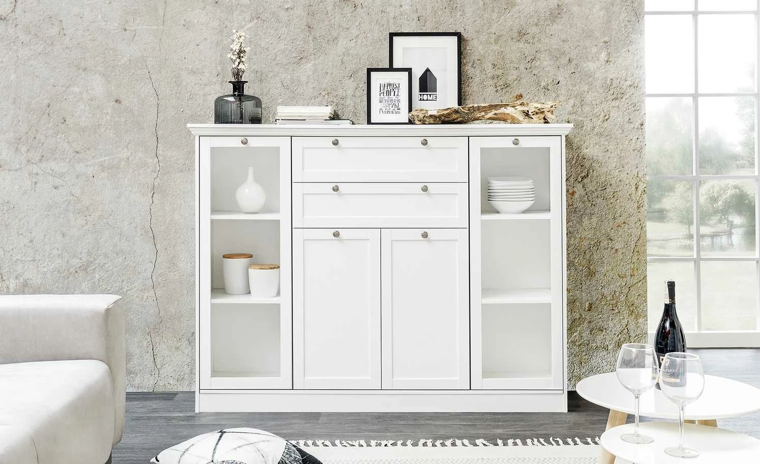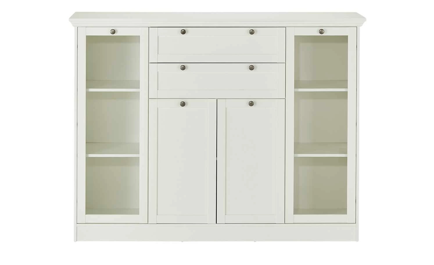 Im Highboard Laurito können Sie Lieblingsstücke präsentieren. Das geht in den je drei seitlichen Vitrinenfächern. Die Türen vor den Fächern sind mit Klarglas abgesetzt, was einen freien Blick in die Fächer erlaubt. Weitere Staumöglichkeiten befinden sich in den beiden Schubladen und hinter den beiden mittigen Türen. Das Material macht Oberflächen unempfindlich. Staub lässt sich ganz leicht wegwischen. Laurito ist im Landhausstil designt und passt zu den anderen Modellen der Serie.