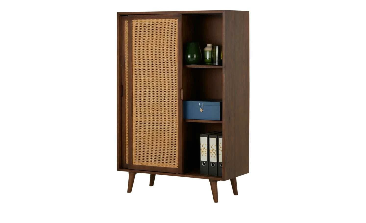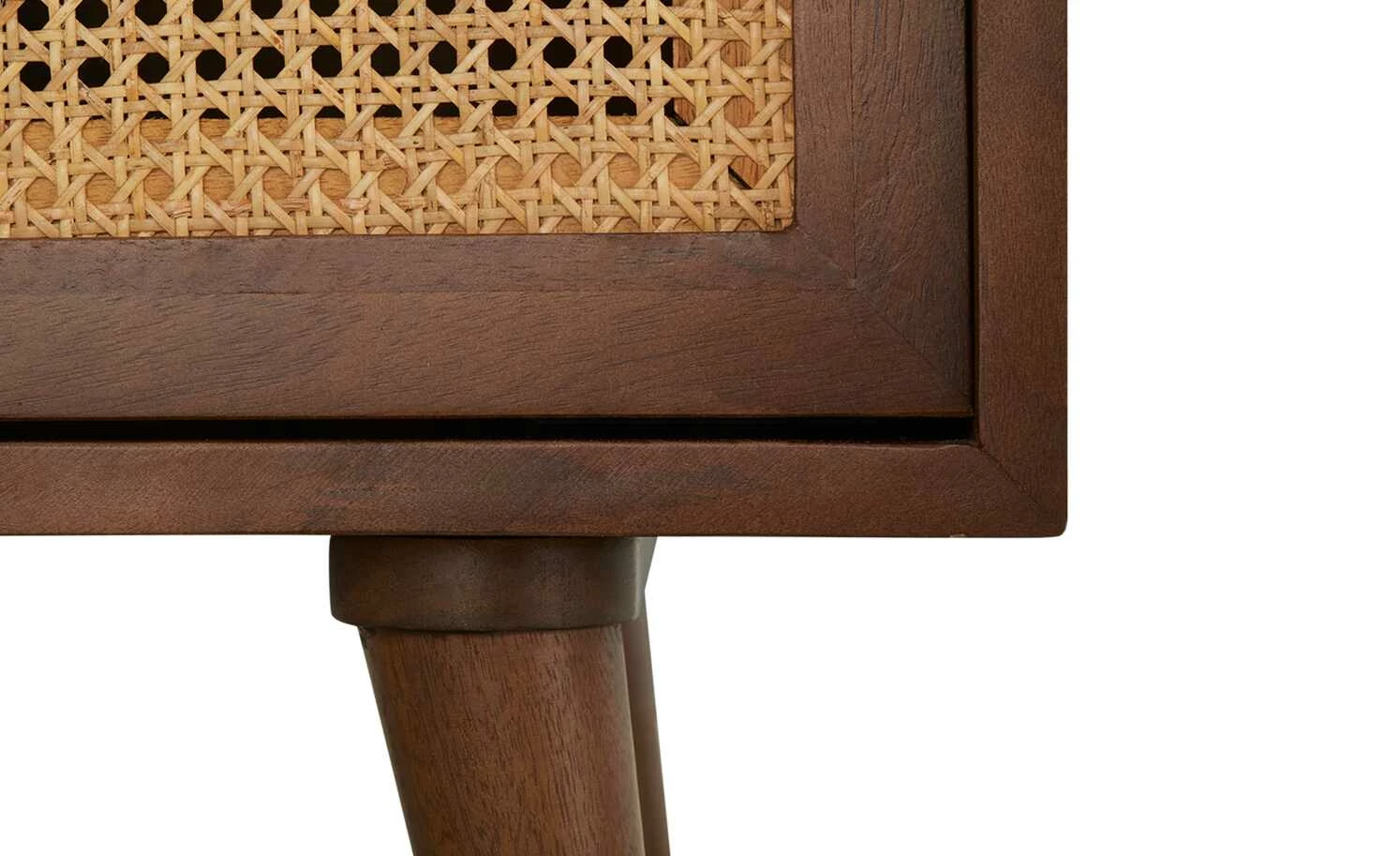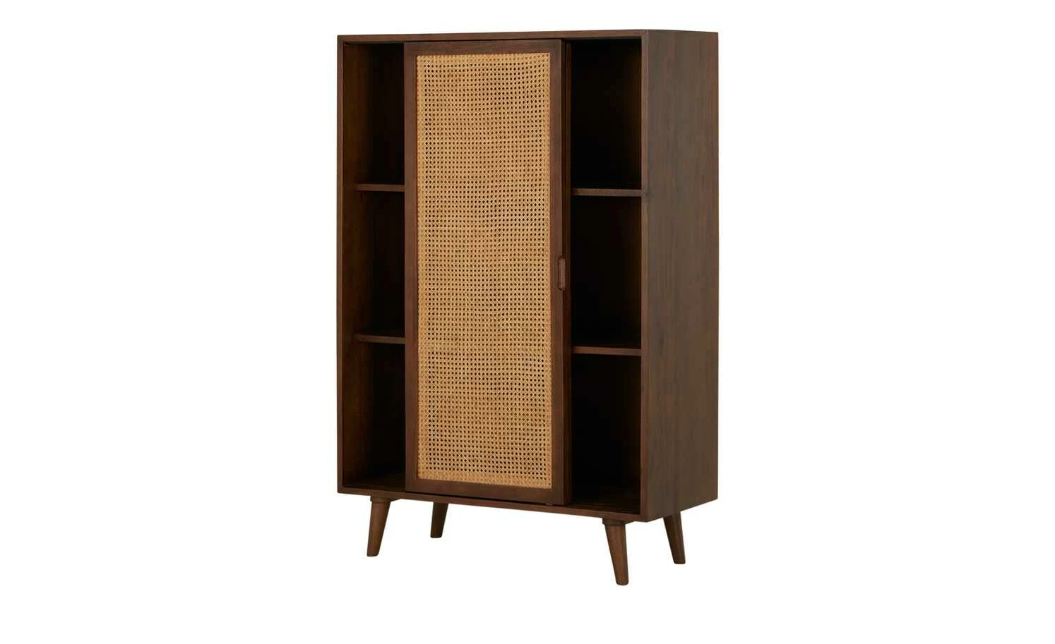 Die Serie Tweed Me entführt Sie in längst vergangene Zeiten und bringt Wiener Eleganz in Ihre vier Wände. So auch das Highboard aus dunklem Mango-Massivholz, welches für den Korpus und die Füße genutzt wurde. Farblicher Kontrast zu dem schön gemaserten Holz sind die beiden Schrankfronten. Diese wurden aus natürlichem Rattan zu einem edlen Achteck-Muster geflochten, welches auch als Wiener Geflecht bekannt ist. Die vier konischen, schräg zulaufenden Massivholzfüße runden das Gesamterscheinungsbild gekonnt ab.