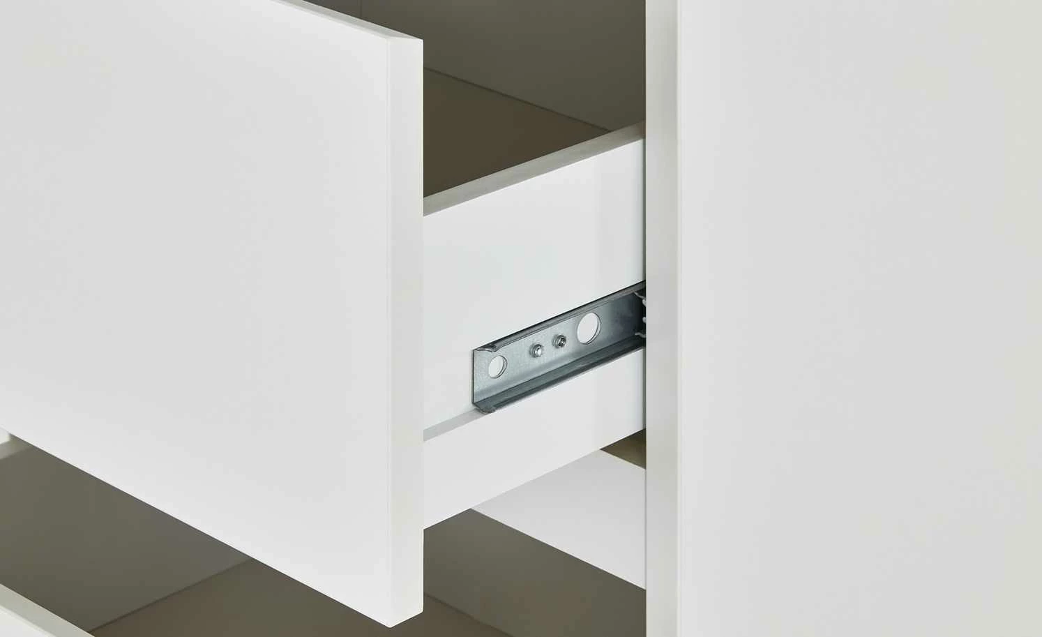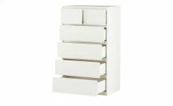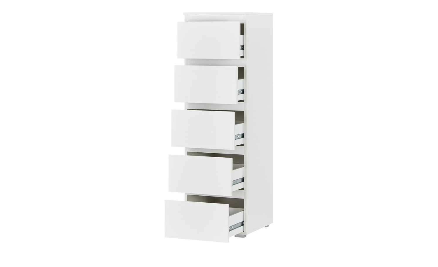 Die Hochkommode Tarent ist mit fünf Schubladen ausgestattet, die übereinander angeordnet sind. Jede Schublade nimmt die gesamte Breite der Kommode ein. Korpus und Front haben eine folierte Oberfläche, die unempfindlich und leicht zu pflegen ist. Der Weißton der Oberflächen harmoniert mit dem reduzierten, geradlinigen Gesamtdesign.