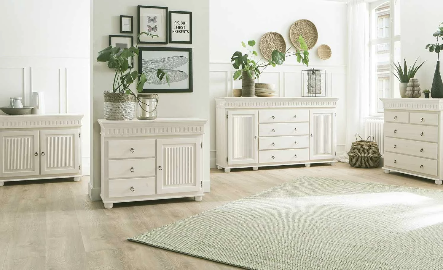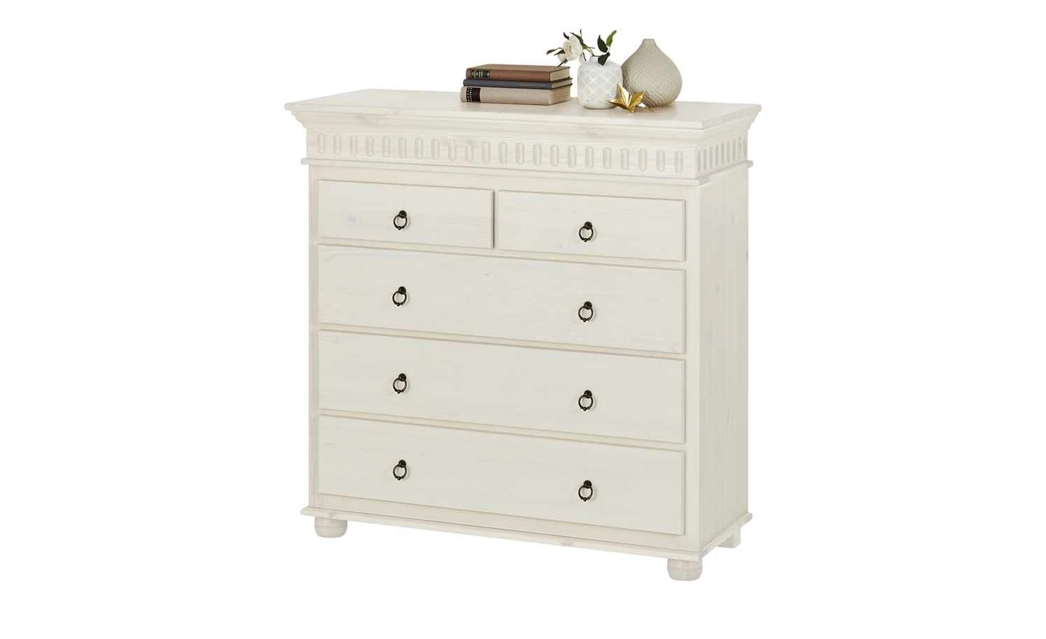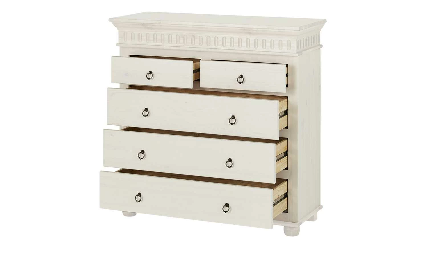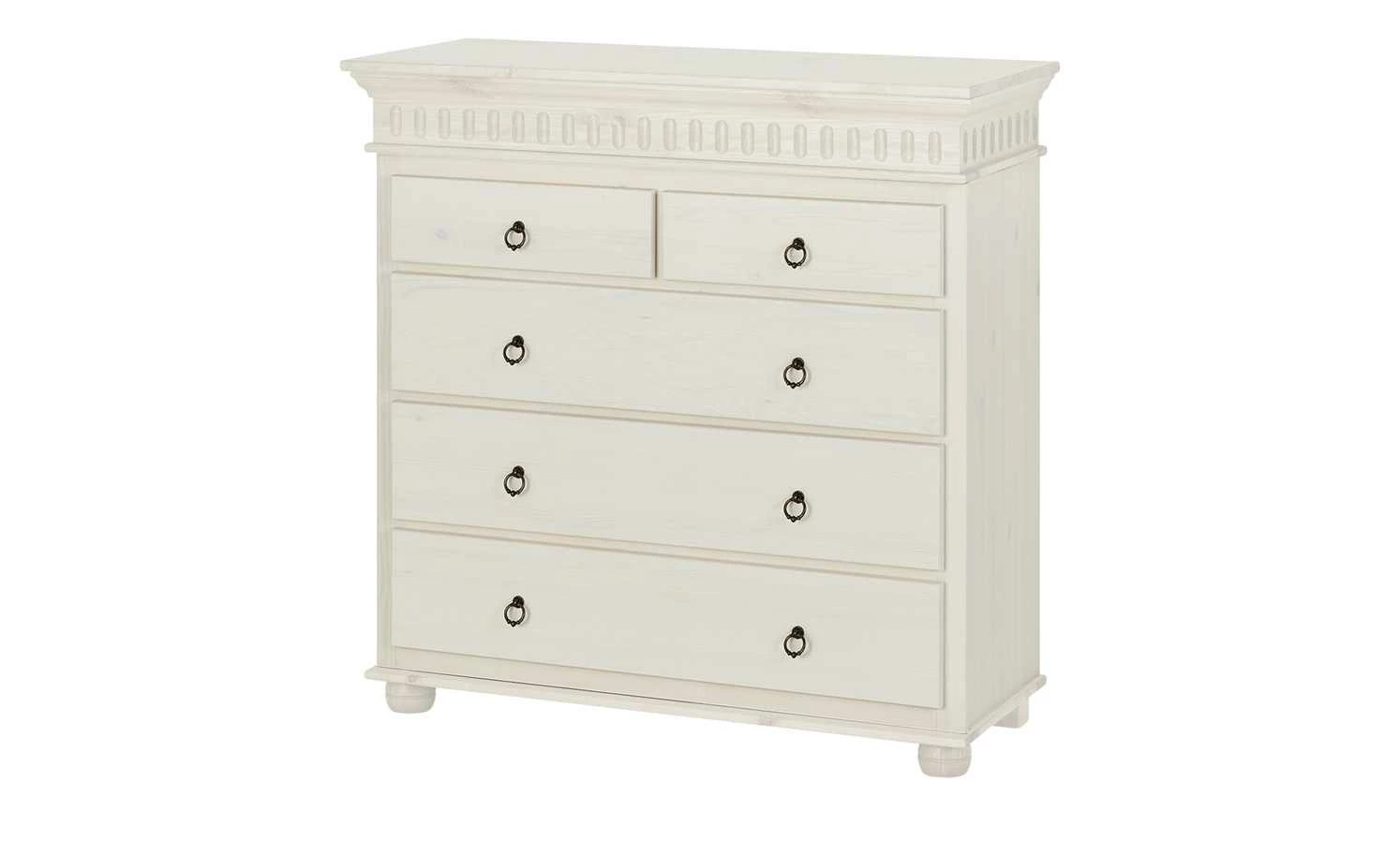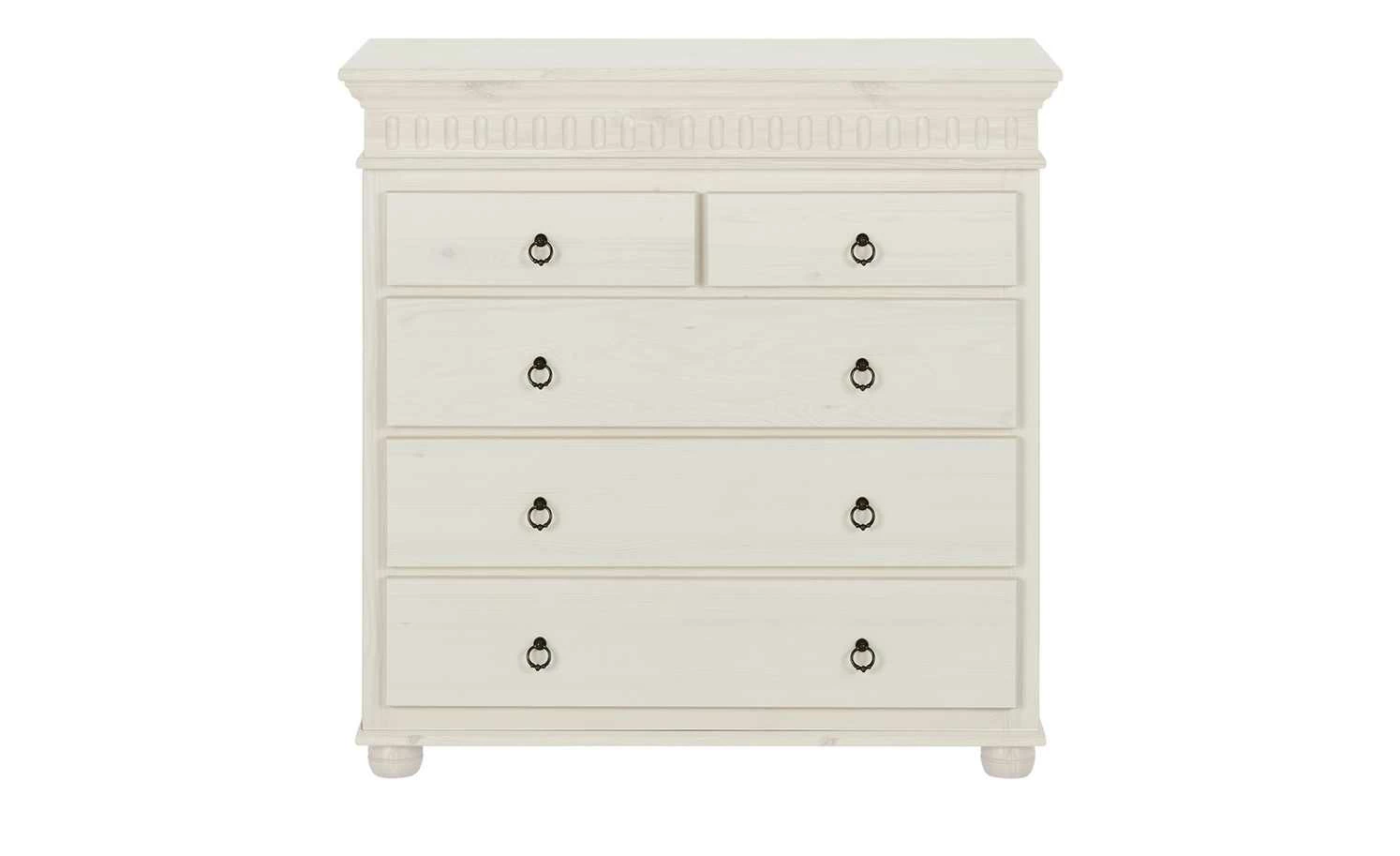 Der rustikale Landhausstil der Kommode Bornholm bringt Gemütlichkeit in jeden Raum. Sie können Bornholm alleine nutzen oder mit den anderen Möbeln der Serie kombinieren. Bornholm ist aus massivem Kiefernholz gefertigt. Es ist stabil und langlebig. Alle Oberflächen sind gewachst worden, wobei die holztypische Maserung dennoch wunderbar zu erkennen ist. Dekorative Griffe ergänzen den Gesamtlook der Kommode wunderbar. Bornholm verfügt über Stauraum in fünf Schubladen – zwei kleineren und drei größeren.