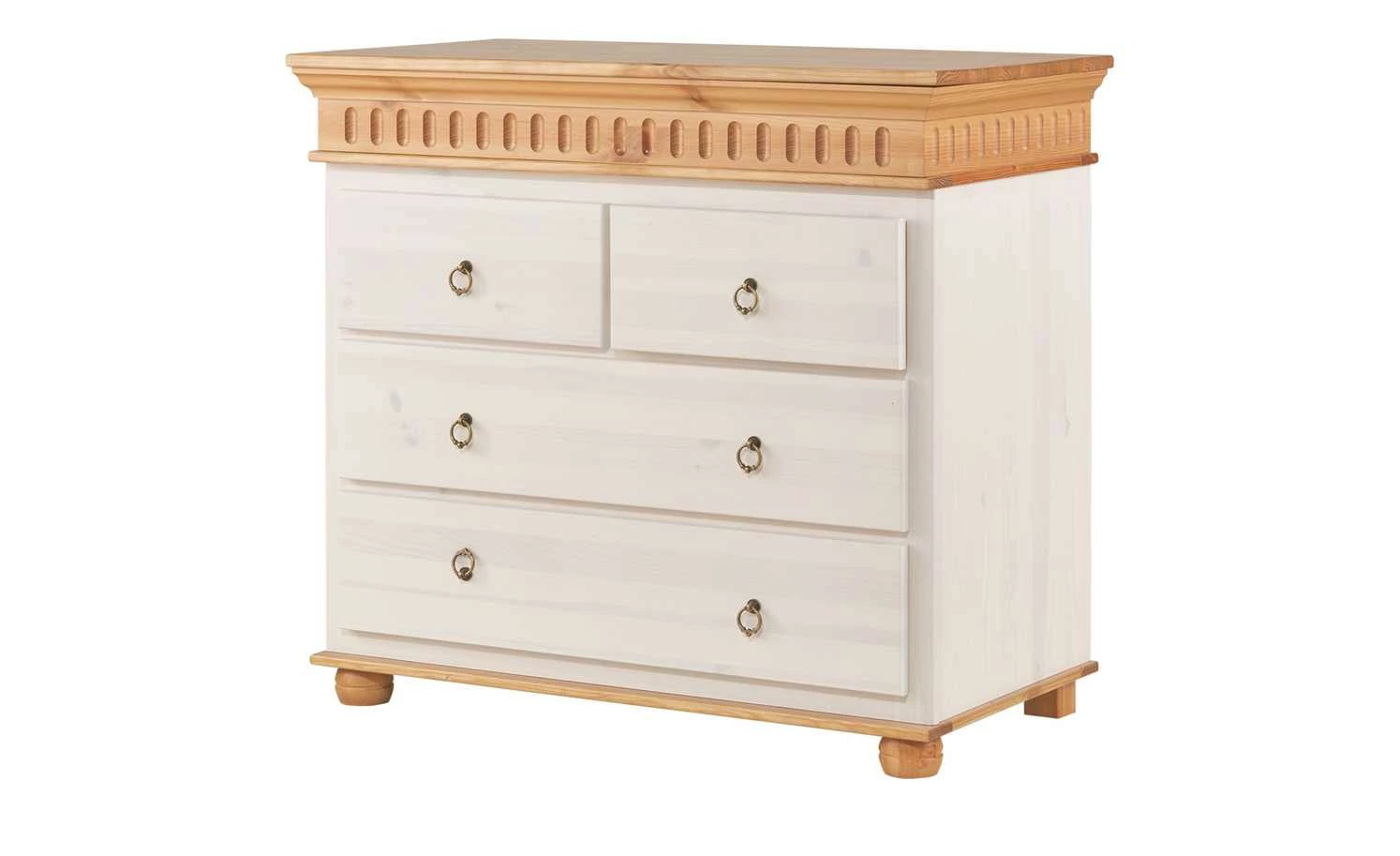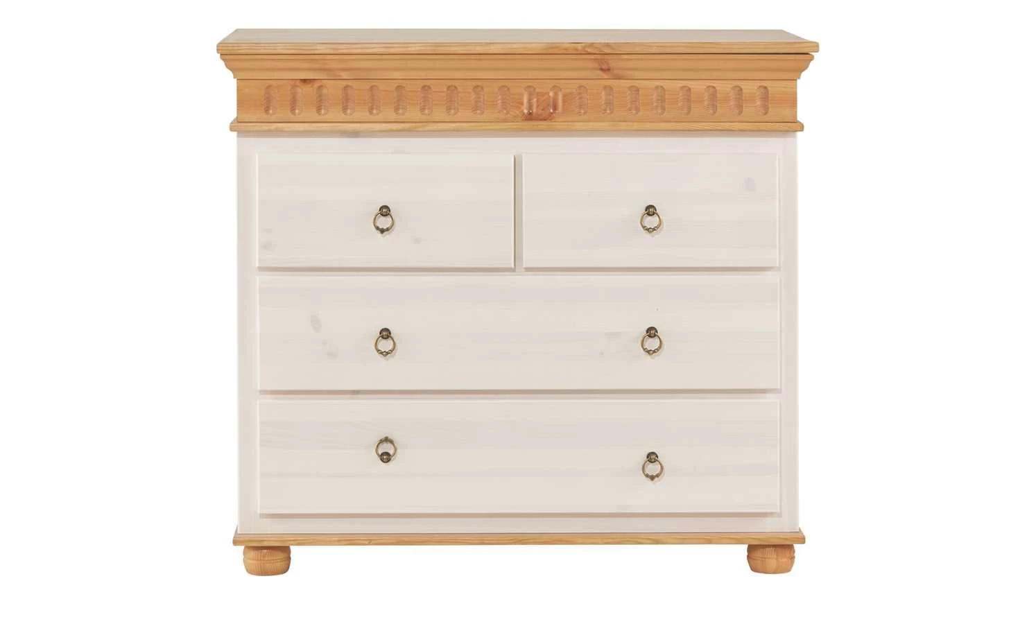 Die Kommode Bornholm ergänzt den Landhausstil ebenso wie eine nostalgische Wohneinrichtung im Vintage-Chic. Das Möbelstück wurde in zwei Farbtönen gestaltet: Die Ober- und die Bodenplatte mit Füßen in natürlichen Holztönen setzen sich farblich schön vom weißen Korpus und der weißen Front ab. Vier rundliche Füße und eine Bodenplatte tragen die Kommode mit vier Schubladen, die jeweils mit runden Zug-Griffen im Used-Look ausgestattet sind. Zwei breite Schubladen sind übereinander arrangiert, darüber befinden sich zwei kleinere Schübe. Die formschön gestaltete Oberplatte macht die Kommode zu einem Blickfang in jedem Zimmer. Durch die Verarbeitung von massiver Kiefer ist Bornholm stabil, robust und langlebig.