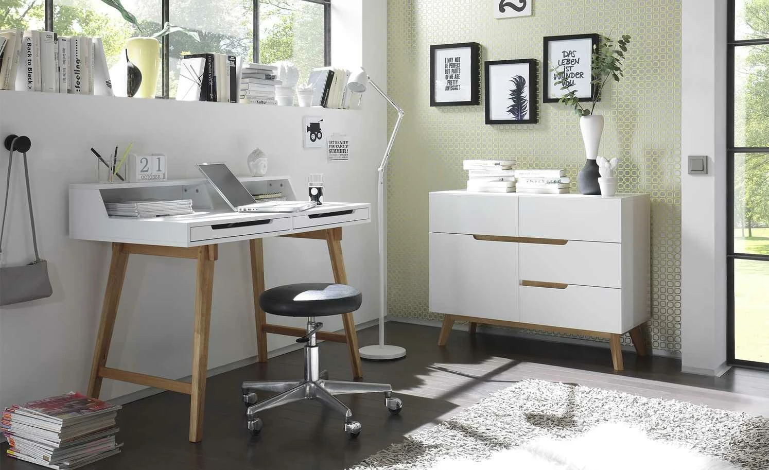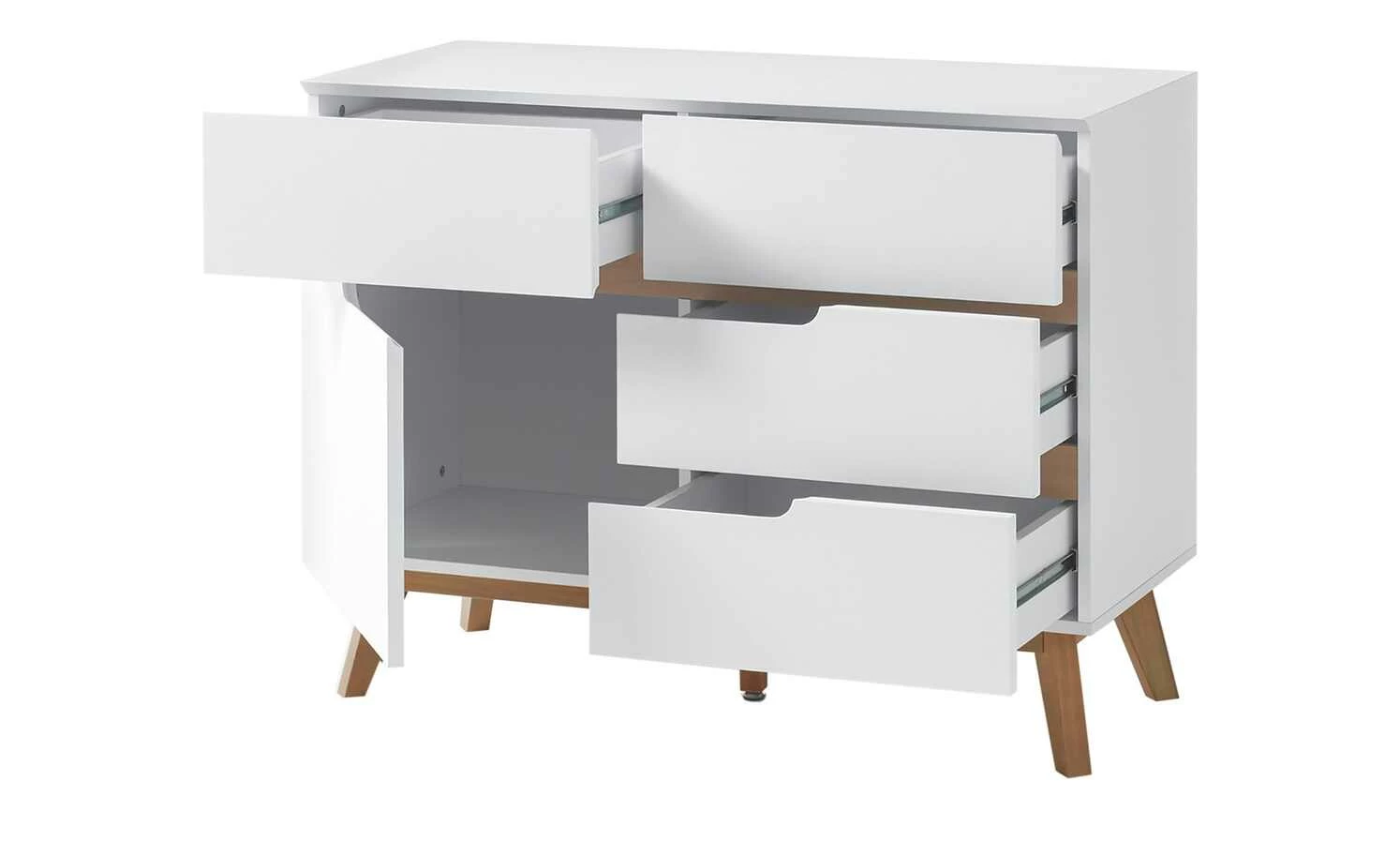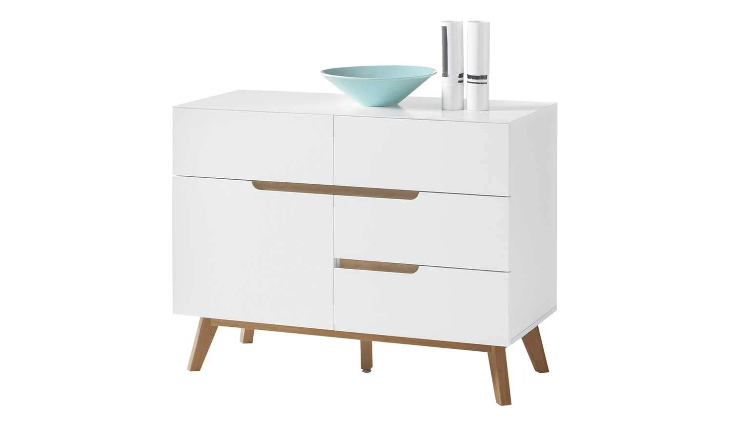 Der Scandi-Chic ist frisch und modern, gleichzeitig aber auch elegant. Das sehen Sie auch bei der Kommode Casoria. Die weiß lackierten Flächen werden mit natürlichen Akzenten kombiniert. So sind die Frontblenden aus Asteichenfurnier und das Gestell mit Retrocharme aus massiver Eiche gefertigt. Casoria ist auch praktisch: In den vier Schubladen und beiden Fächern mit Tür ist viel Platz. Hier können Sie vielerlei Dinge unterbringen.