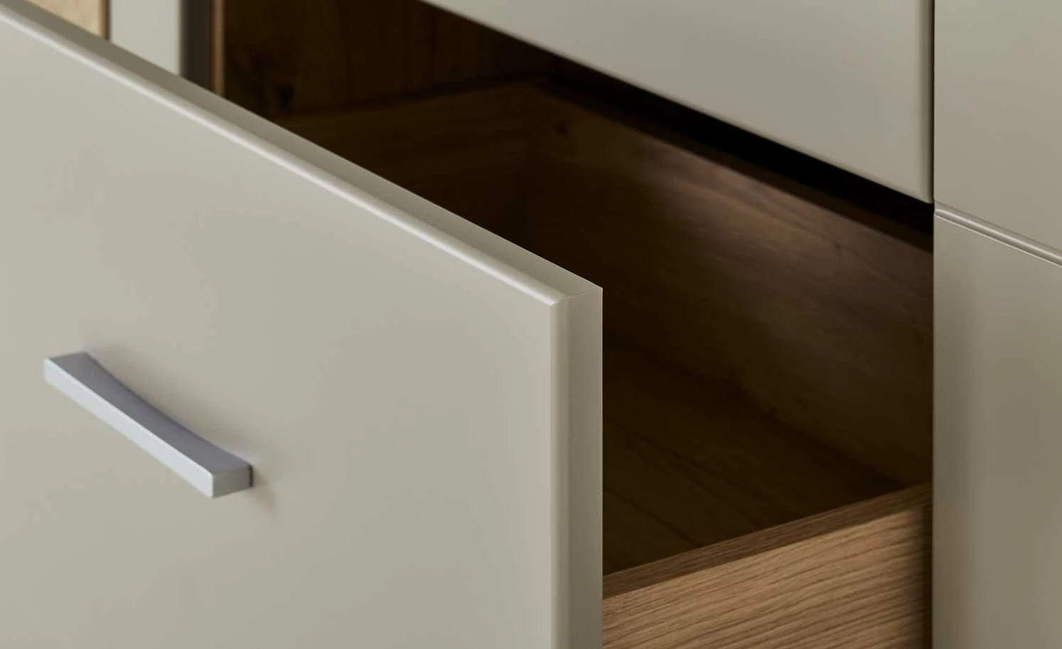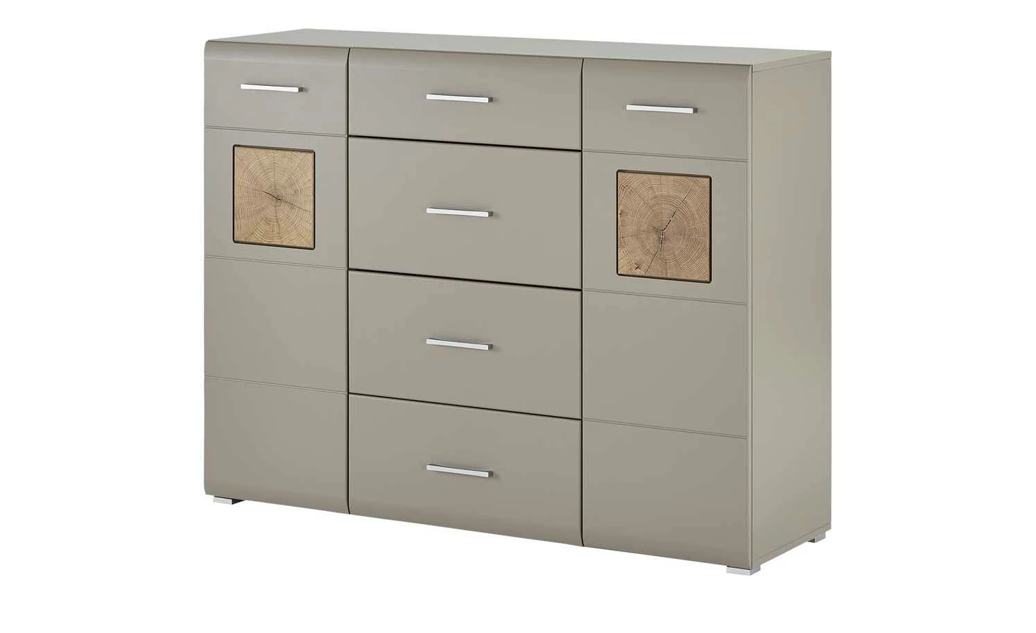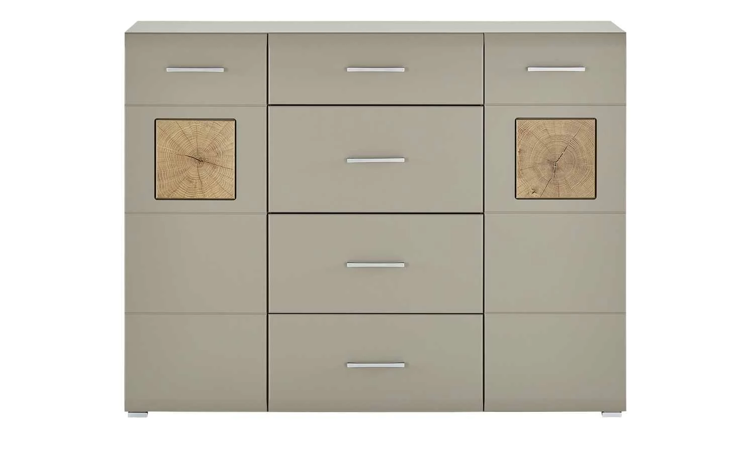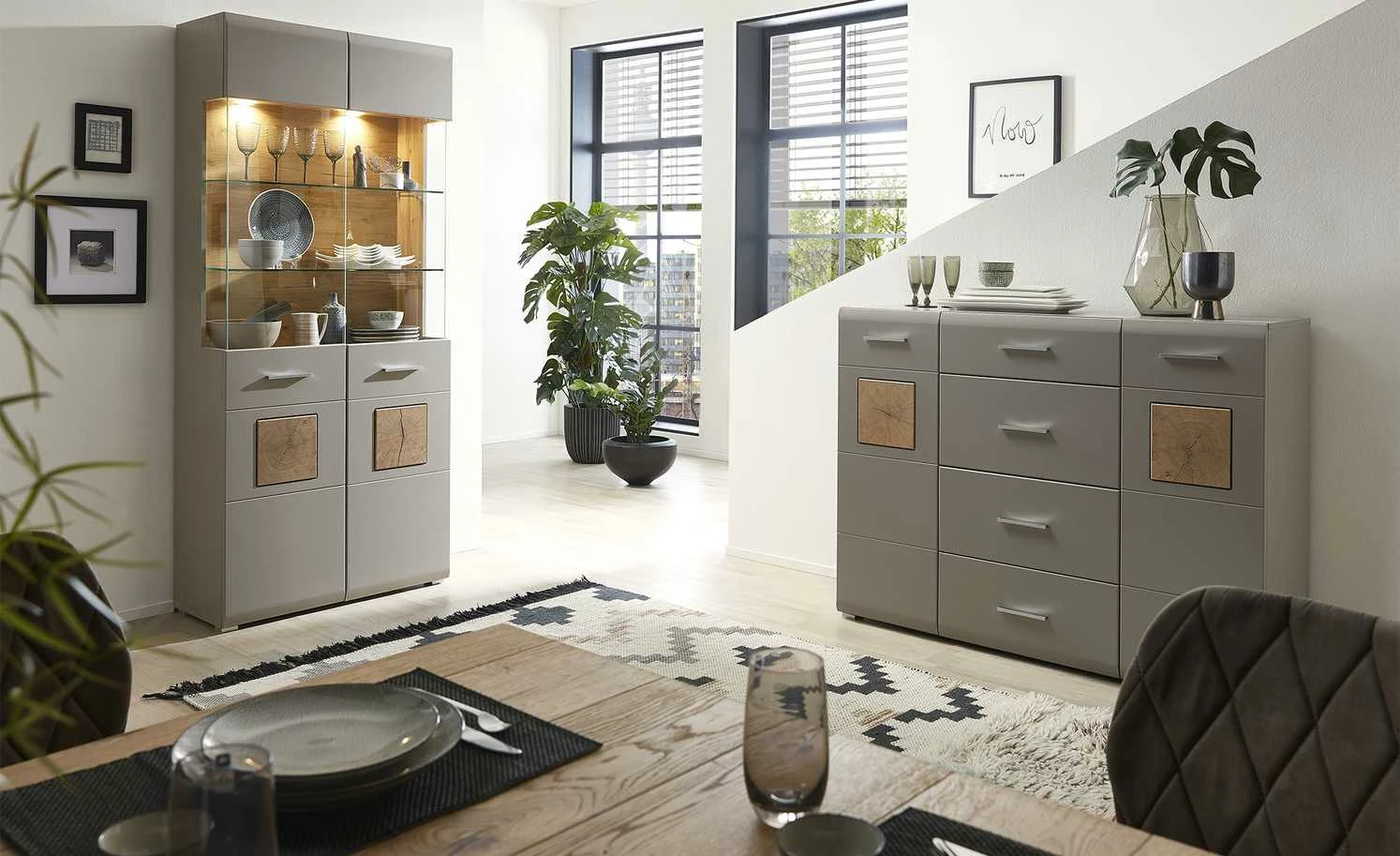 Die Kommode Cortina hat einen modernen Look mit eleganter Note. Front und Korpus sind in Basaltgrau designt. Als natürlicher Kontrast dienen die beiden Frontabsetzung links und rechts auf der Tür. Sie haben eine interessante Hirnholzoptik mit Jahresringen und angedeuteten Rissen. Das Innere der Kommode setzt sich in Eiche Altholz (Nachbildung) ab. Innen ist die Kommode aber auch praktisch: Hinter beiden Türen stehen Ihnen jeweils vier Fächer zur Verfügung, die Böden dazwischen sind höhenverstellbar. Mittig hat Cortina insgesamt vier praktische Schubladen: drei größere und eine etwas kleinere.