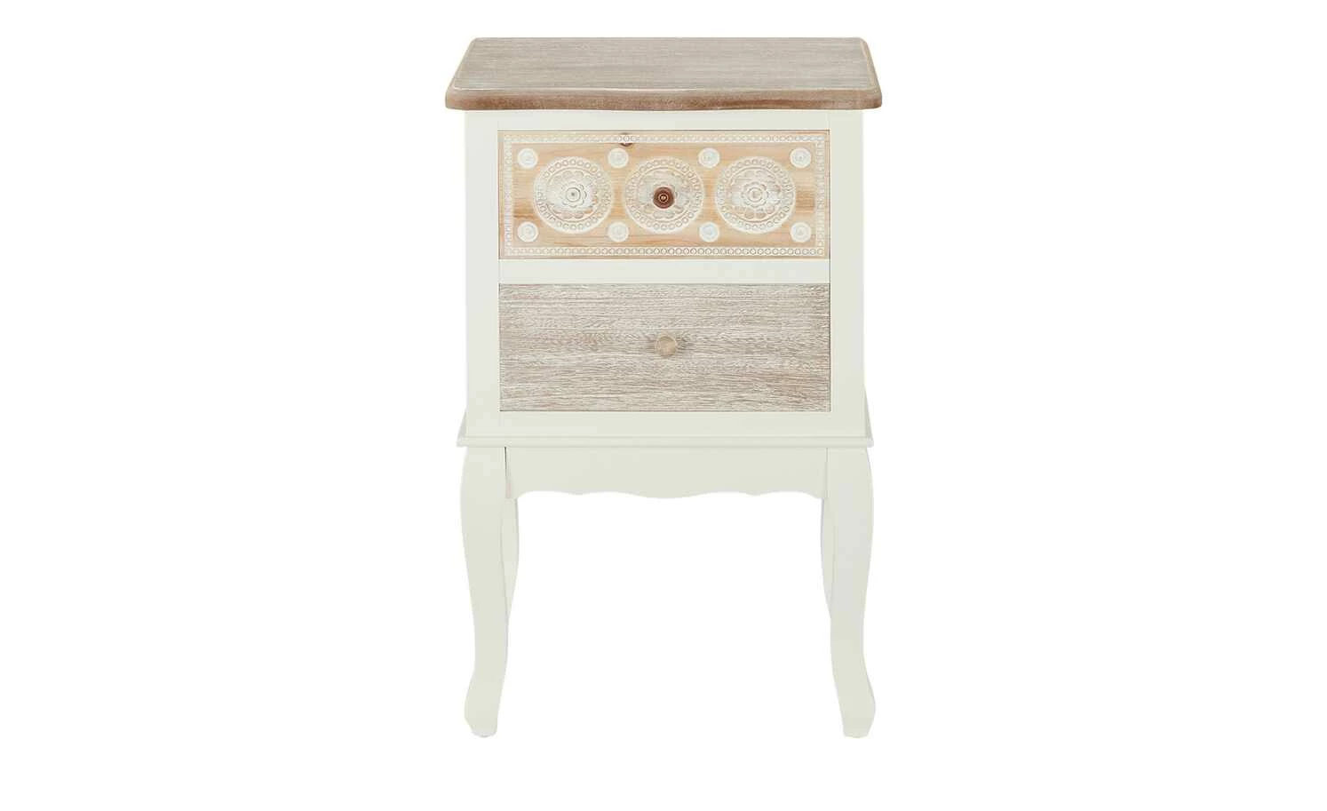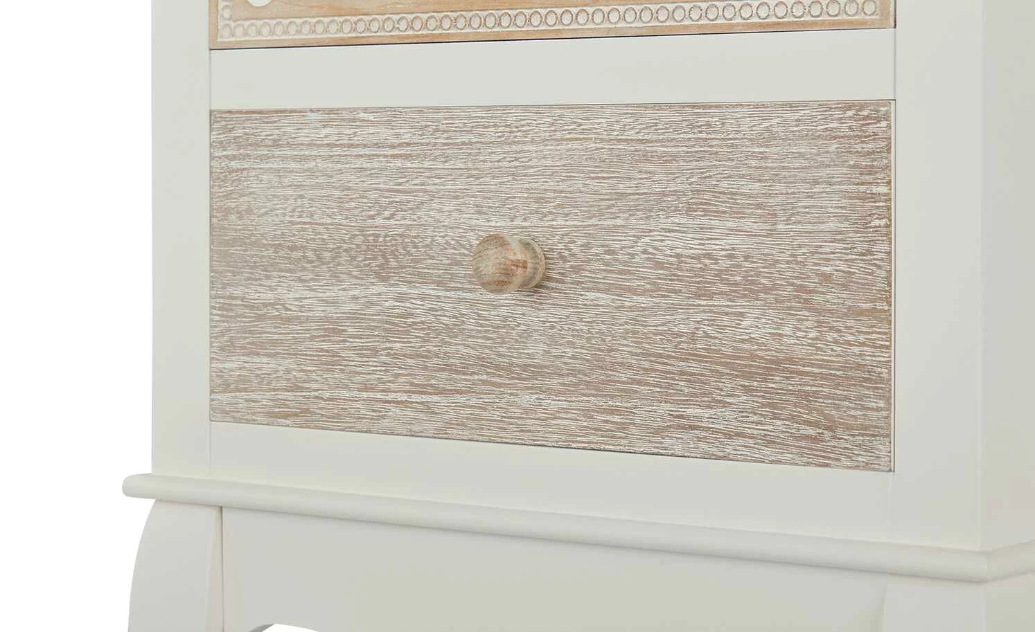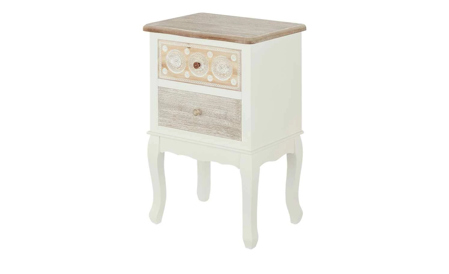 Die Kommode Foggia ist hübsch anzusehen und praktisch. Korpus und Füße sind weiß lackiert und werden durch natürliche Echtholzakzente abgesetzt. Die gebogenen Füße und die obere Schubladenfront mit ihren filigranen Schnitzereien bestehen aus massivem Kiefernholz. Die Abdeckplatte und das zweite Schubfach sind dagegen mit robustem Paulownia-Holz furniert. Die Kommode Foggia bietet Stauraum in zwei Schubladen.