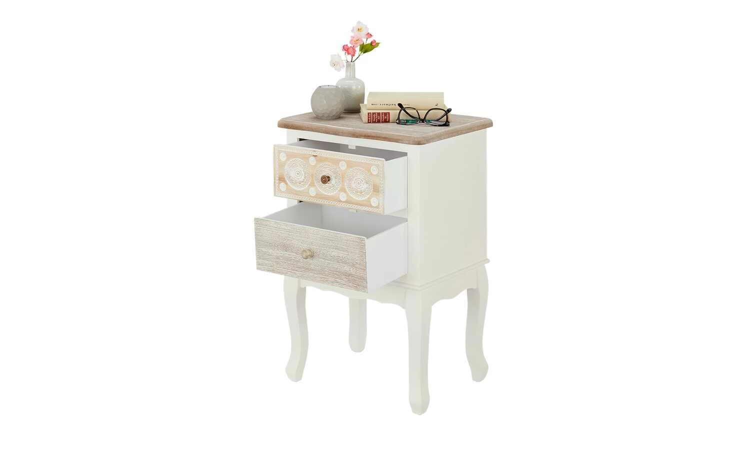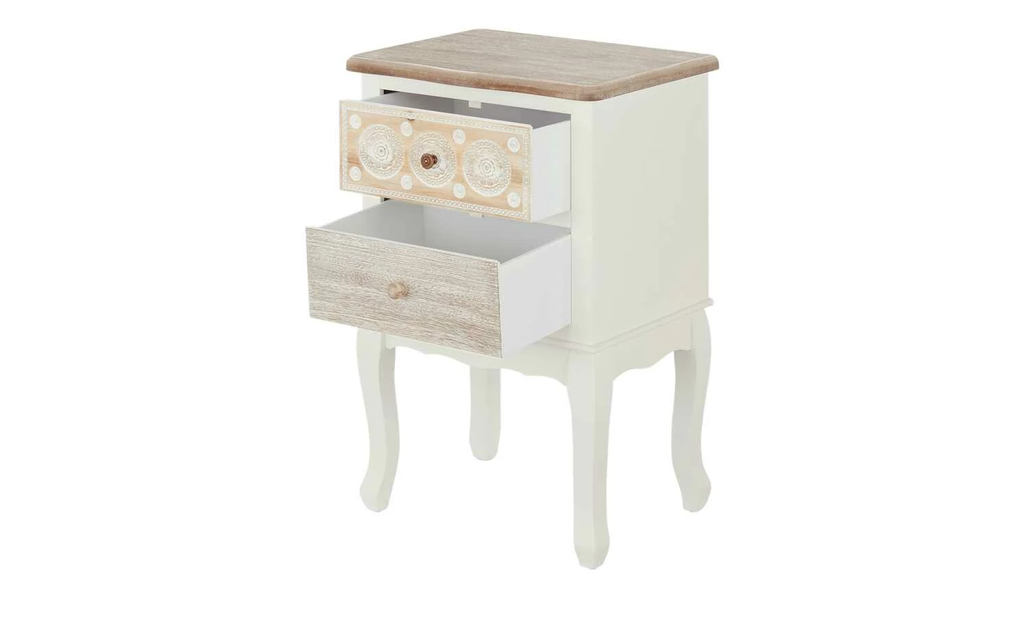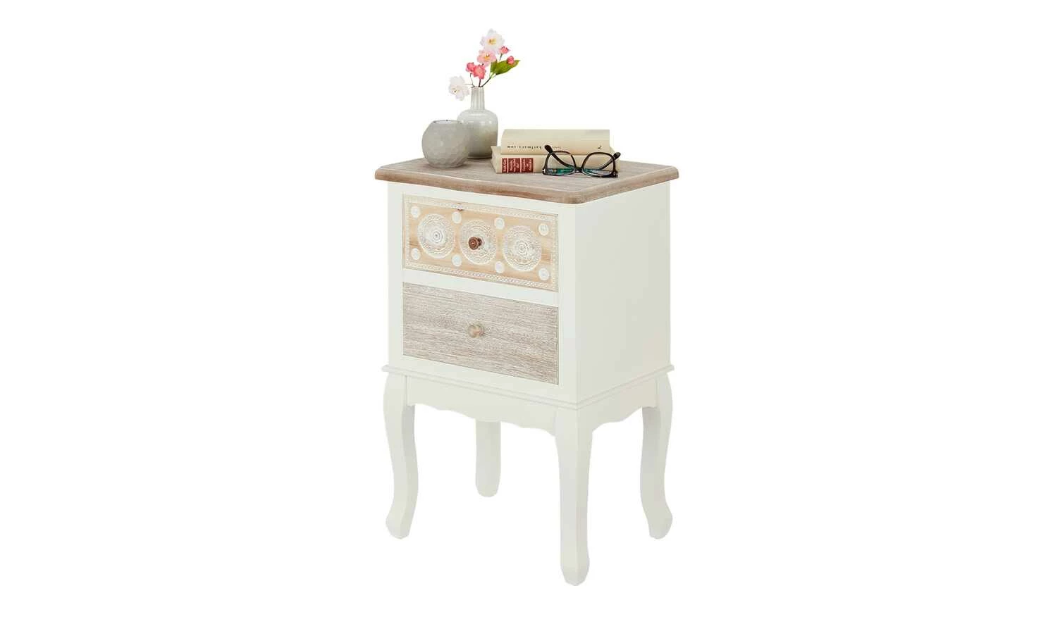 Die Kommode Foggia ist hübsch anzusehen und praktisch. Korpus und Füße sind weiß lackiert und werden durch natürliche Echtholzakzente abgesetzt. Die gebogenen Füße und die obere Schubladenfront mit ihren filigranen Schnitzereien bestehen aus massivem Kiefernholz. Die Abdeckplatte und das zweite Schubfach sind dagegen mit robustem Paulownia-Holz furniert. Die Kommode Foggia bietet Stauraum in zwei Schubladen.
