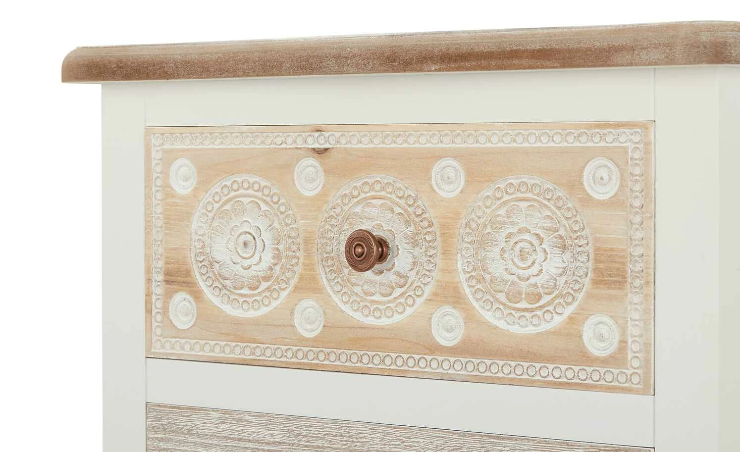 - Ausführung: Front mit verschiedenen Schnitzereien, antikweiß lackiert