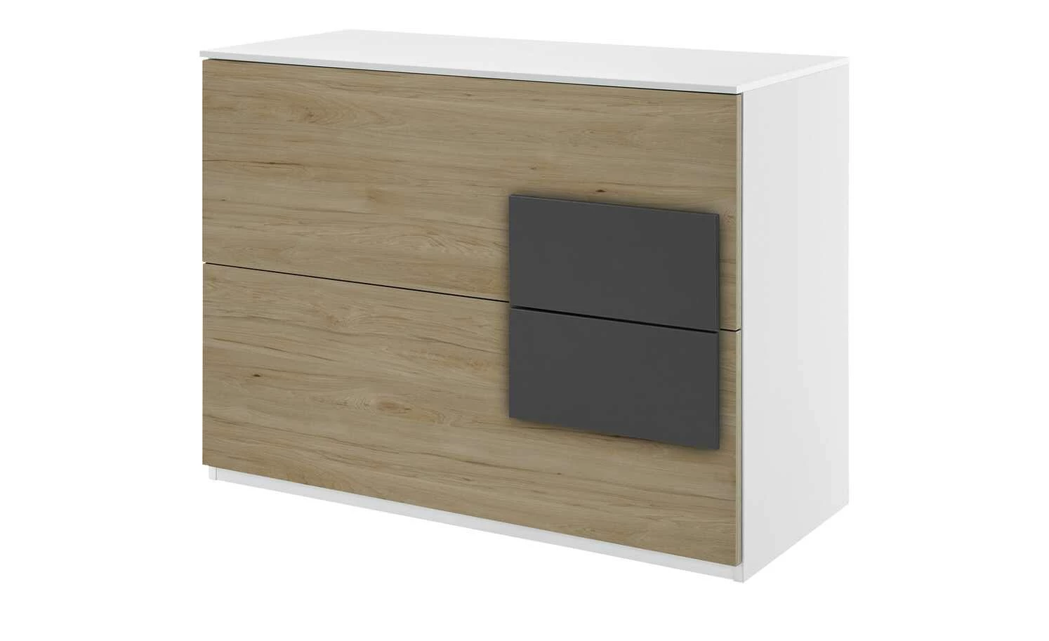 Die Kommode Holly ist mit zwei großen Schubkästen ausgestattet. Diese erstrecken sich über die gesamte Breite der Kommode und sind übereinander angeordnet. Die rechteckigen Griffe sind seitlich befestigt und setzen sich farblich ab. Die beiden Griff-Rechtecke ergeben ein Quadrat. Korpus und Front sind dank der Melaminbeschichtung strapazierfähig und pflegeleicht.