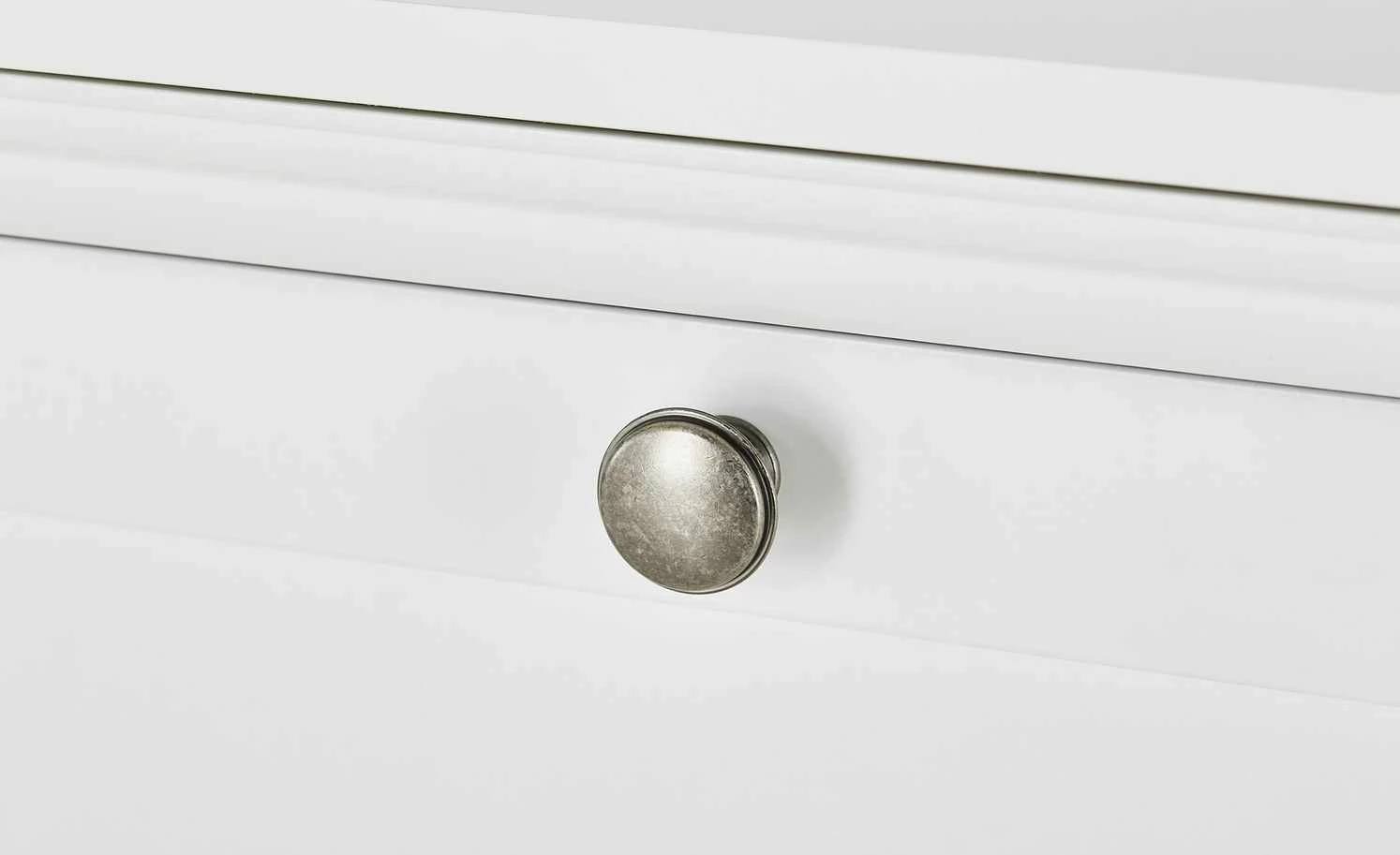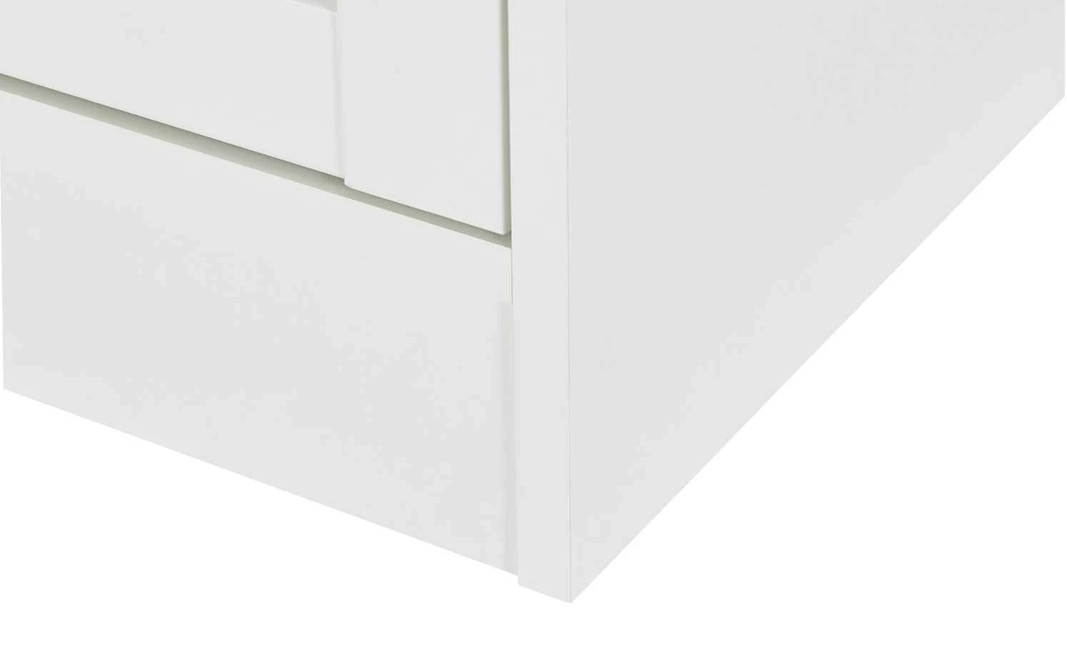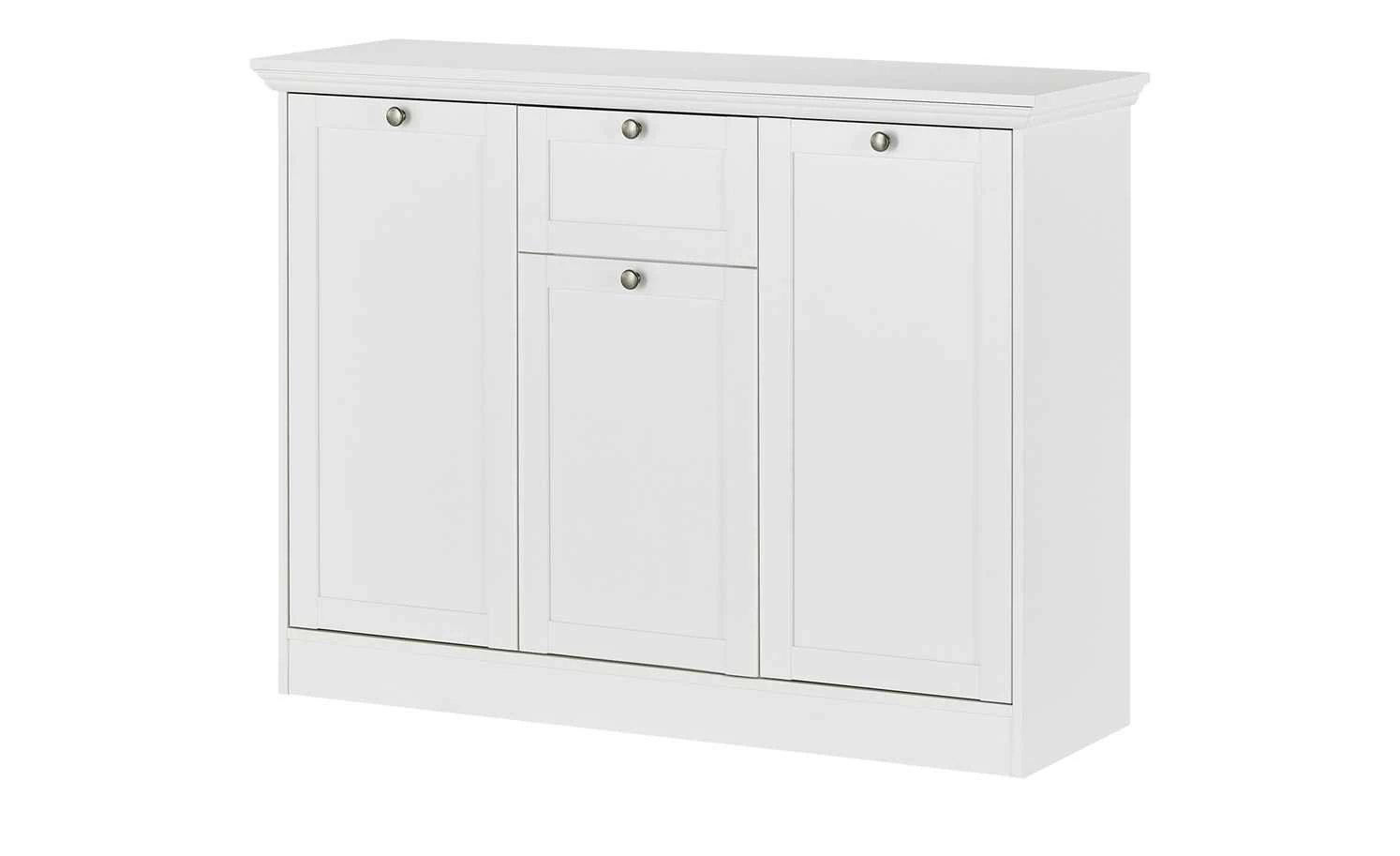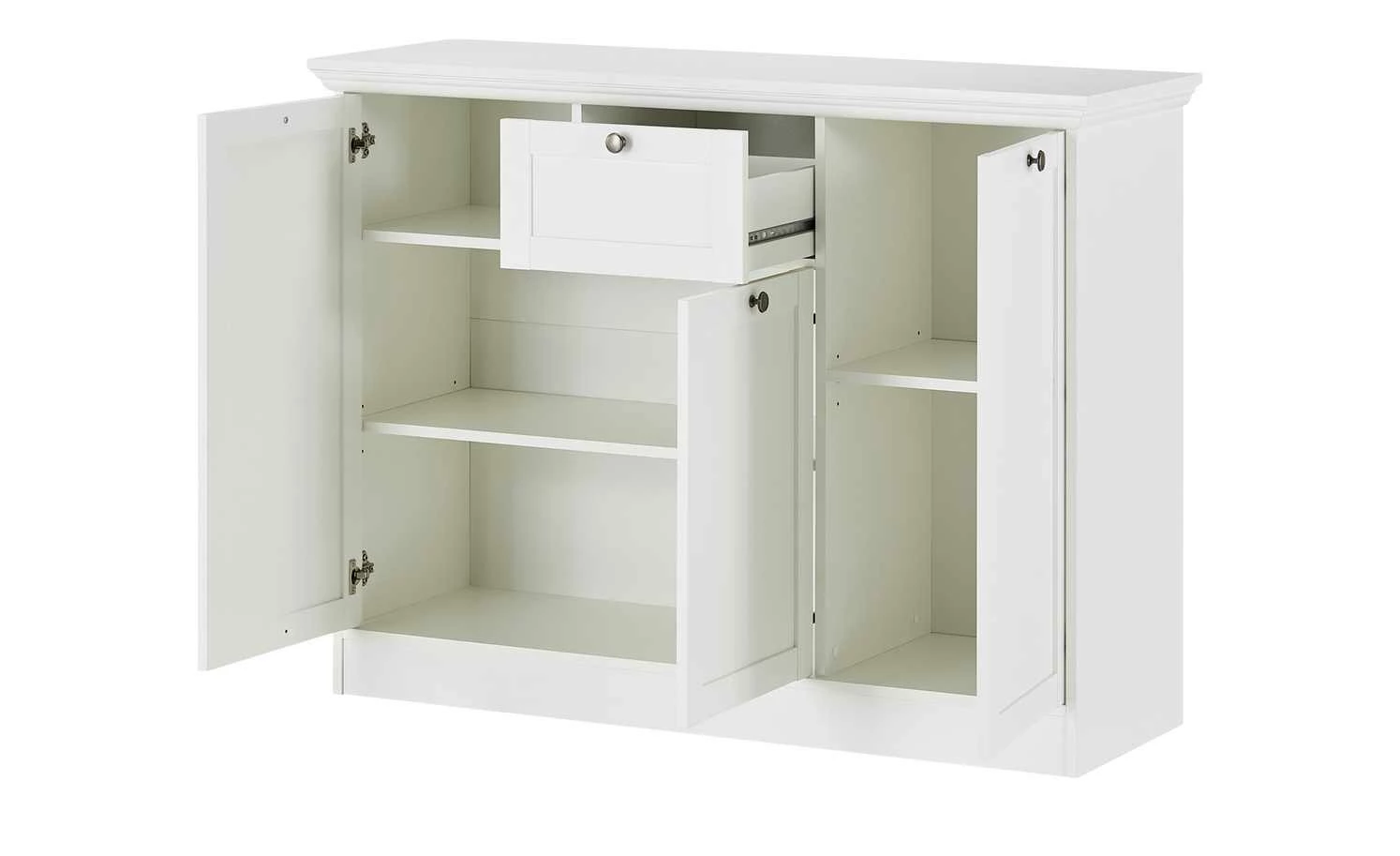 Die Kommode Laurito punktet mit ihrem hübschen Landhauscharme, der reduziert und elegant wirkt. Die feinen Linien werden mit einem strahlenden Weißton kombiniert. Metallgriffe im Vintagedesign setzen punktuelle Akzente – und sind natürlich auch praktisch. Laurito verfügt nämlich über drei Türen. Dahinter finden Sie fünfgeräumige Fächer mit höhenverstellbaren Einlegeböden. Zusätzlich steht Ihnen eine Schublade zur Verfügung. Die Oberflächen sind beschichtet, was sie strapazierfähig und pflegeleicht macht.