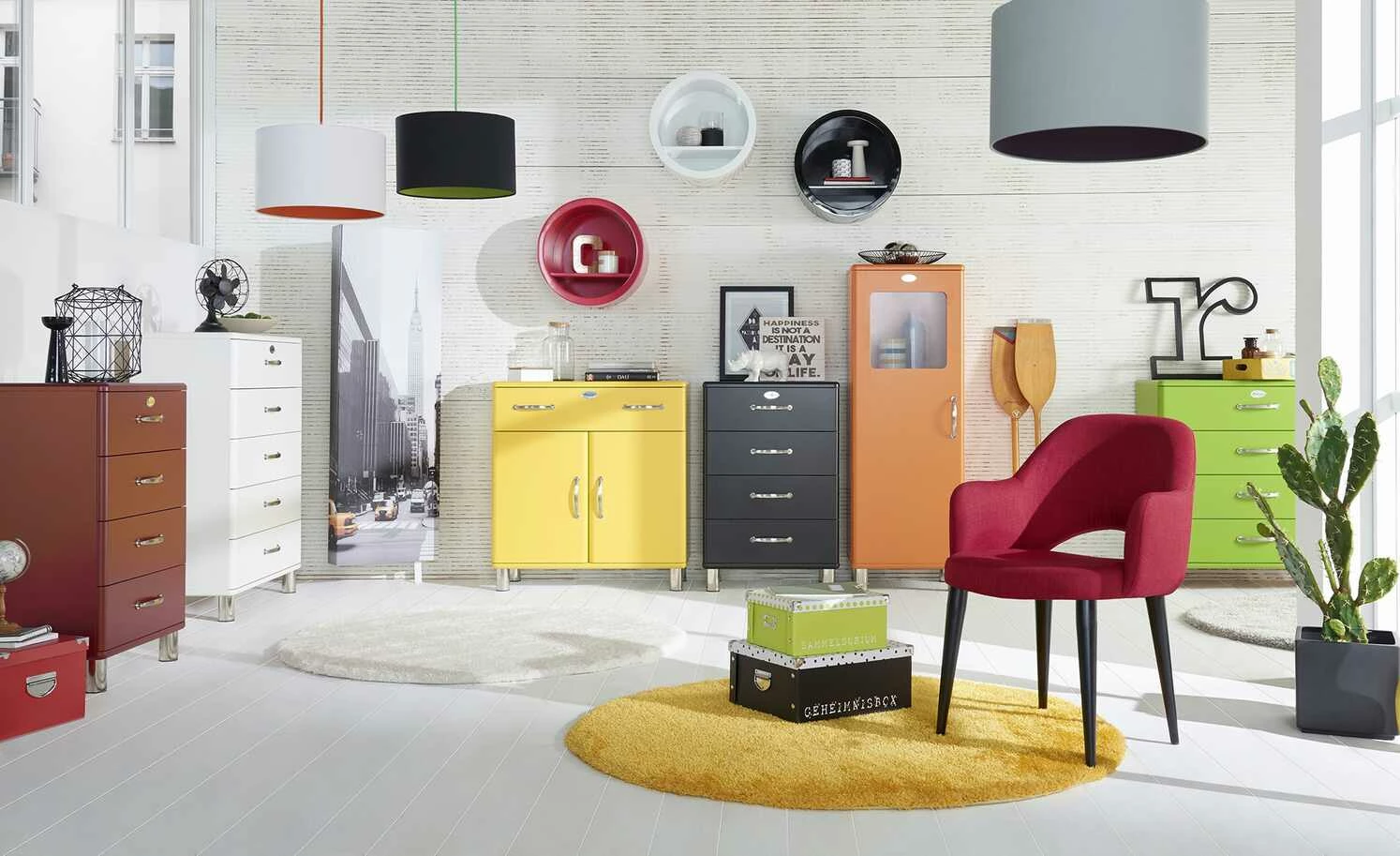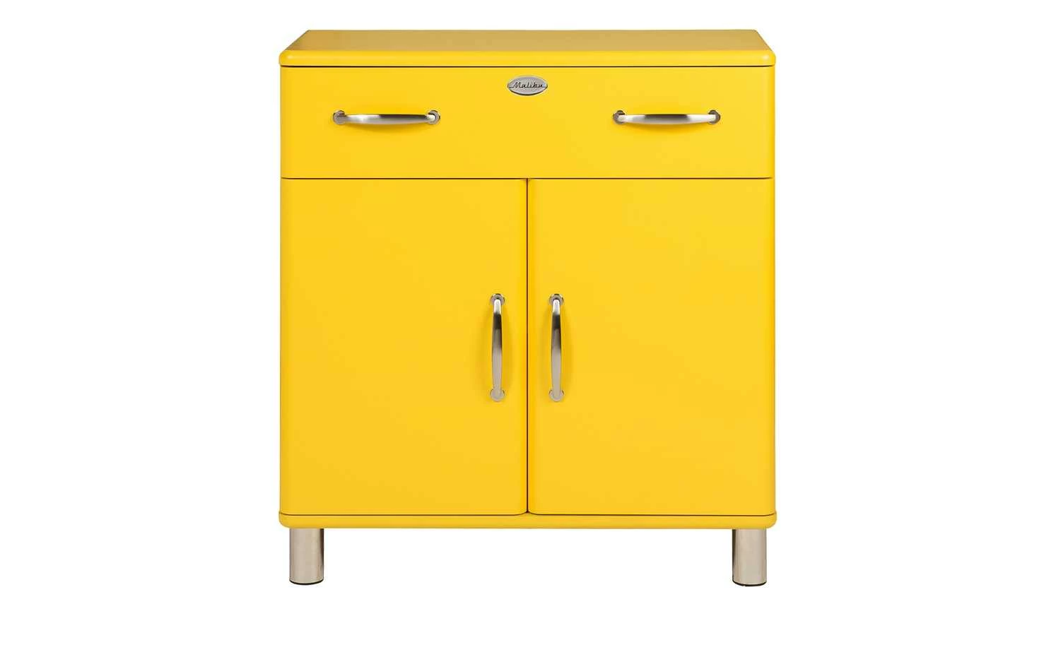 Modern und dennoch Retro ist die Kommode Malibu. Mit ihrem Design erinnert sie an die 50er-Jahre, bleibt dabei aber dennoch frisch und modern. Die Kommode ist lackiert und hat ein mattes Finish. Die Griffe und zylinderförmigen Füße sind aus Metall und setzen Akzente. Ebenso wie das kleine Malibu-Label mittig am Schubkasten. Malibu bietet Staumöglichkeiten in einem Schubkasten und hinter zwei Türen. Dahinter befinden sich zwei Fächer, die durch einen Boden getrennt werden.