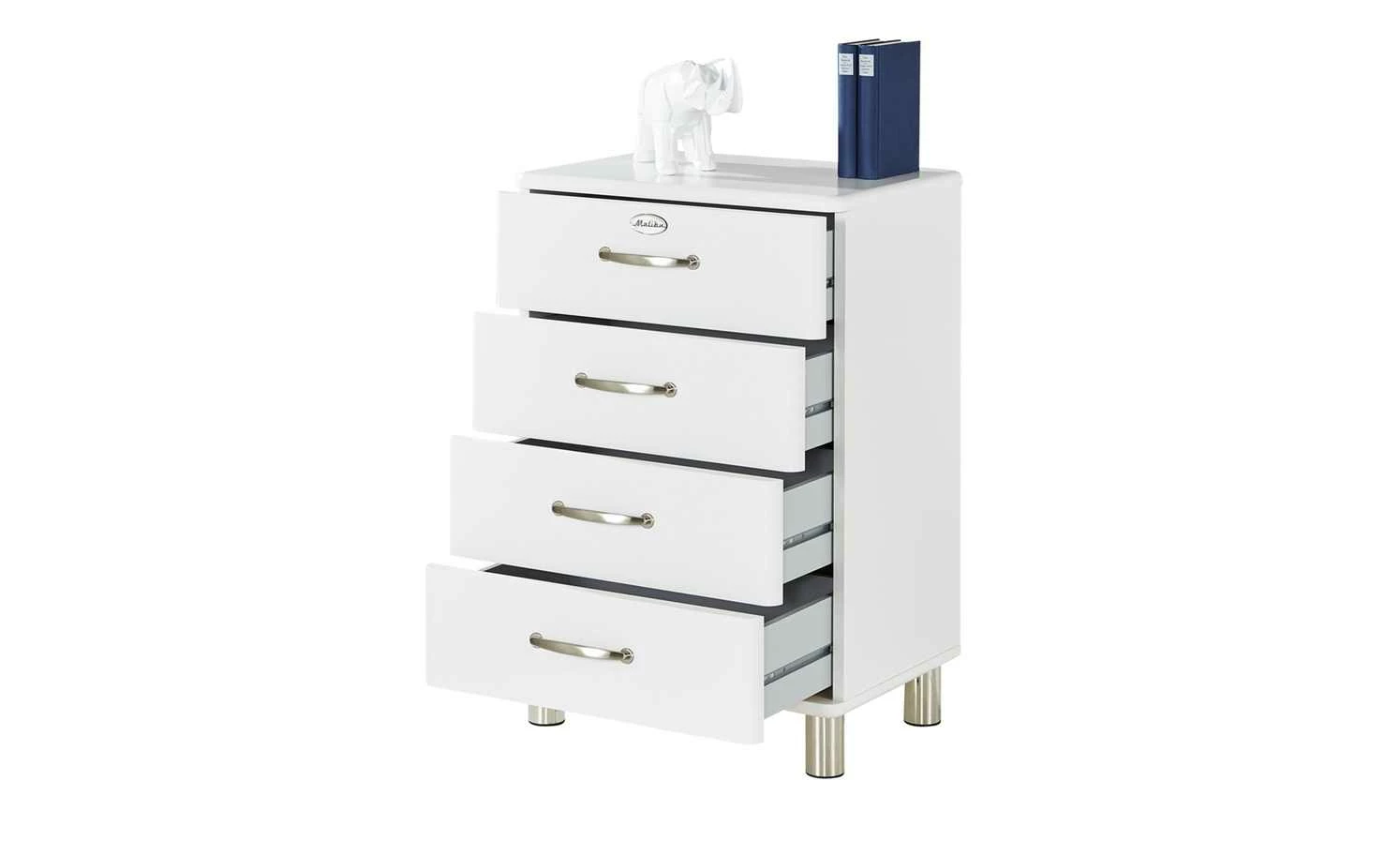 Modernität und Retrodesign im Fifties-Style vereinen sich in der Kommode Malibu. Die Kommode ist matt lackiert und fällt durch ihre coole Farbgebung auf. Die Griffe und zylindrischen Füße aus Metall setzen kontrastreiche und moderne Akzente. Ob in Wohnbereich, Büro oder Jugendzimmer – diese Kommode ist mit ihren vier Schubfächern ein absolutes Highlight.