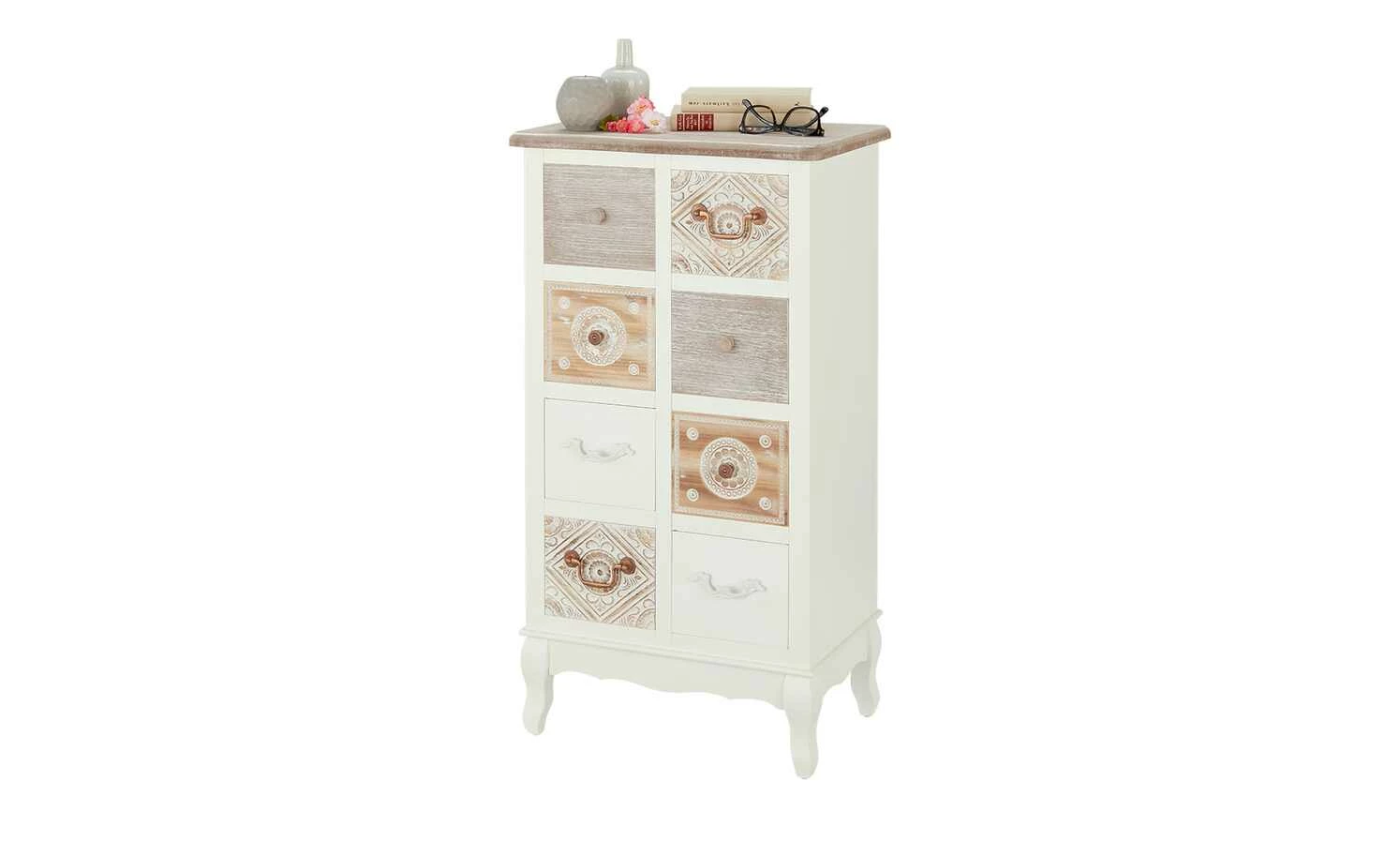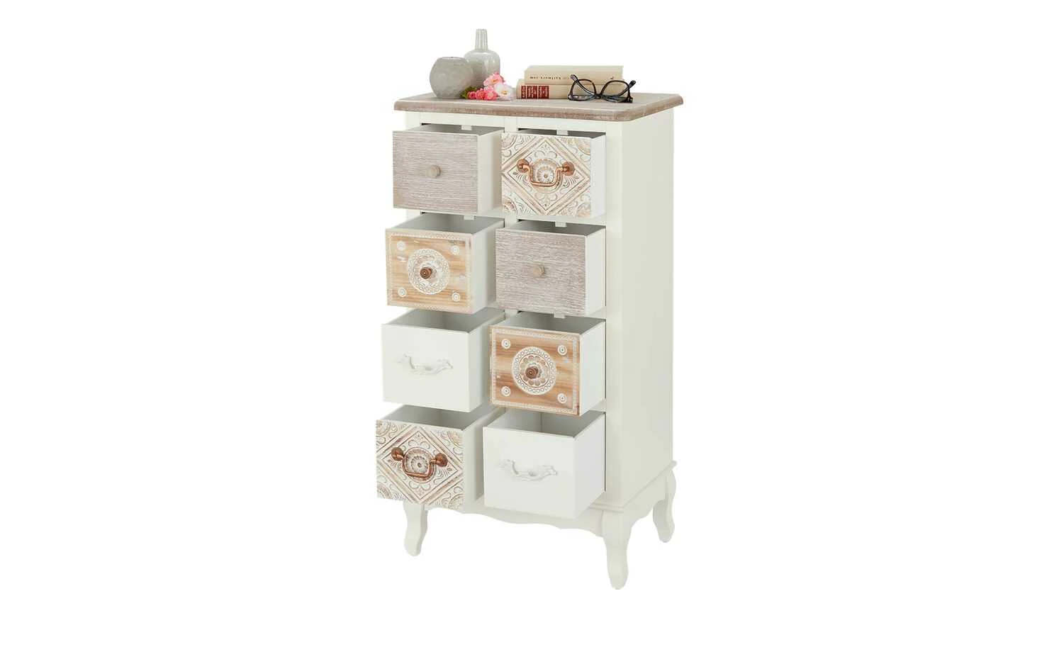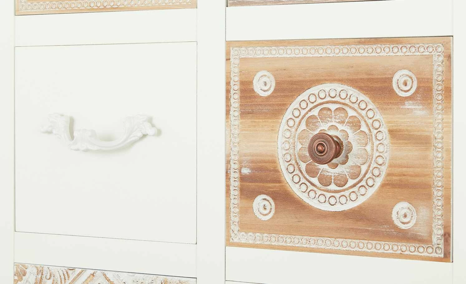 In der Kommode Foggia können Kleinigkeiten gut sortiert untergebracht werden. Dafür stehen Ihnen acht kleine Schubkästen zur Verfügung. Sie fallen durch ihre unterschiedlichen Frontdesigns ins Auge. So sind einige Schübe in schlichtem Weiß gehalten, andere sind mit Paulownia-Holz furniert. Die Schubkastenfronten aus massiver Kiefer sind besonders attraktiv. Sie verfügen über filigrane Schnitzereien mit weißer Lackoberfläche. Der Korpus ist weiß lackiert – und bringt das extravagante Frontdesign so noch besser zur Geltung.
