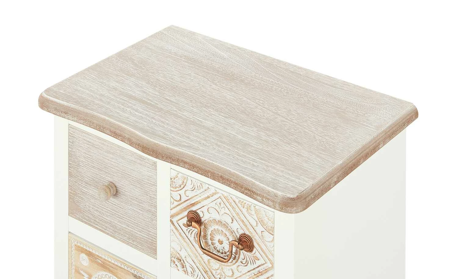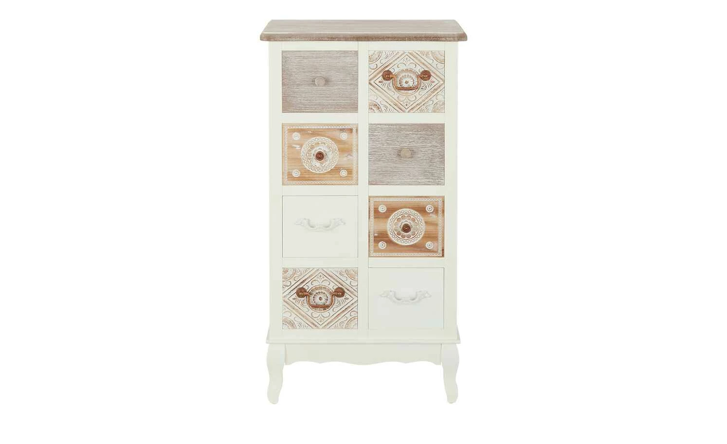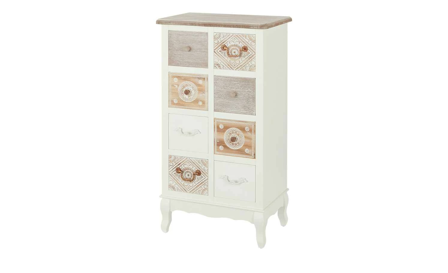 In der Kommode Foggia können Kleinigkeiten gut sortiert untergebracht werden. Dafür stehen Ihnen acht kleine Schubkästen zur Verfügung. Sie fallen durch ihre unterschiedlichen Frontdesigns ins Auge. So sind einige Schübe in schlichtem Weiß gehalten, andere sind mit Paulownia-Holz furniert. Die Schubkastenfronten aus massiver Kiefer sind besonders attraktiv. Sie verfügen über filigrane Schnitzereien mit weißer Lackoberfläche. Der Korpus ist weiß lackiert – und bringt das extravagante Frontdesign so noch besser zur Geltung.