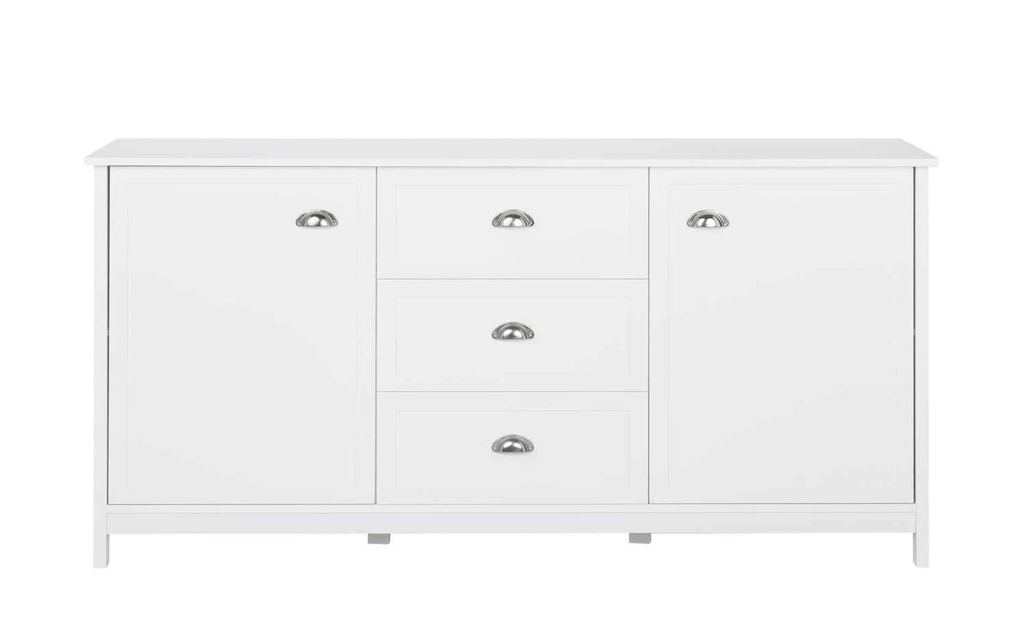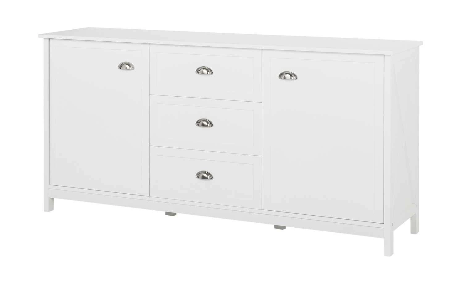Mit ihrem Landhausstil ist die Kommode Mosi eine Bereicherung für Speisezimmer und Wohnraum. Mosi bietet Ihnen auf einer Gesamtbreite von zirka 160 Zentimetern ordentlich Stauraum hinter zwei Türen und drei Schubladen. Die Griffe im Apothekerstil sind aus glänzendem Metall. Korpus und Front sind lackiert – wahlweise in Weiß oder in Schwarzbraun.