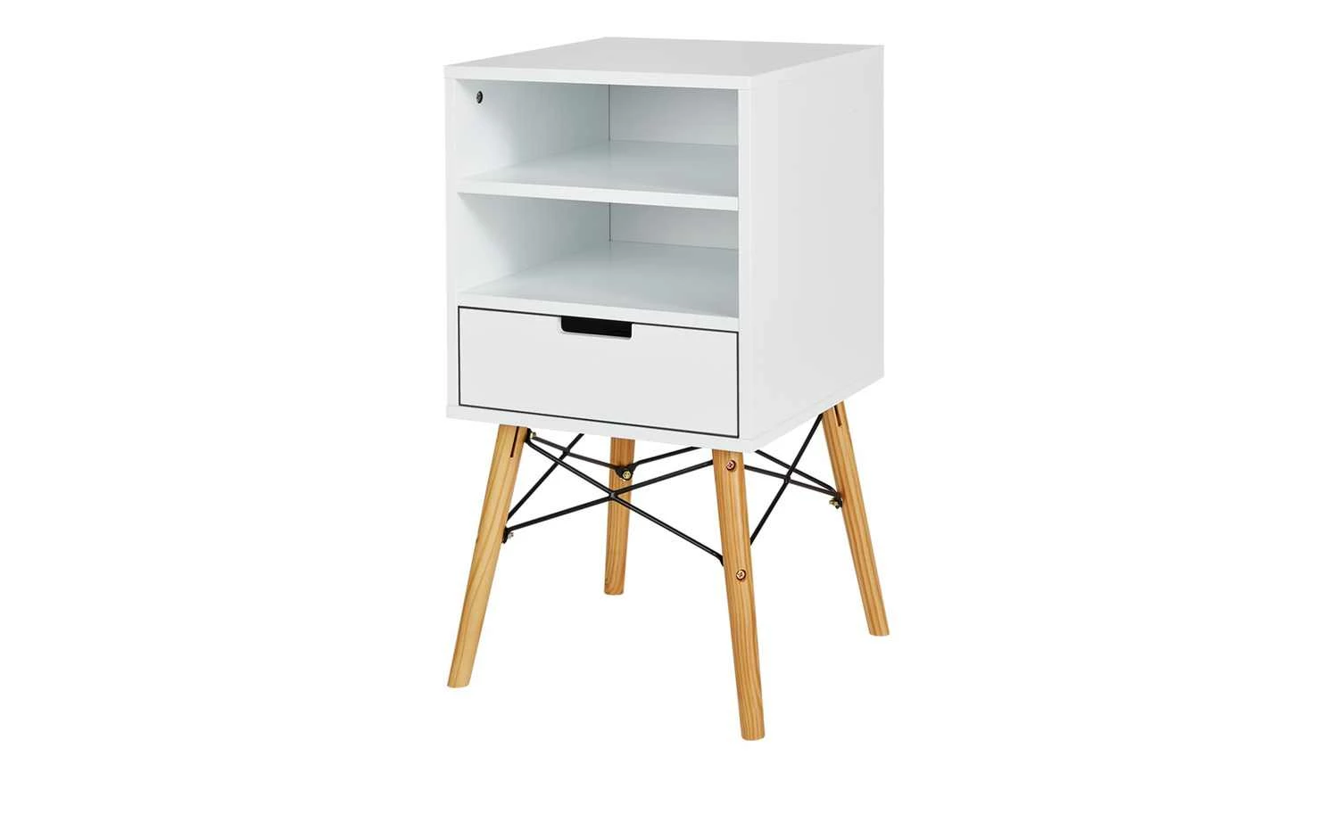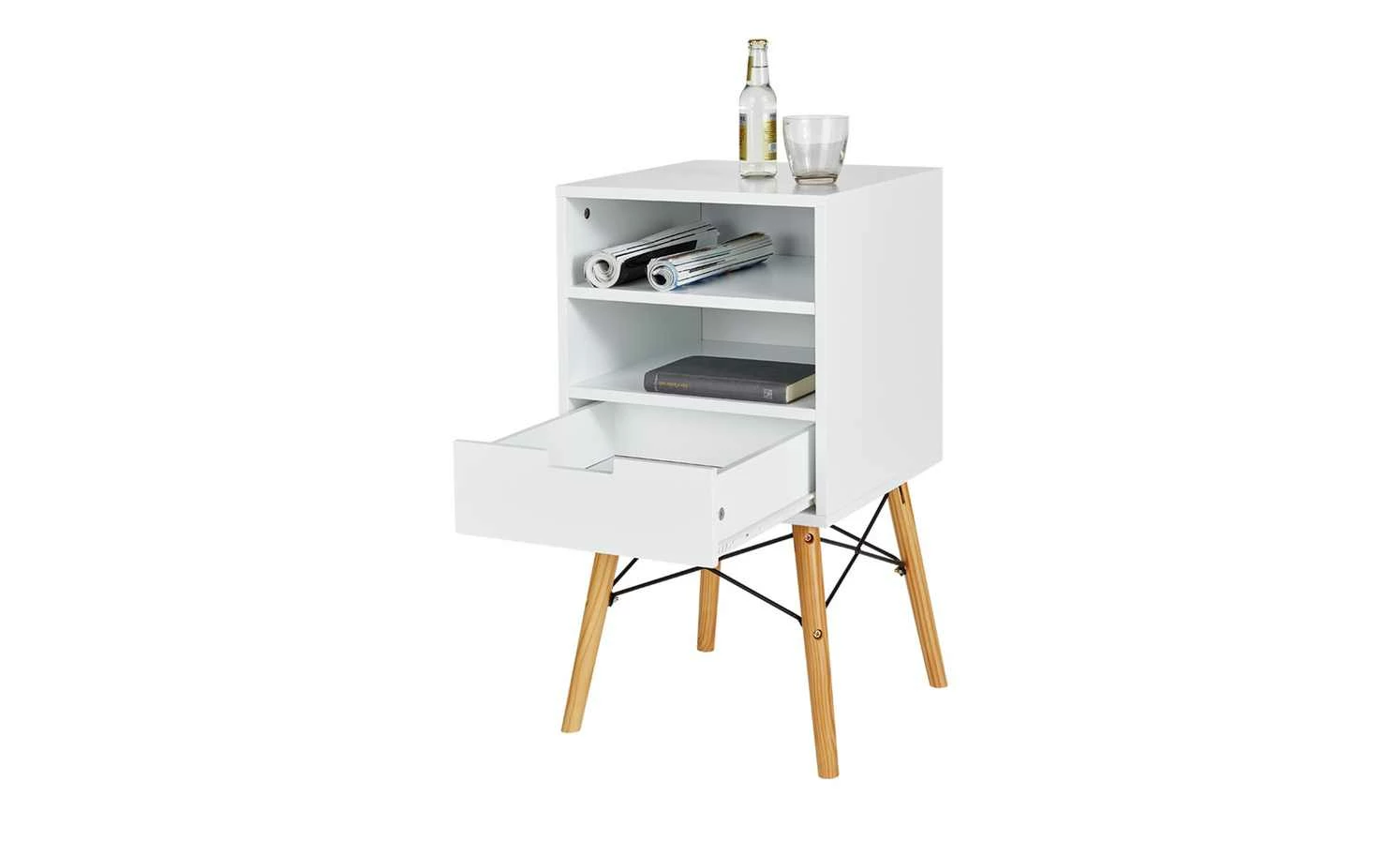 Modernität und Retro-Stil vereinen sich in der Kommode New York 2. Die elegante Kommode ist in einem matt-weißen Ton gehalten und wirkt luftig und leicht. Die Beine aus massivem Pinienholz stellen einen geschmackvollen Kontrast zur weißen Farbe dar. Dadurch, dass die Beine nach unten schmaler werden und leicht abgespreizt sind, erinnern sie an den Stil der 50er und 60er Jahre. Metallverstrebungen zwischen den Beinen setzen nicht nur besondere Akzente, sondern sorgen auch für Stabilität. New York 2 ist mit einer Schublade ausgestattet, darüber befinden sich außerdem zwei offene Fächer.