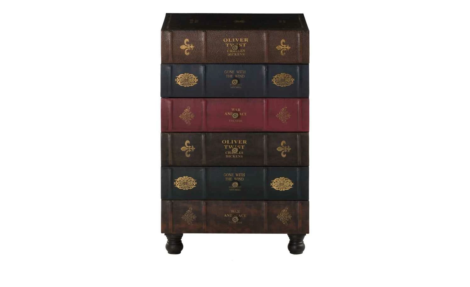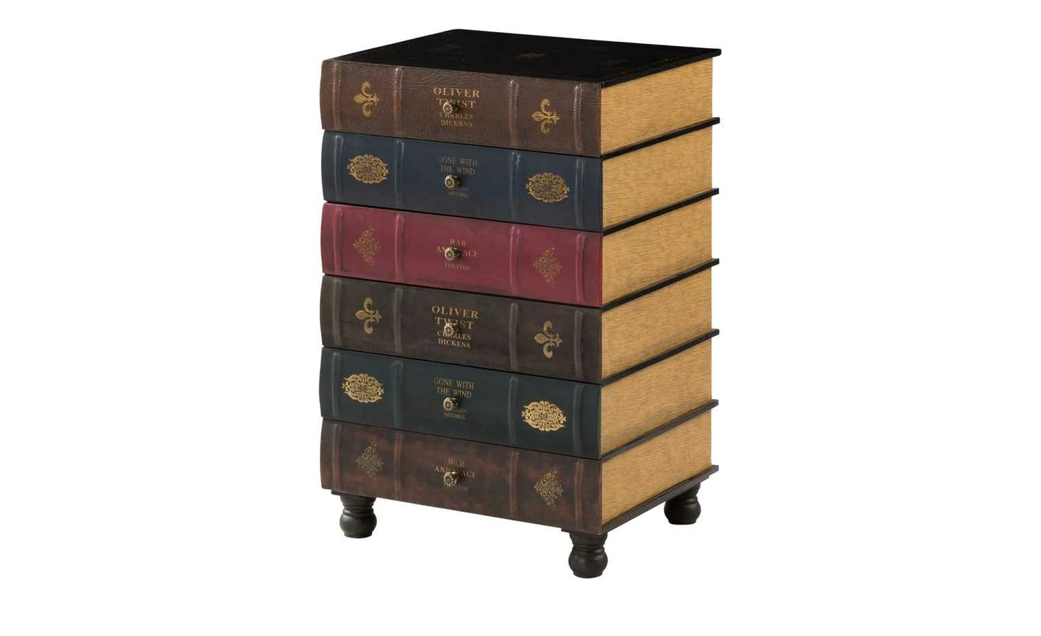 Das antiquarische Bücher-Design macht den besonderen Charme dieser Kommoden-Serie aus. Die mehrfarbige Kommode bringt einen ausdrucksstarken Kolonialstil in Ihre Wohnräume. Mit dieser gedeckten und harmonischen Farbgestaltung strahlt die Kommode Ruhe und Gemütlichkeit aus. Sie bietet ausreichend Stauraum für viele Kleinigkeiten, welche geschlossen und geschützt aufbewahrt werden sollen. Die 6 Schubladen der Kommode sind jeweils von gleicher Größe und mit nostalgischen Ornamenten, sowie einem mittig platzierten Schriftzug verziert. Die Kommoden Oliver Twist sind ein Hingucker und bringen das gewisse Etwas in Ihre Raumgestaltung.