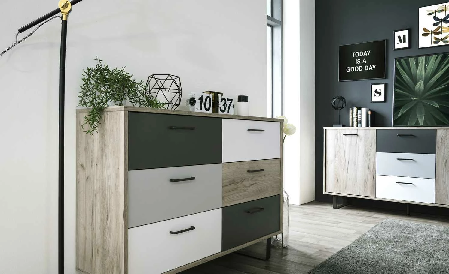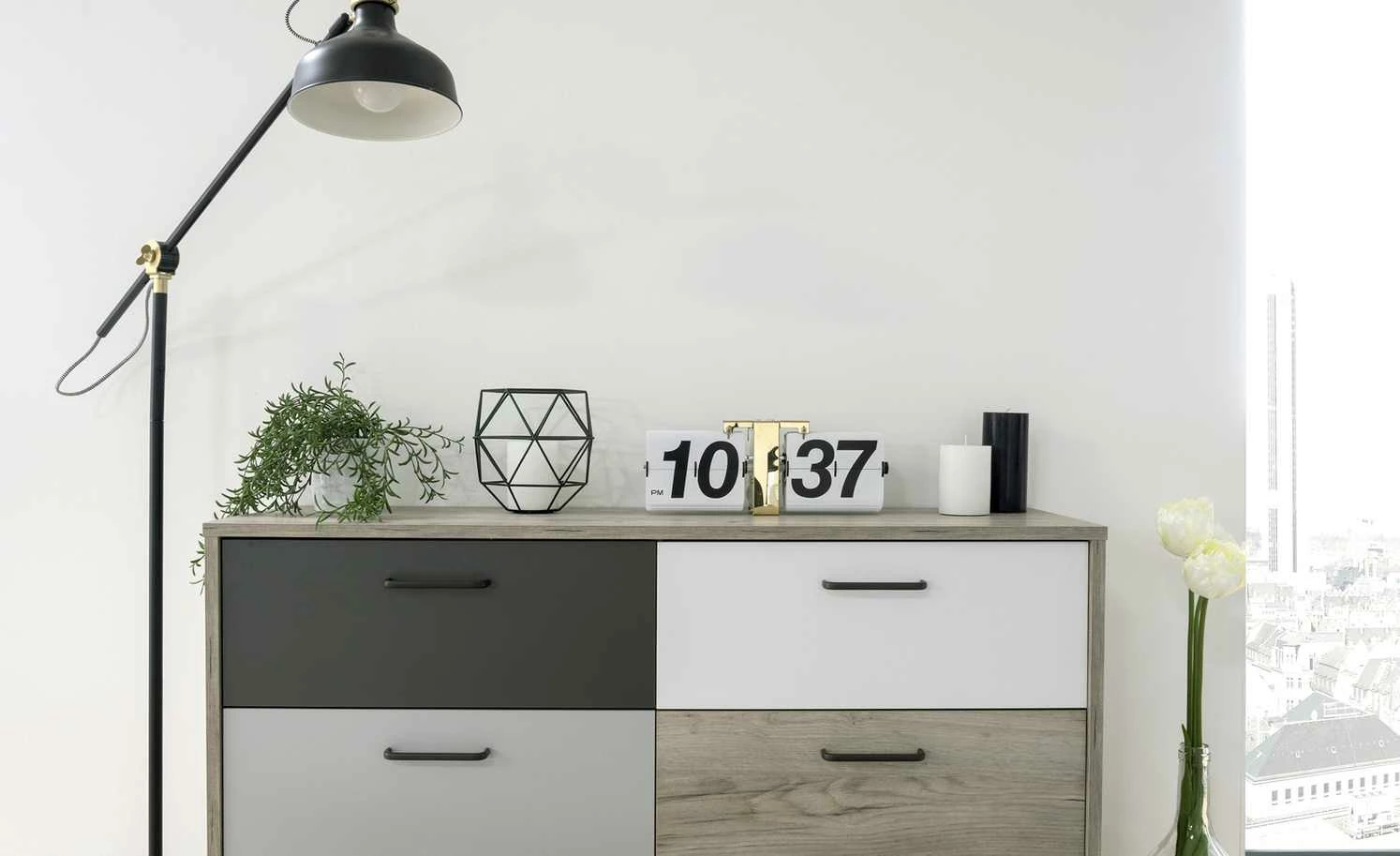 - Farbe / Dekor: Eiche (Nachbildung) / Grau / Weiß