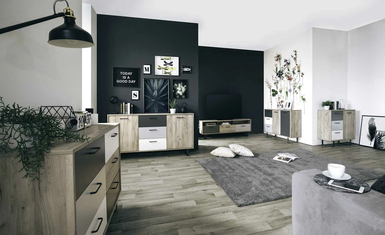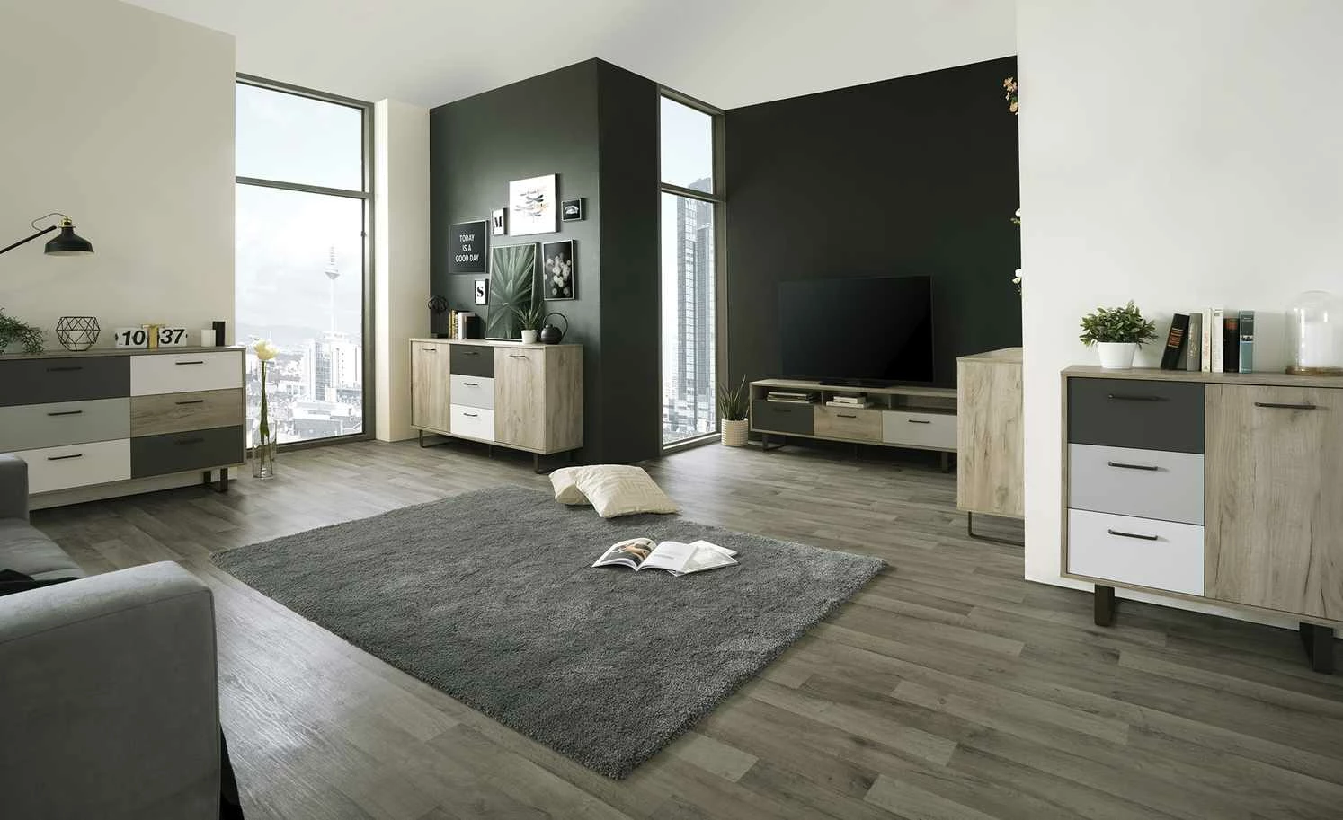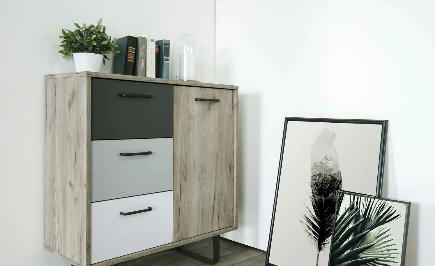 - Farbe / Dekor: Eiche (Nachbildung) / Grau / Weiß