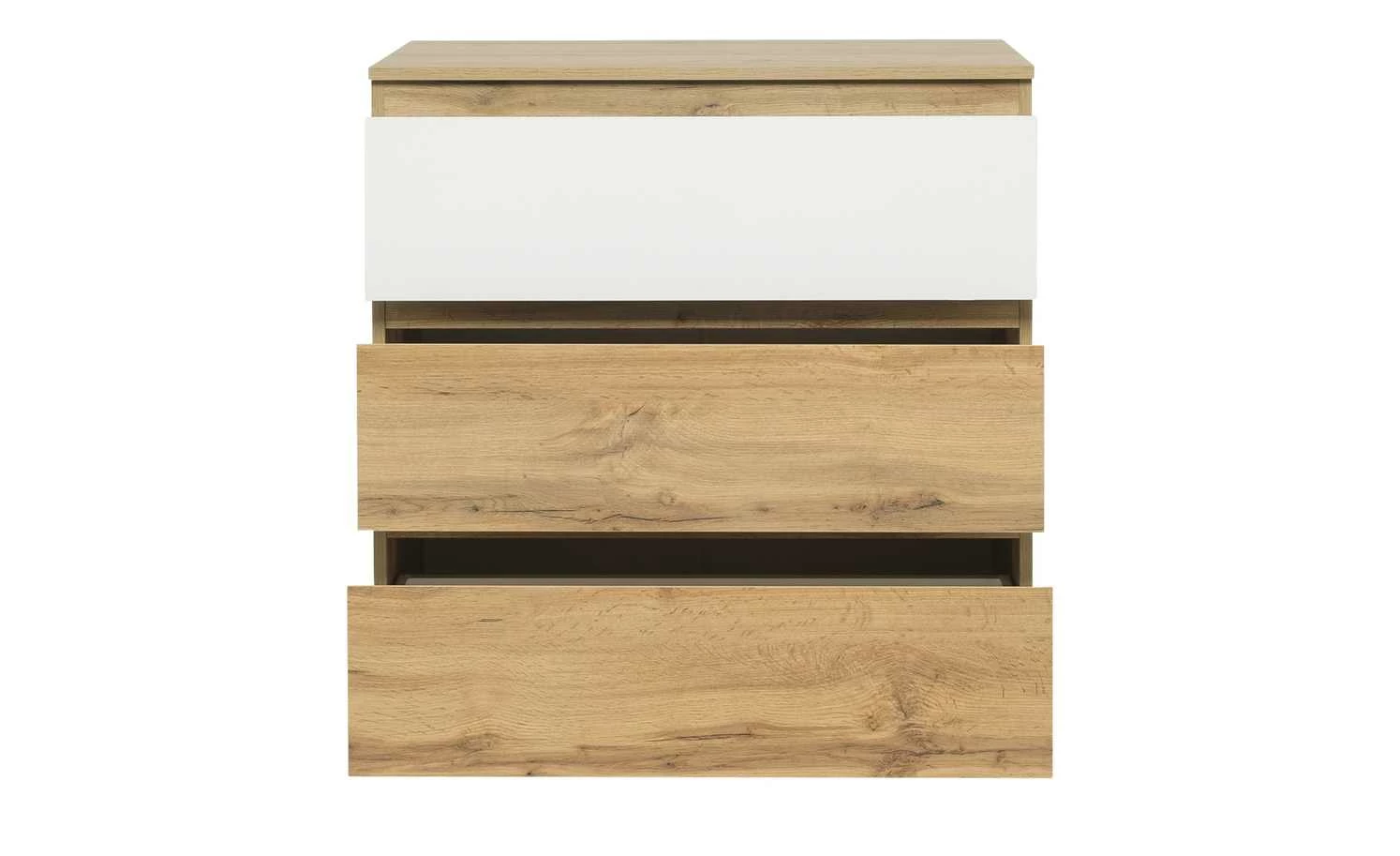 Ob im Wohnraum, Schlafzimmer oder Essbereich – die Kommode Tarent bietet praktischen Stauraum. Sie verfügt über drei geräumige Schubladen, die sich über die gesamte Breite der Kommode erstrecken. Tarent hat ein wohnlich-warmes Dekor in Honigeiche (Nachbildung), das sehr natürlich wirkt. Der obere Schubkasten setzt sich in Weiß ab. Die Kommode wirkt frisch und modern – und fügt sich gut in vorhandene Einrichtungen ein.