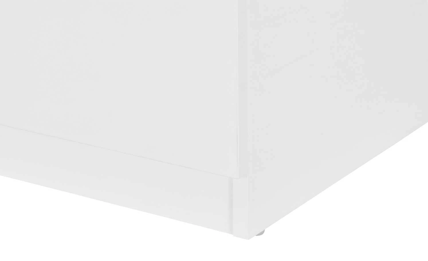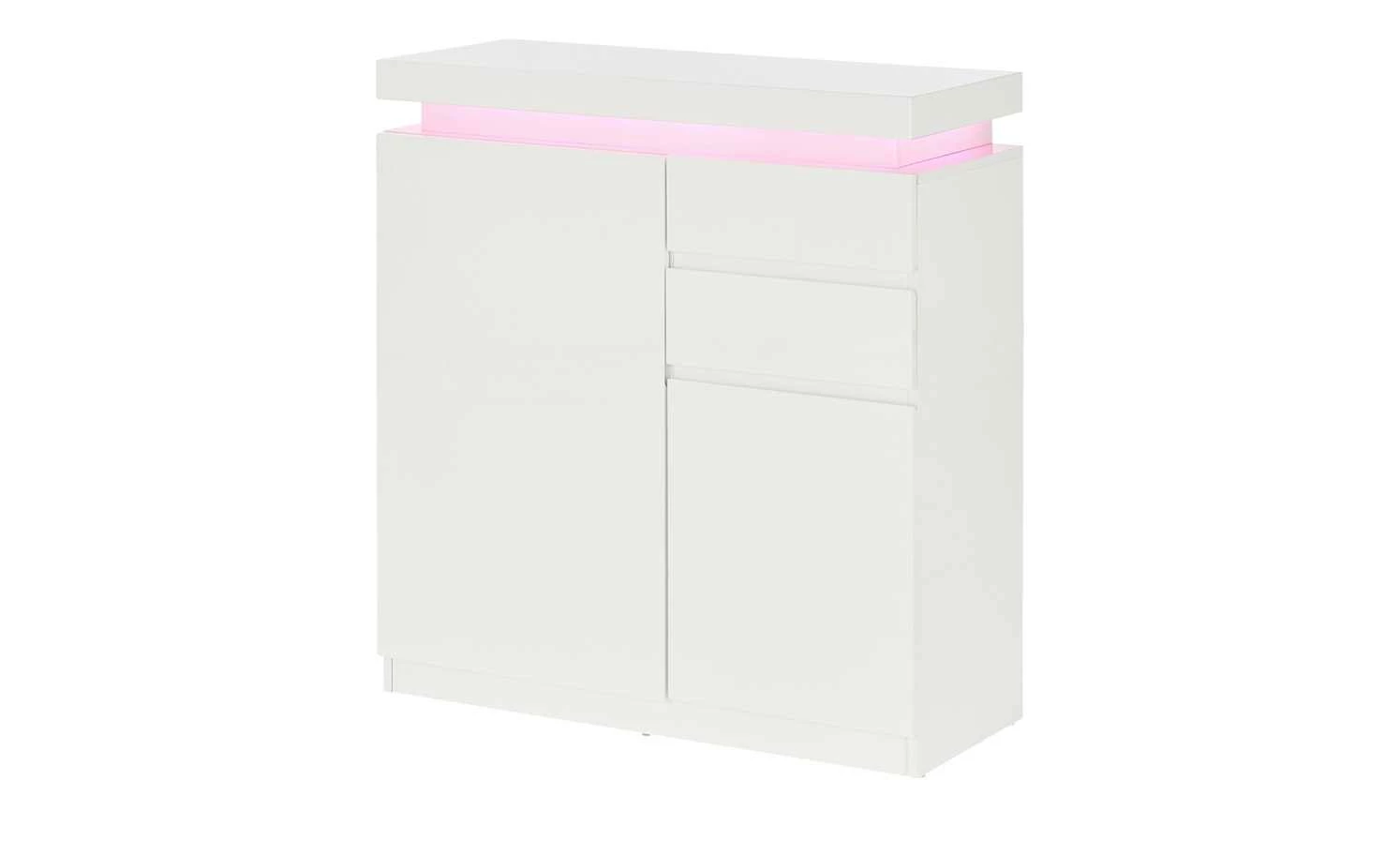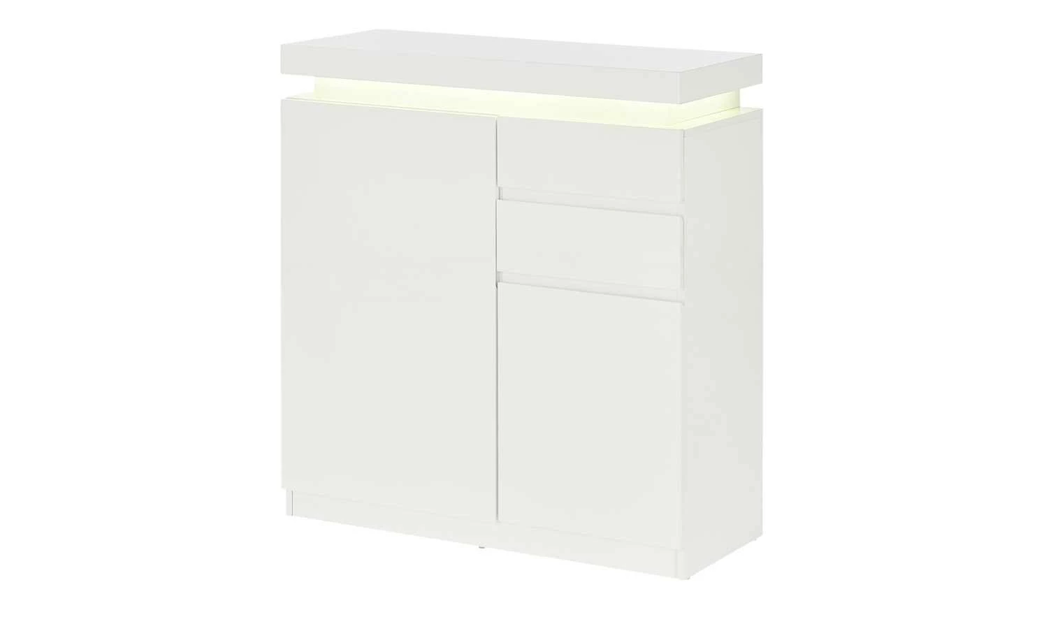 Zweckmäßig und stylisch: Dieser weiße Kommode mit integrierter Beleuchtung bringt Ordnung und Glanz in Ihr Zuhause. Hinter einer großen Tür auf der linken Seite der Kommode befinden sich 5 Einlegeböden. Hier können Sie Ihre Schuhe übersichtlich neben- und übereinander aufbewahren. Weiteren Stauraum finden Sie in 2 Fächern hinter einer kleinen Tür im rechten Bereich des Schranks. Darüber bieten zwei Schubladen Platz für Schuhputzzeug und andere Utensilien. Torri ist komplett weiß lackiert, wobei die Kommode eine auffällige Hochglanzoptik erhalten hat. Für farbige Akzente sorgt die Beleuchtung, die im Lieferumfang enthalten ist. Sie kann die Farbe wechseln und setzt den Schrank in Szene.