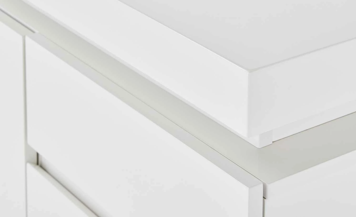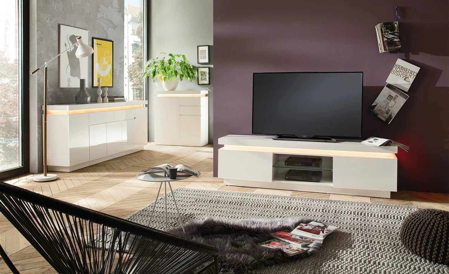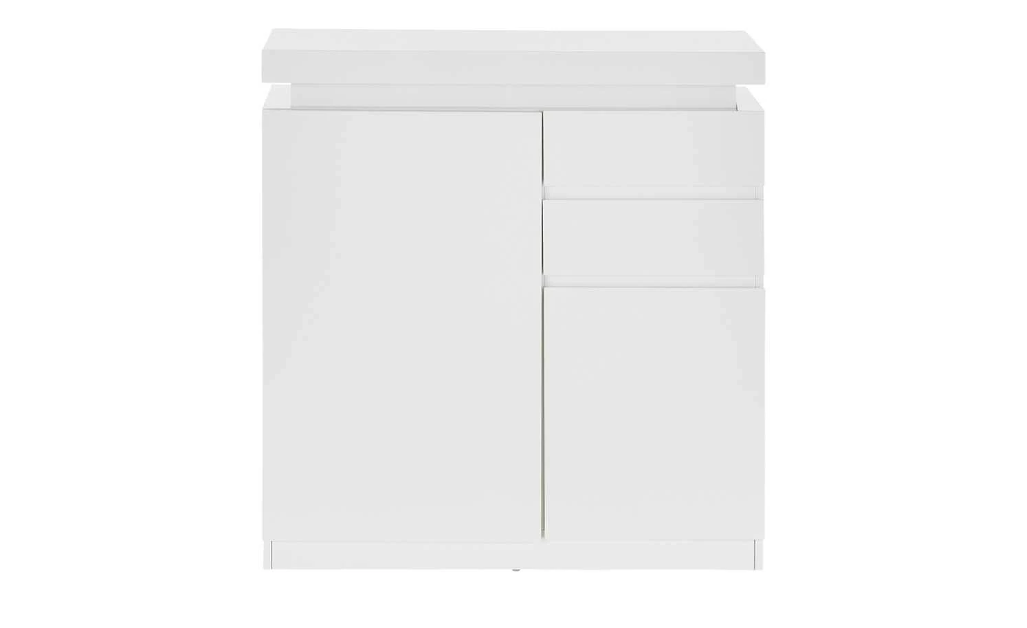 Zweckmäßig und stylisch: Dieser weiße Kommode mit integrierter Beleuchtung bringt Ordnung und Glanz in Ihr Zuhause. Hinter einer großen Tür auf der linken Seite der Kommode befinden sich 5 Einlegeböden. Hier können Sie Ihre Schuhe übersichtlich neben- und übereinander aufbewahren. Weiteren Stauraum finden Sie in 2 Fächern hinter einer kleinen Tür im rechten Bereich des Schranks. Darüber bieten zwei Schubladen Platz für Schuhputzzeug und andere Utensilien. Torri ist komplett weiß lackiert, wobei die Kommode eine auffällige Hochglanzoptik erhalten hat. Für farbige Akzente sorgt die Beleuchtung, die im Lieferumfang enthalten ist. Sie kann die Farbe wechseln und setzt den Schrank in Szene.