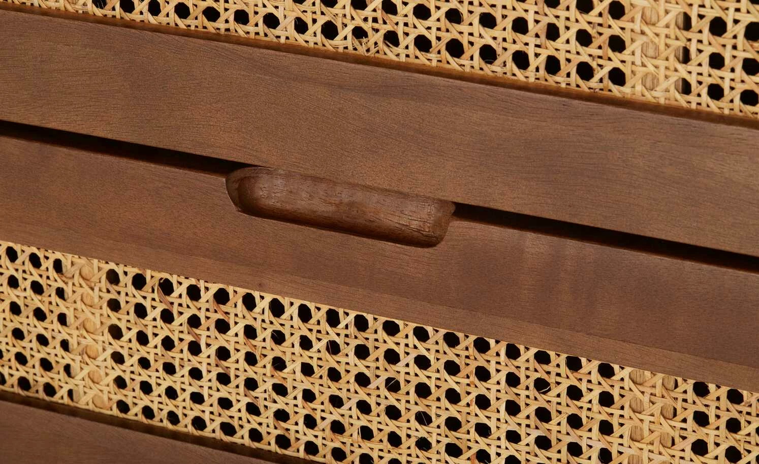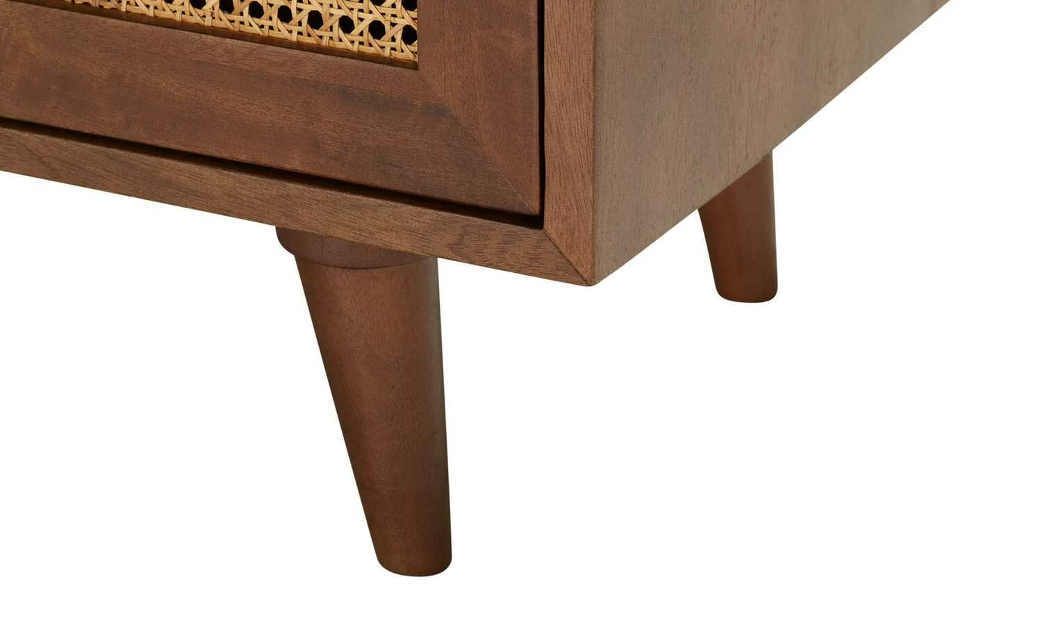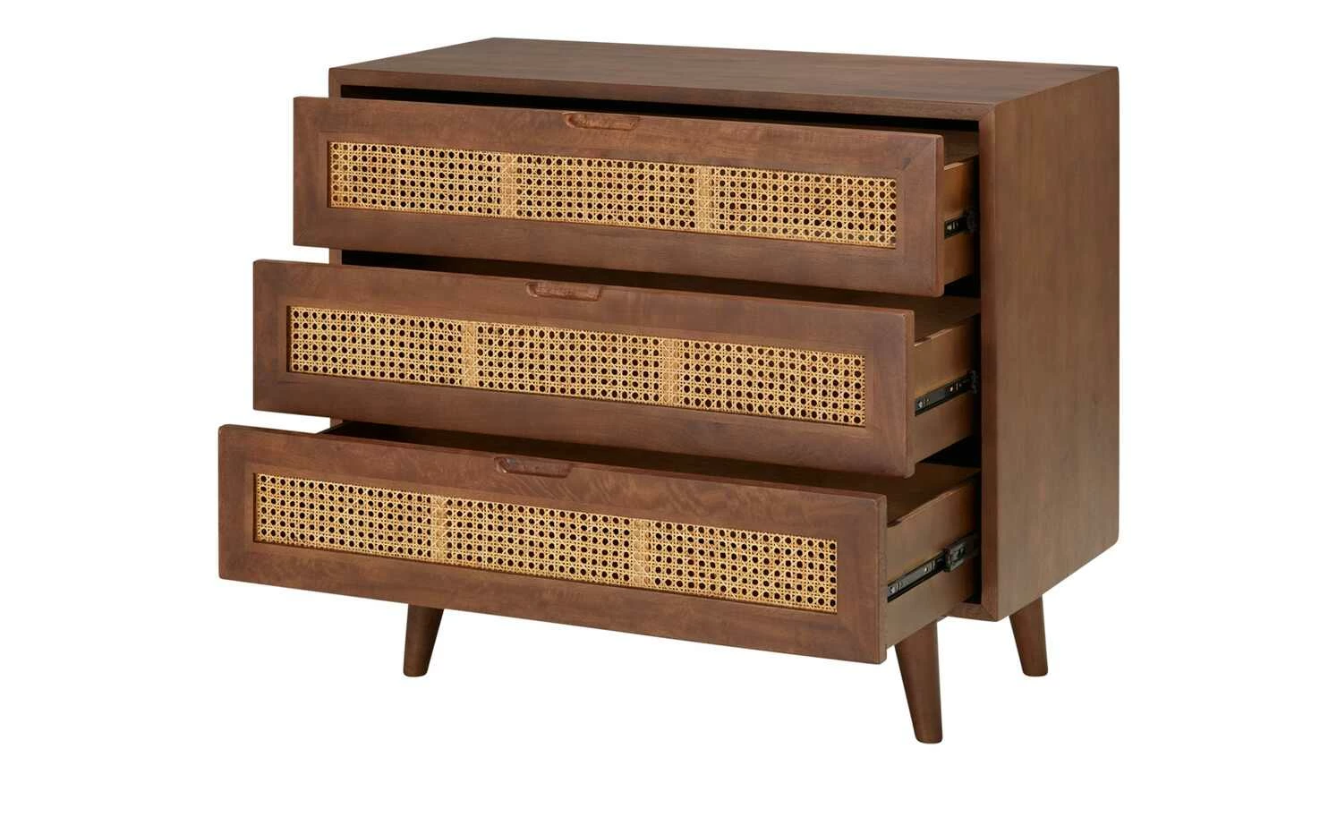 Die Serie Tweed Me entführt Sie in längst vergangene Zeiten und bringt Wiener Eleganz in Ihre vier Wände. So auch die Kommode aus dunklem Mango-Massivholz, welches für den Korpus und die Füße genutzt wurde. Farblicher Kontrast zu dem schön gemaserten Holz sind die Fronten der drei Schubfächer. Diese sind aus natürlichem Rattan zu einem edlen Achteck-Muster geflochten, welches auch als Wiener Geflecht bekannt ist. Die vier konischen, schräg zulaufenden Massivholzfüße runden das Gesamterscheinungsbild gekonnt ab.