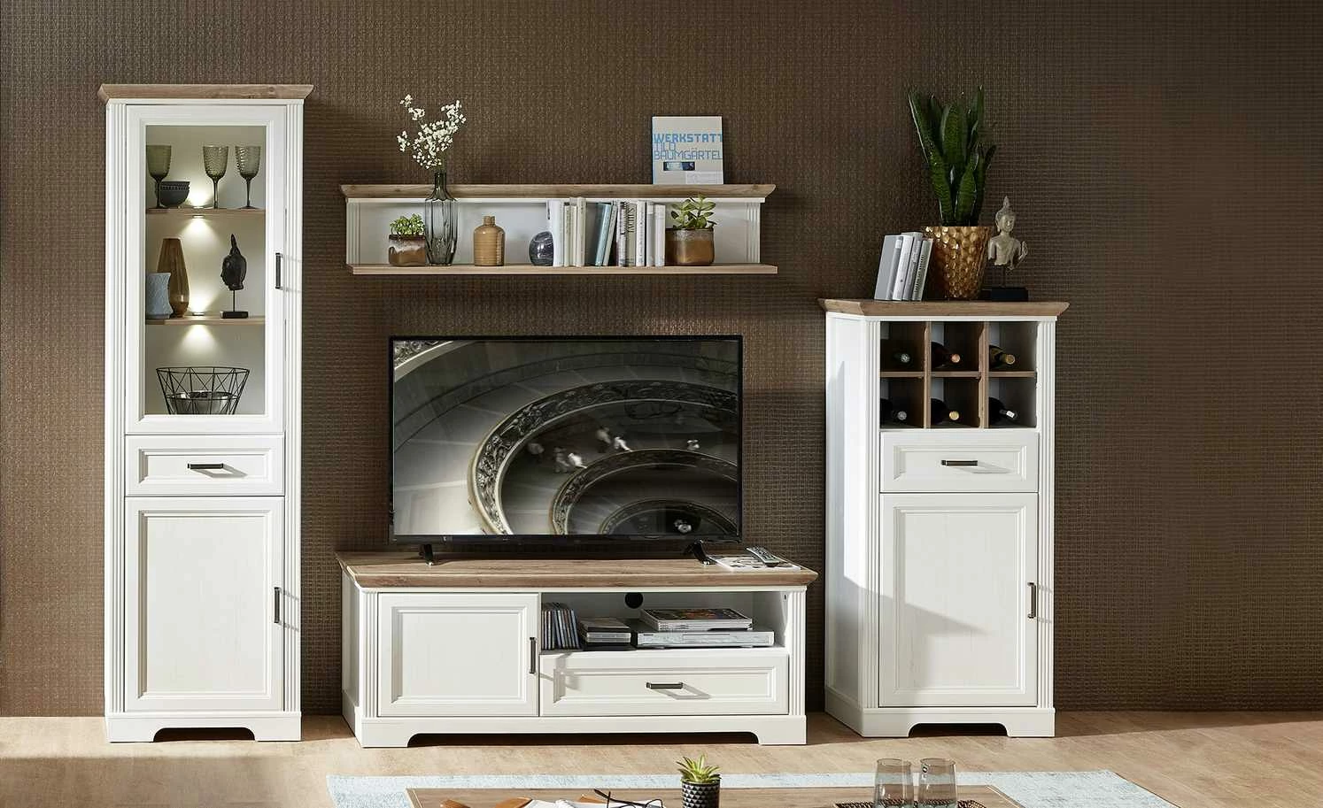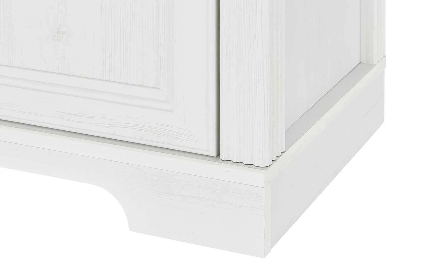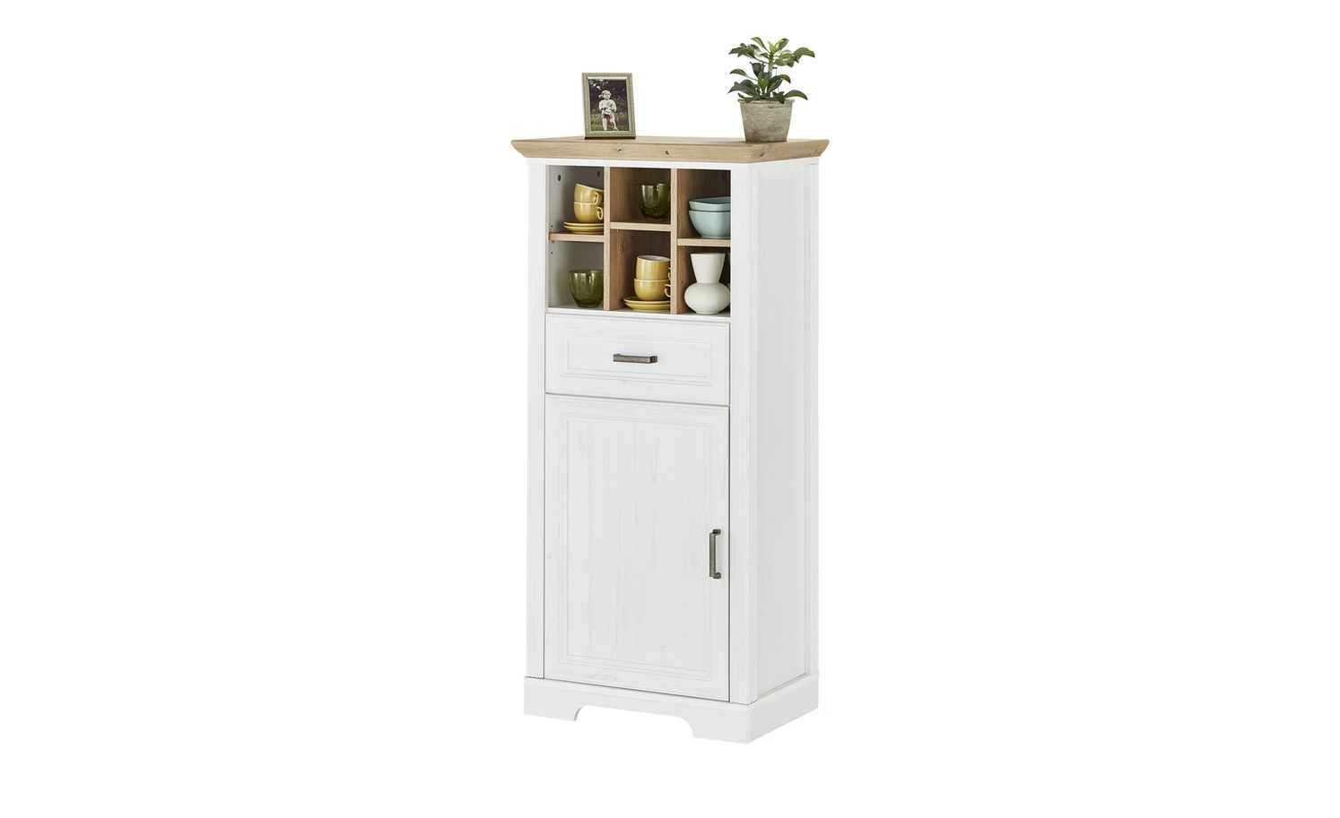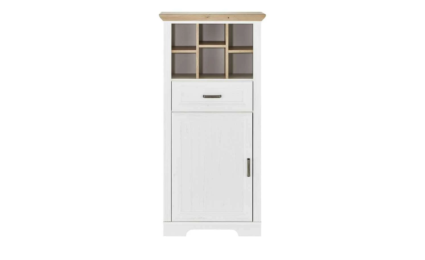 Highlight der Kommode Varese ist das integrierte Weinregal. Es bietet Platz für sechs Flaschen. Alternativ können Sie die offenen Fächer natürlich auch für andere Dinge nutzen. Darüber hinaus ist Varese mit einer Schublade und einer Tür ausgestattet, hinter der sich zwei Fächer befinden. Den Einlegeboden können Sie in der Höhe verstellen. Die Kommode ist im Landhausstil verziert und hat ein sehr freundliches, helles Dekor in Pinie hell (Nachbildung). Abdeckplatte und Regaleinsatz setzen sich in Asteiche (Nachbildung) ab.