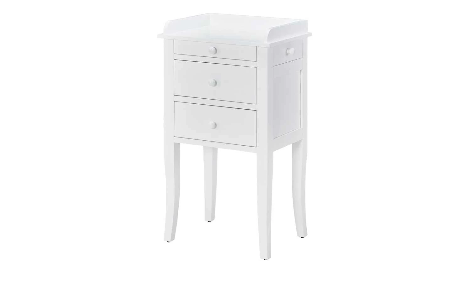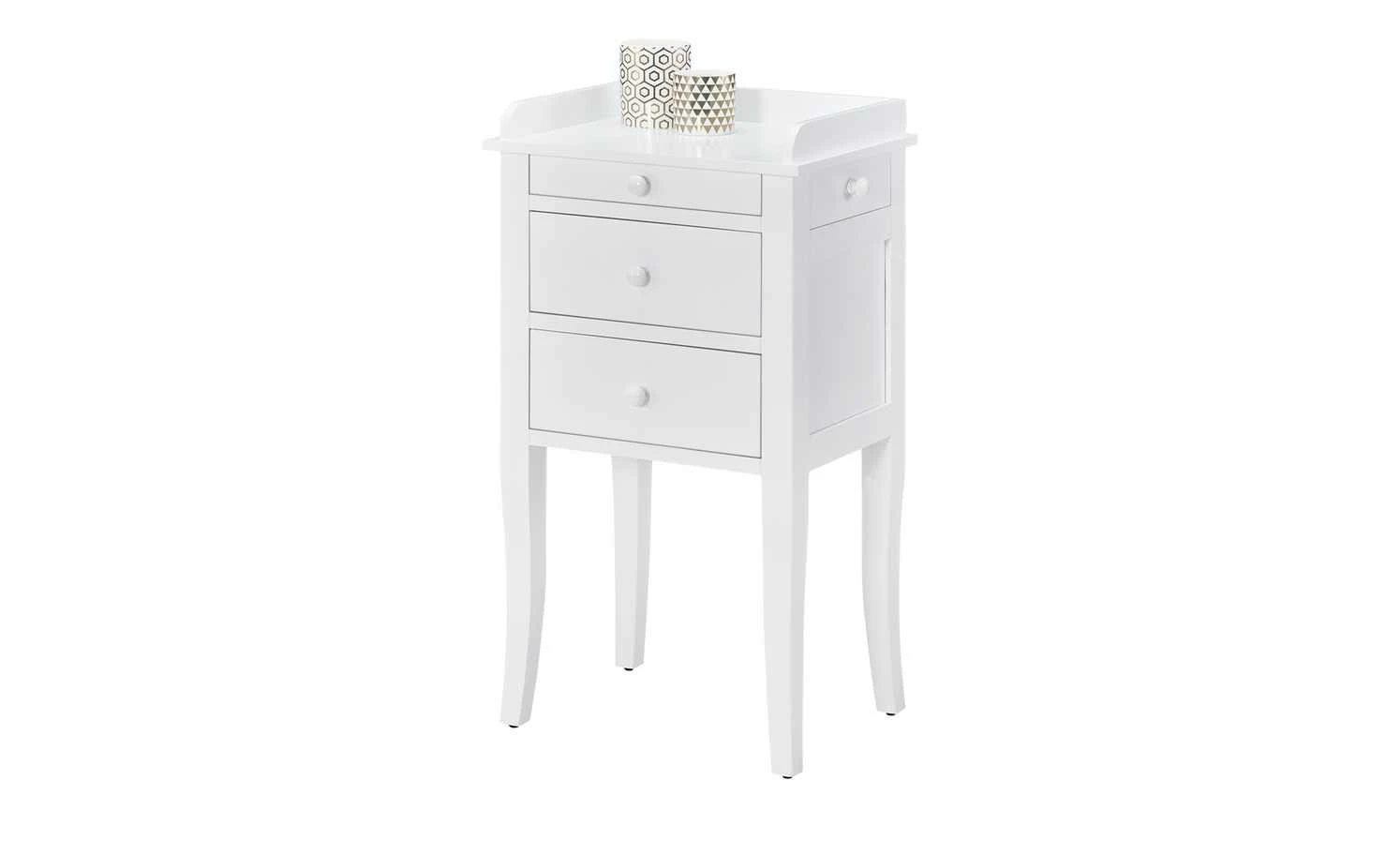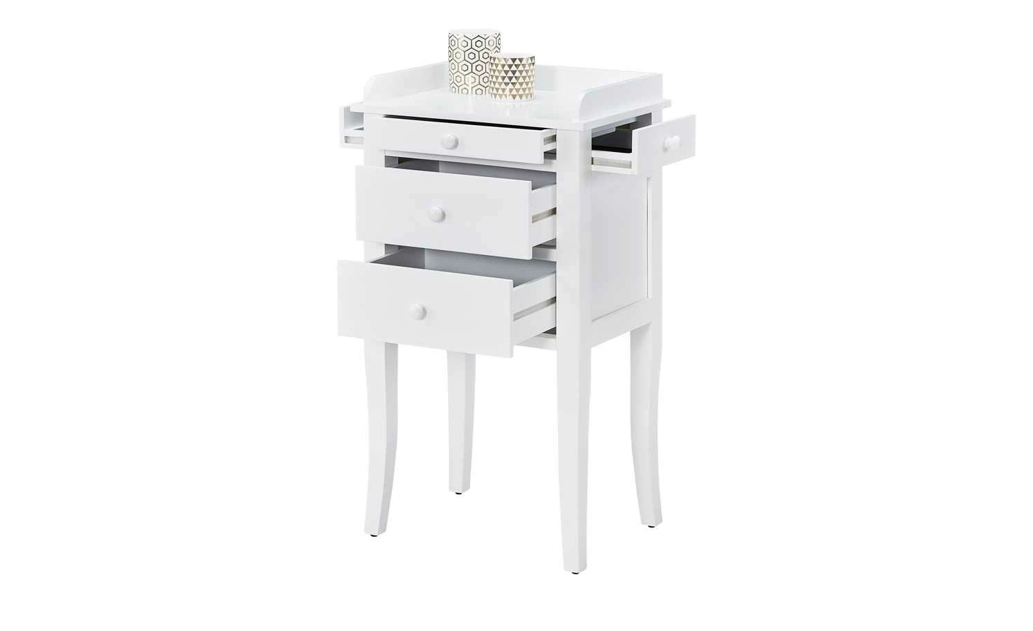 Die zierliche Kommode Venedig verfügt über eine elegante Lackierung in Weiß und bietet Ihnen eine Vielzahl an Stauräumen. Der Frontbereich ist mit insgesamt drei Schubladen ausgestattet, von denen die obere etwas schmaler gearbeitet ist. Die Besonderheit dieser Kommode besteht darin, dass sie auch an den Seitenbereichen über jeweils einen kleinen Schubkasten verfügt. Hier können Sie zum Beispiel persönliche Gegenstände oder Schmuck verstauen. Sämtliche Blenden sind mit dekorativen Knopfgriffen versehen. Vier stabile Holzbeine, die sich nach unten hin verjüngen, sorgen für einen sicheren Stand. Die Deckplatte des kleinen Schränkchens ist an drei Seiten gerahmt und eignet sich als Ablage für diverse Gegenstände.