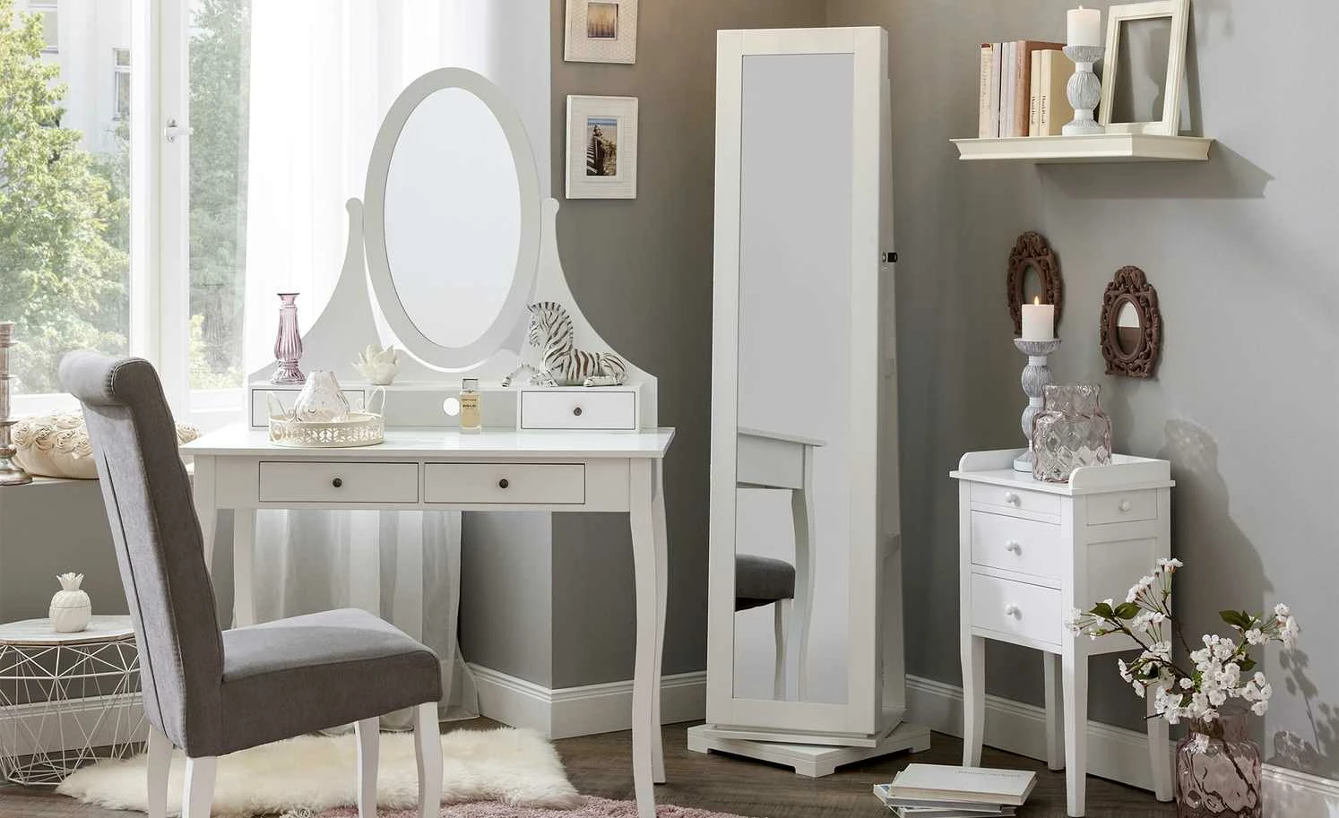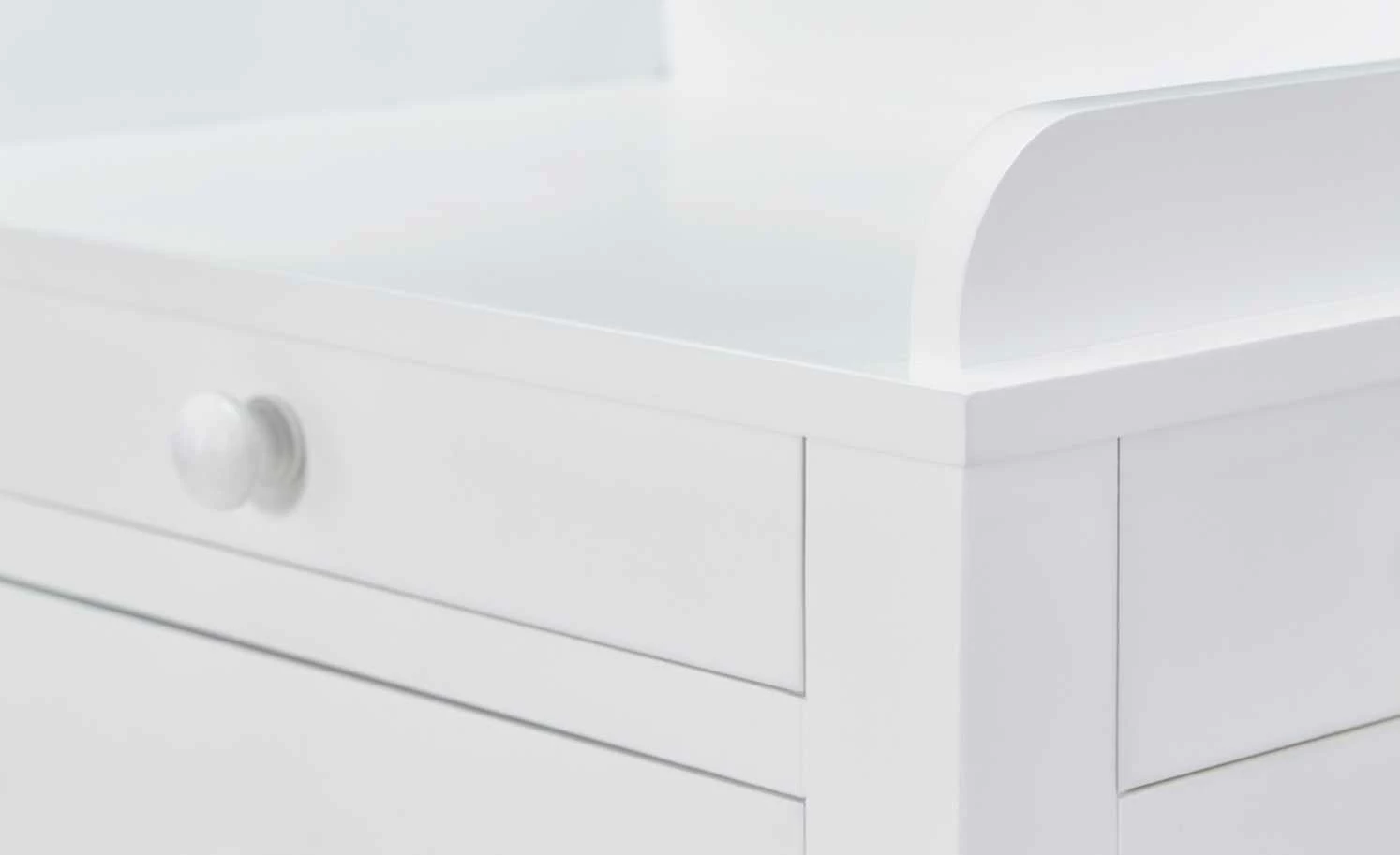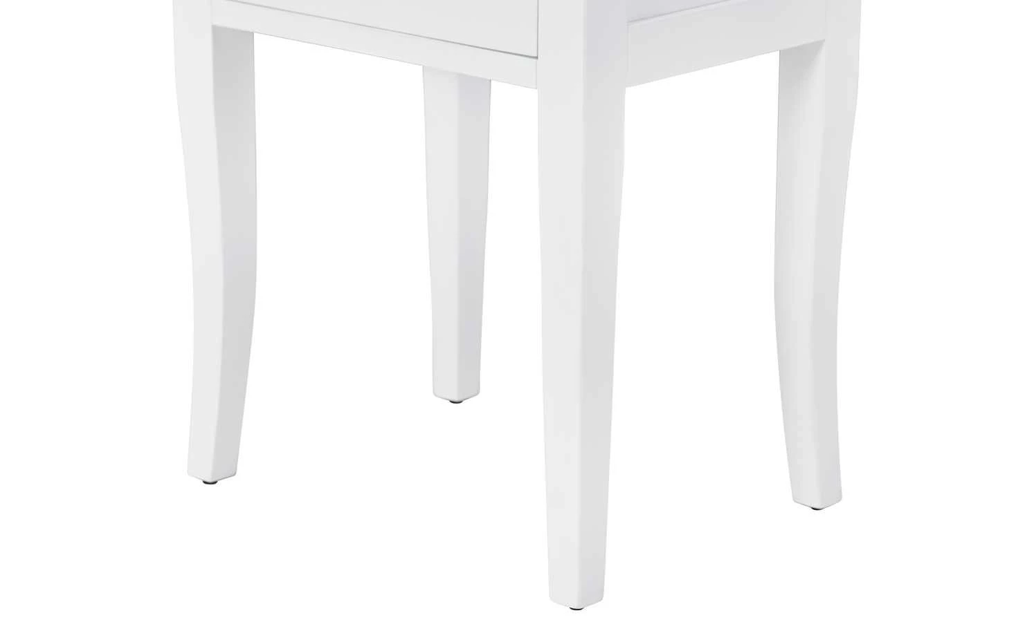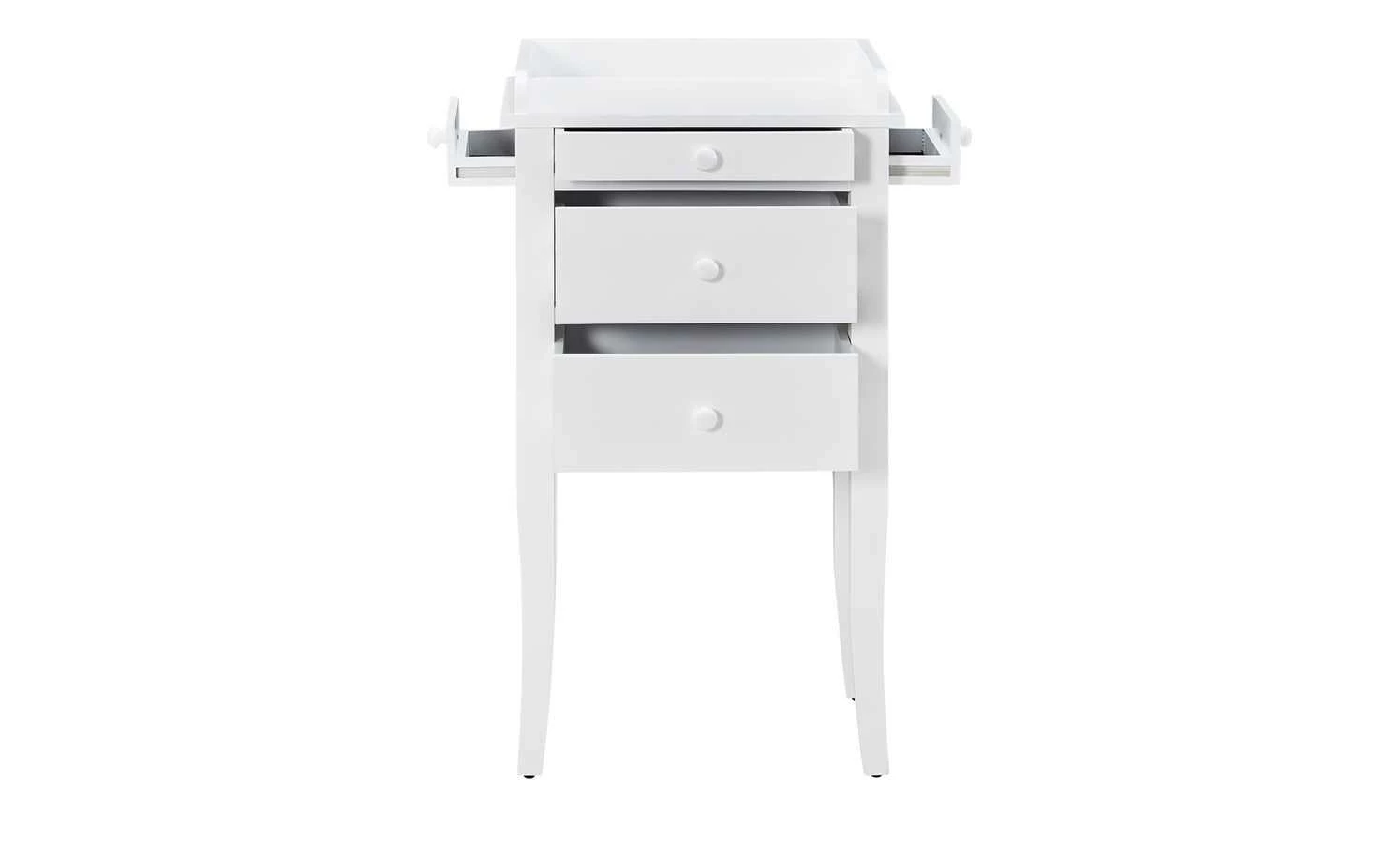 Die zierliche Kommode Venedig verfügt über eine elegante Lackierung in Weiß und bietet Ihnen eine Vielzahl an Stauräumen. Der Frontbereich ist mit insgesamt drei Schubladen ausgestattet, von denen die obere etwas schmaler gearbeitet ist. Die Besonderheit dieser Kommode besteht darin, dass sie auch an den Seitenbereichen über jeweils einen kleinen Schubkasten verfügt. Hier können Sie zum Beispiel persönliche Gegenstände oder Schmuck verstauen. Sämtliche Blenden sind mit dekorativen Knopfgriffen versehen. Vier stabile Holzbeine, die sich nach unten hin verjüngen, sorgen für einen sicheren Stand. Die Deckplatte des kleinen Schränkchens ist an drei Seiten gerahmt und eignet sich als Ablage für diverse Gegenstände.