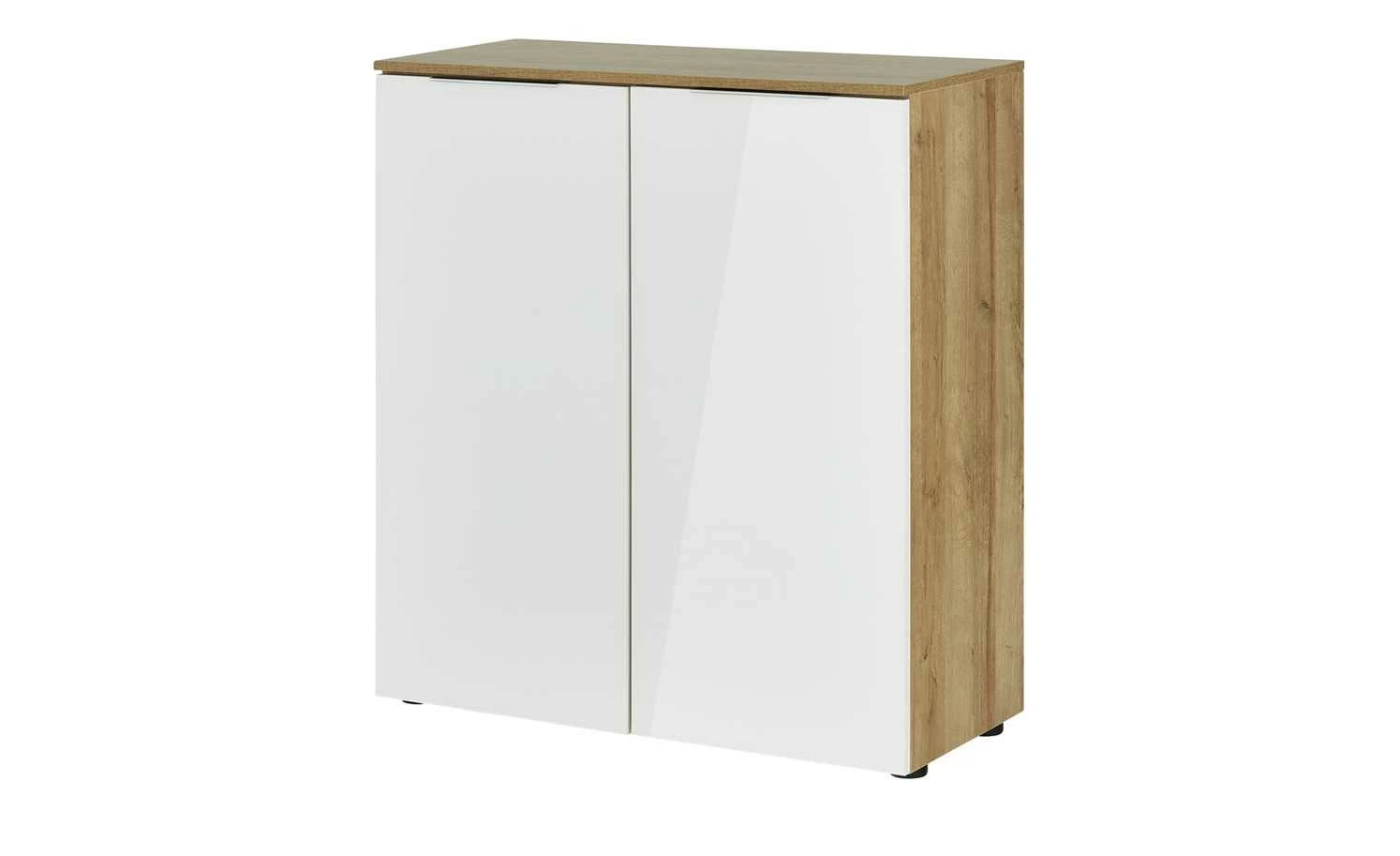 Mit ihrem modernen Look und praktischen Nutzen ist die Kommode Vitreo ein Highlight für jeden Raum. Die geradlinige Linienführung wird mit einem puren und leuchtenden Weiß kombiniert. Die Front hat eine Oberfläche aus ESG-Sicherheitsglas. Es ist besonders hart und widerstandsfähig – und gibt der Front ein glänzendes Finish. Zusätzliche Akzente werden durch die verchromten Griffleisten gesetzt. Der Korpus der Kommode hat eine natürliche Holzoptik. Er ist melaminbeschichtet und somit kratzerunempfindlich und leicht zu pflegen. Vitreo ist mit zwei Türen ausgestattet, hinter denen Ihnen drei Fächer zur Verfügung stehen. Beide Türen haben eine integrierte Soft-Close-Funktion für leises Schließen.