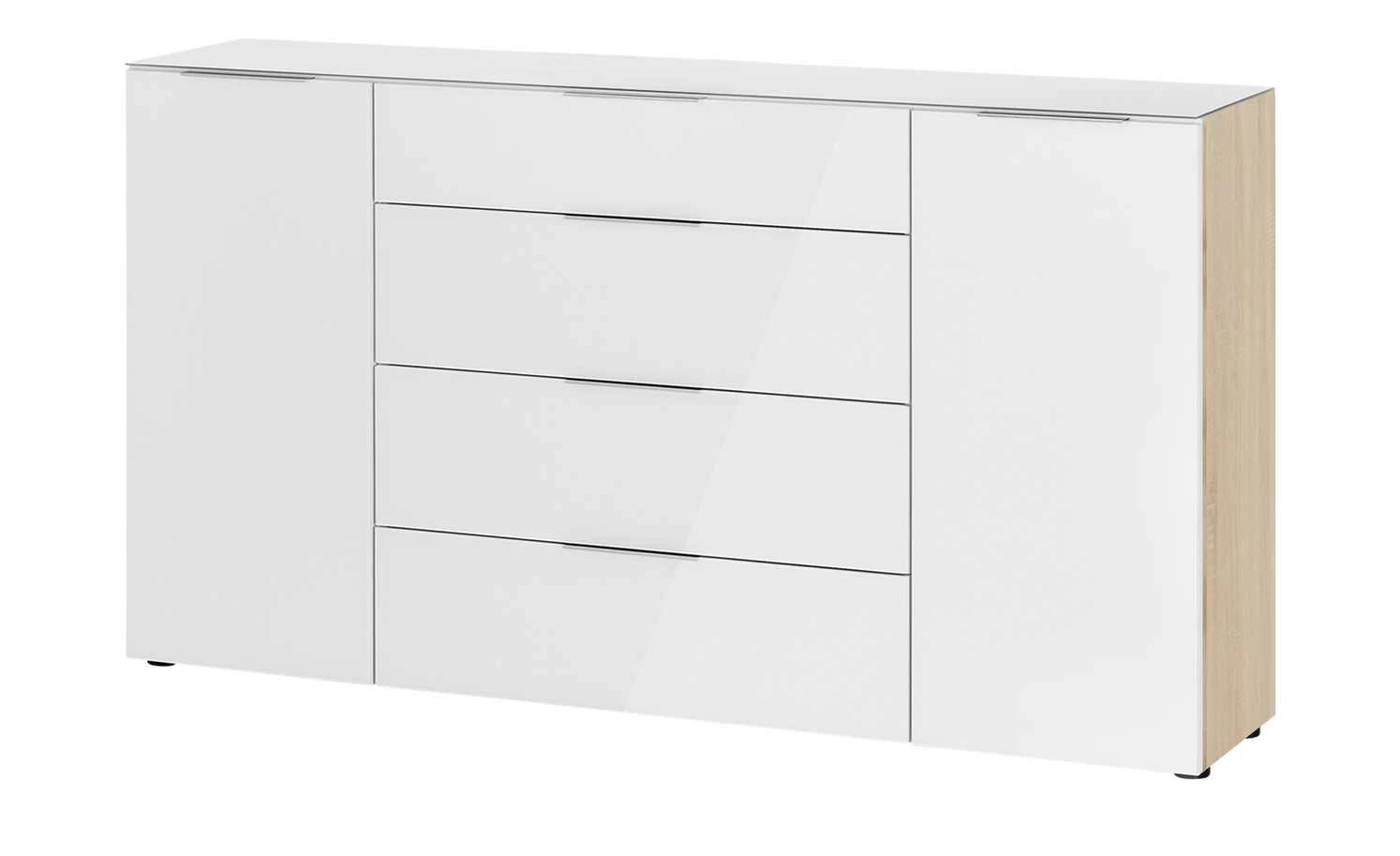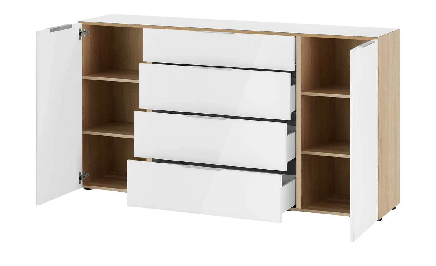 Mit ihrem modernen Look und praktischen Nutzen ist die Kommode Vitreo ein Highlight für jeden Raum. Die geradlinige Linienführung wird mit einem puren und leuchtenden Weiß kombiniert. Die Front hat eine Oberfläche aus ESG-Sicherheitsglas. Es ist besonders hart und widerstandsfähig – und gibt der Front ein glänzendes Finish. Zusätzliche Akzente werden durch die verchromten Griffleisten gesetzt. Der Korpus der Kommode hat eine natürliche Holzoptik. Er ist melaminbeschichtet und somit kratzerunempfindlich und leicht zu pflegen. Vitreo ist mit vier großen Schubladen ausgestattet, die übereinander angeordnet sind. Links und rechts davon befindet sich jeweils eine Tür mit drei Fächern dahinter. Alle vier Schubkästen und die beiden Türen haben einen integrierten Dämpfer für leises Schließen.