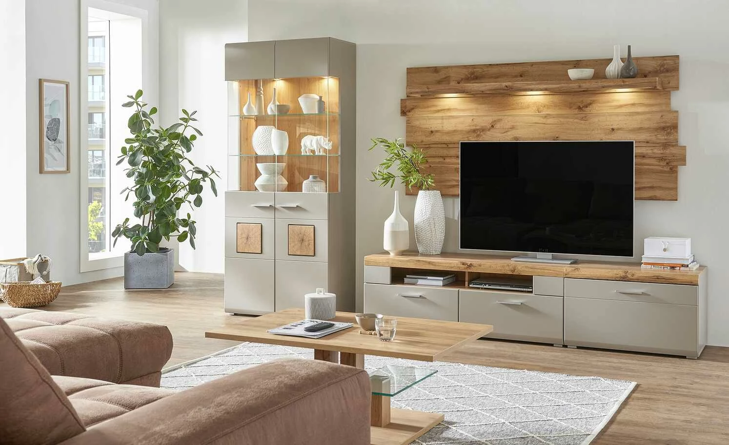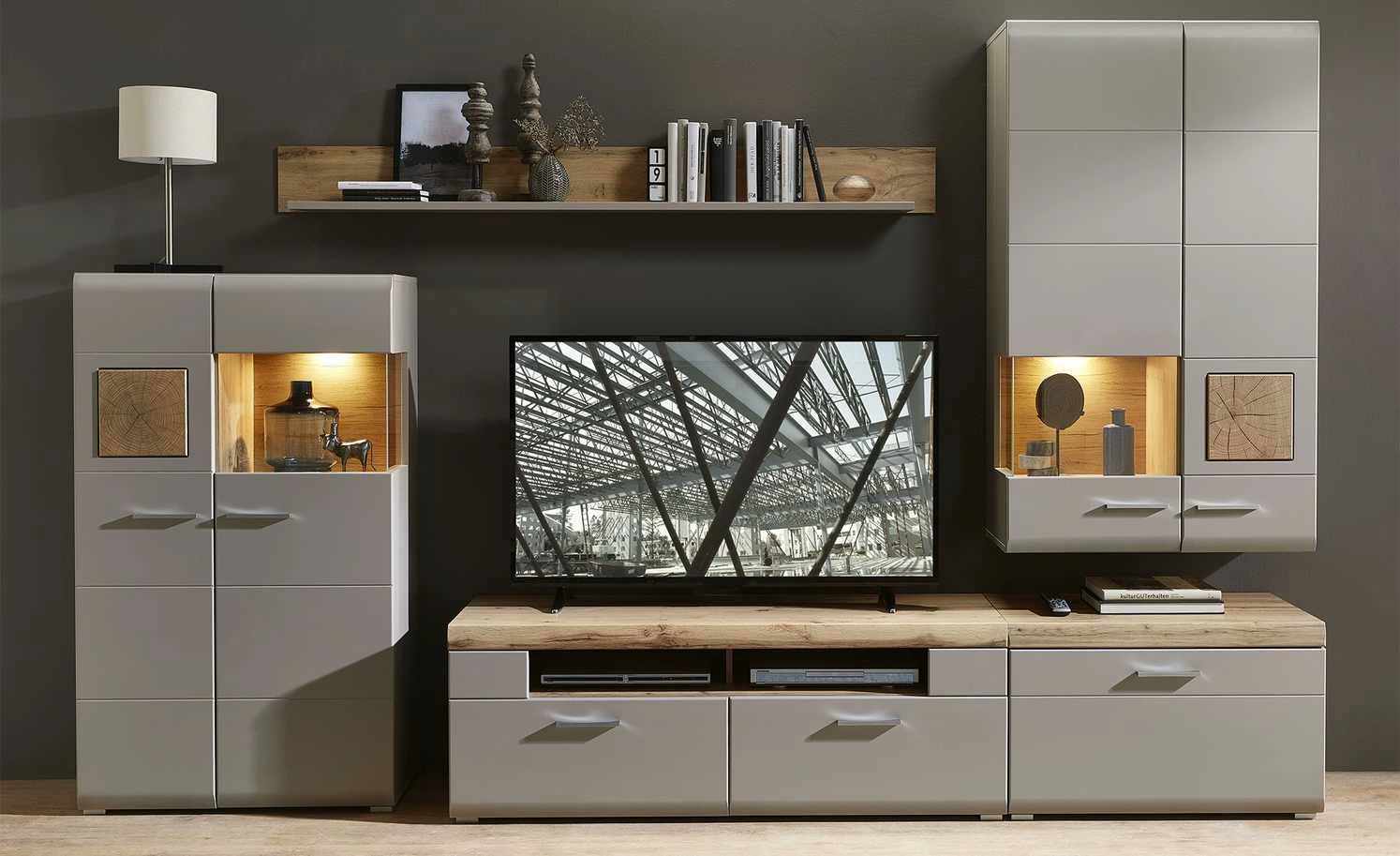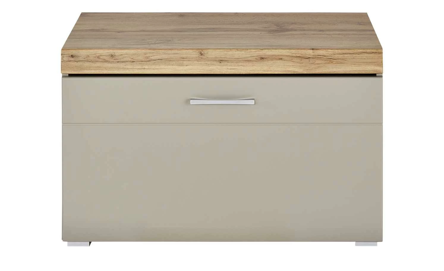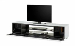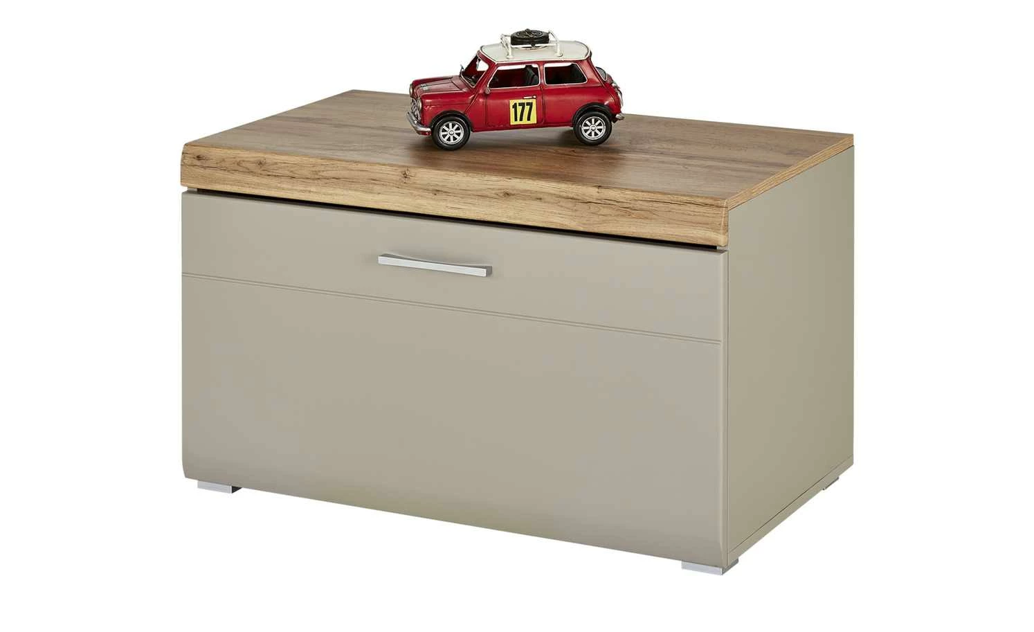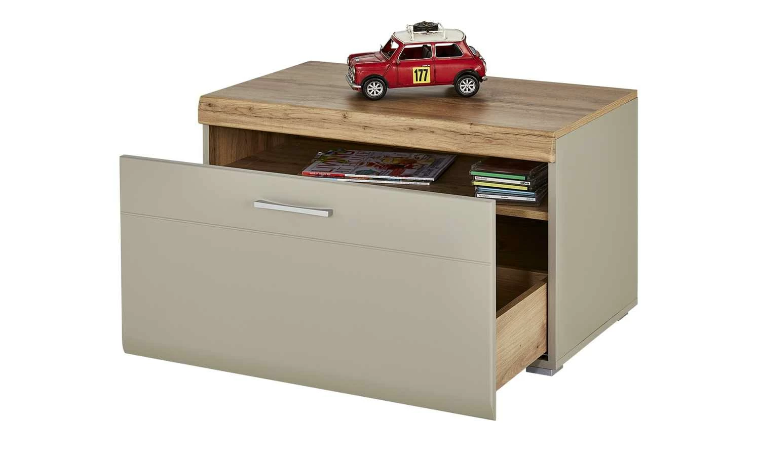 Das Lowboard Cortina kann einzeln oder in Kombination mit den anderen Lowboards der Serie genutzt werden. Cortina verfügt über eine große Schublade, die sich über die gesamte Breite des Lowboards erstreckt. Front und Korpus sind in mattem Basalzgrau designt. Abdeckplatte und Boden setzen sich in Eiche Altholz (Nachbildung) ab.