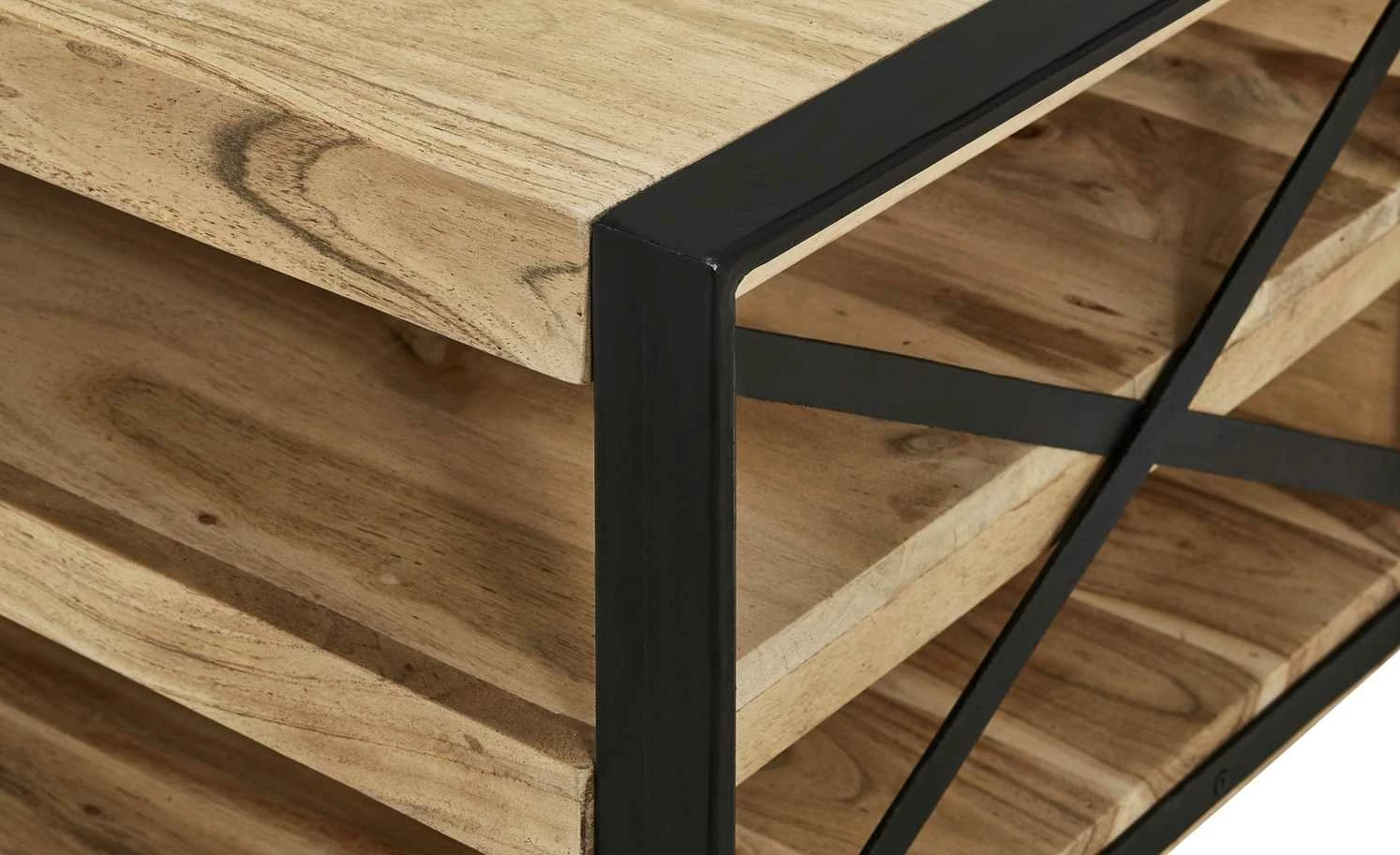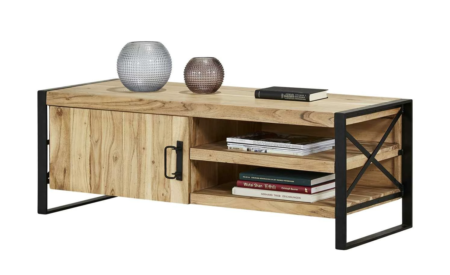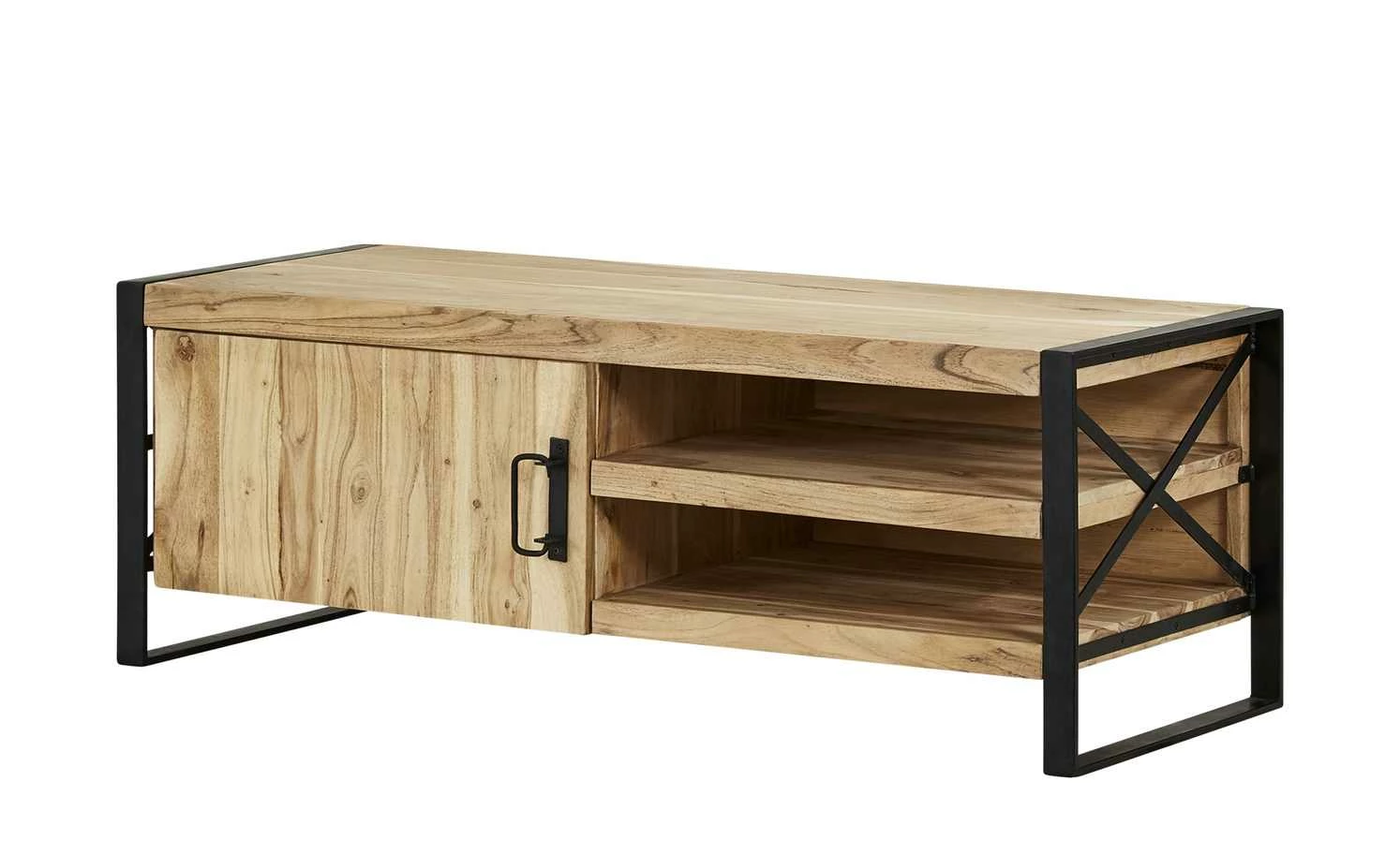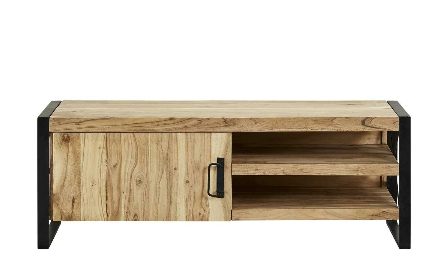 Massives Akazienholz und mattschwarze Metallkufenfüße erzeugen beim Lowboard Queens den beliebten Industrial-Look. Das einzigartig gemaserte Holz wurde gebeizt und lackiert und setzt einen schönen Kontrast zu den schwarzen Kufenfüßen. In den zwei offenen Fächer auf der rechten Seite können Sie Zeitschriften, Bücher oder Zubehör ablegen. Hinter der blickdichten Tür auf der linken Seite finden Sie zusätzlichen Stauraum. Das Lowboard Queens lässt sich nicht nur mit der gleichnamigen Serie kombinieren, sondern passt auch in weitere zahlreiche Einrichtungsstile.