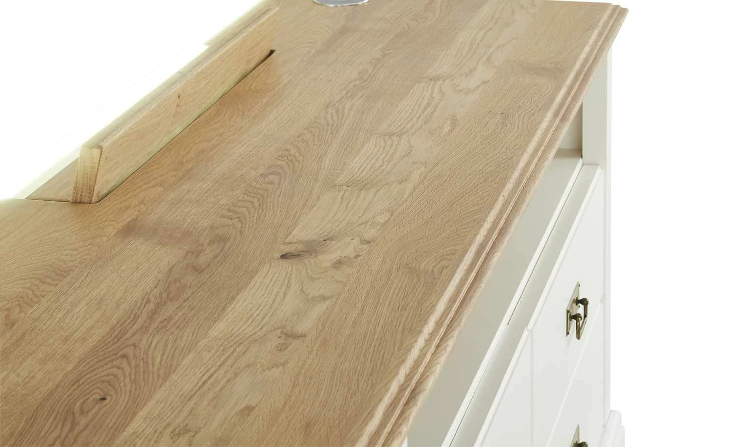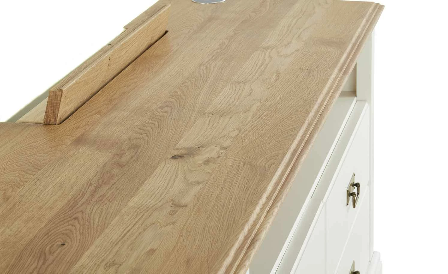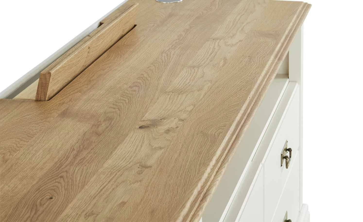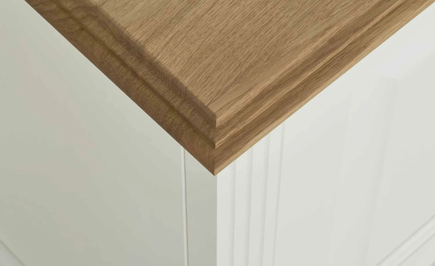 - Mehr zum Material: Korpus und Front aus nordischer Polarkiefer massiv in Reinweiß lackiert, Oberplatte aus Wildeiche natur massiv geölt
