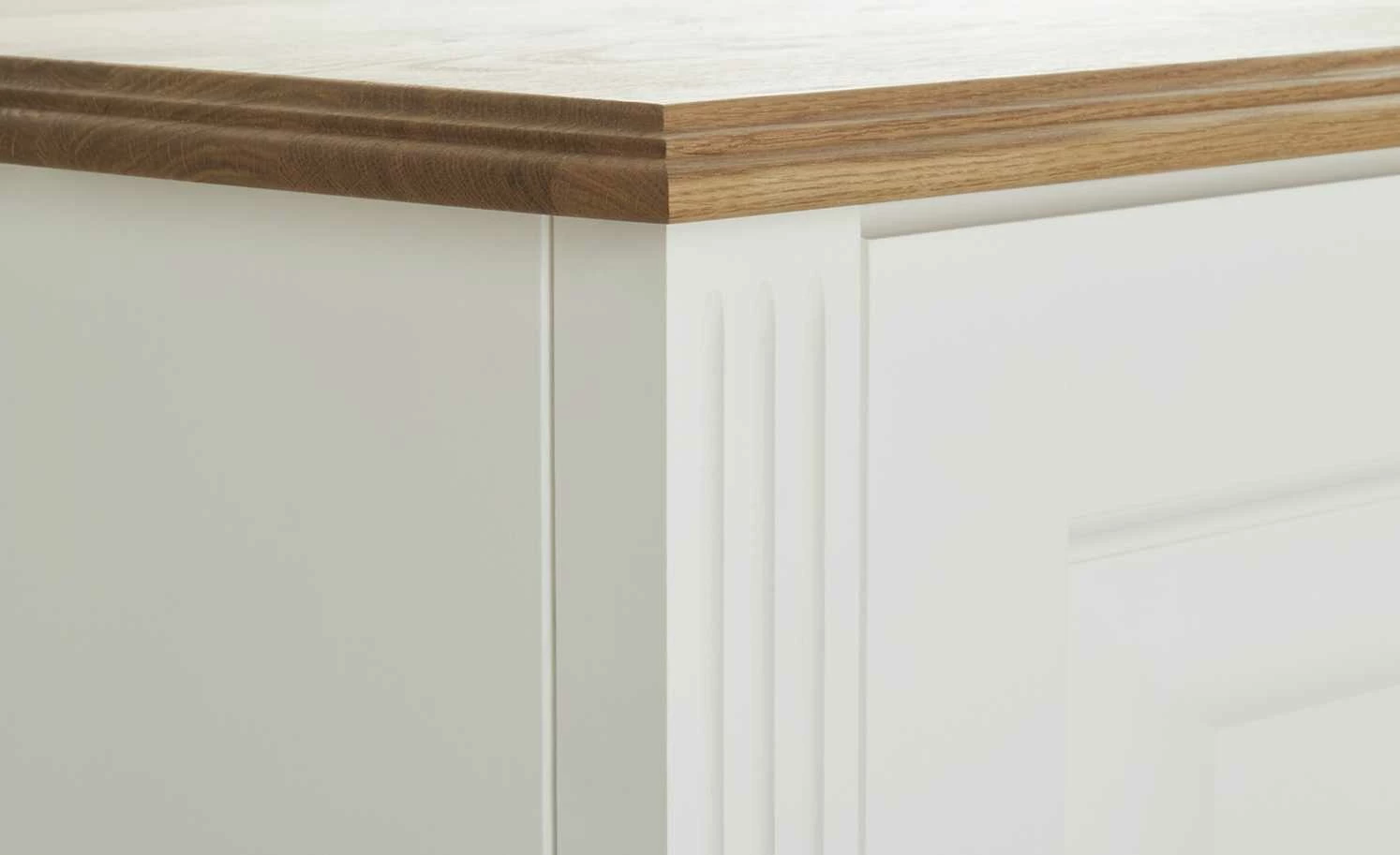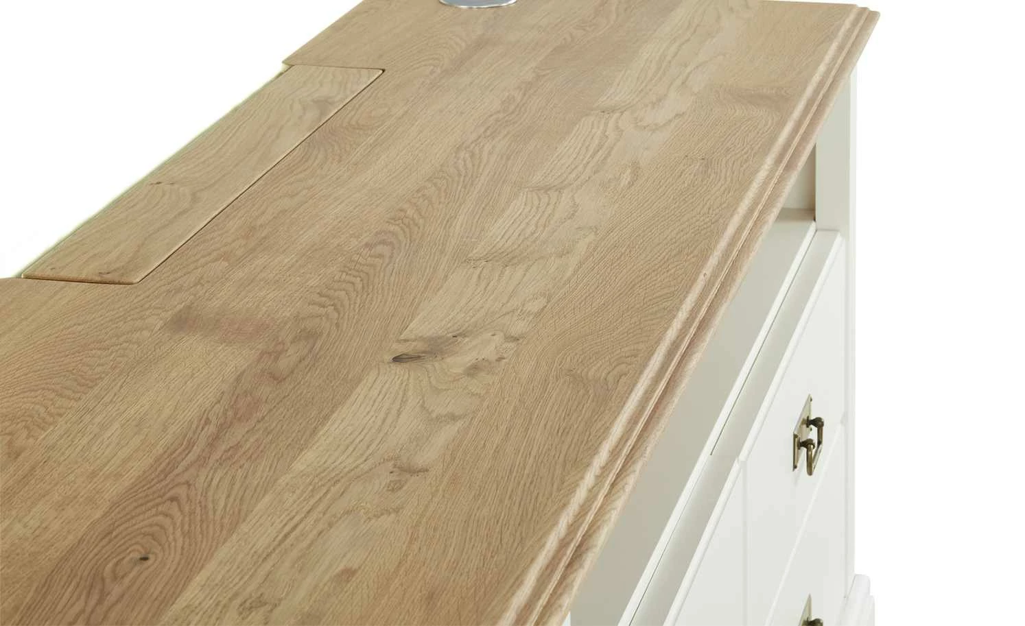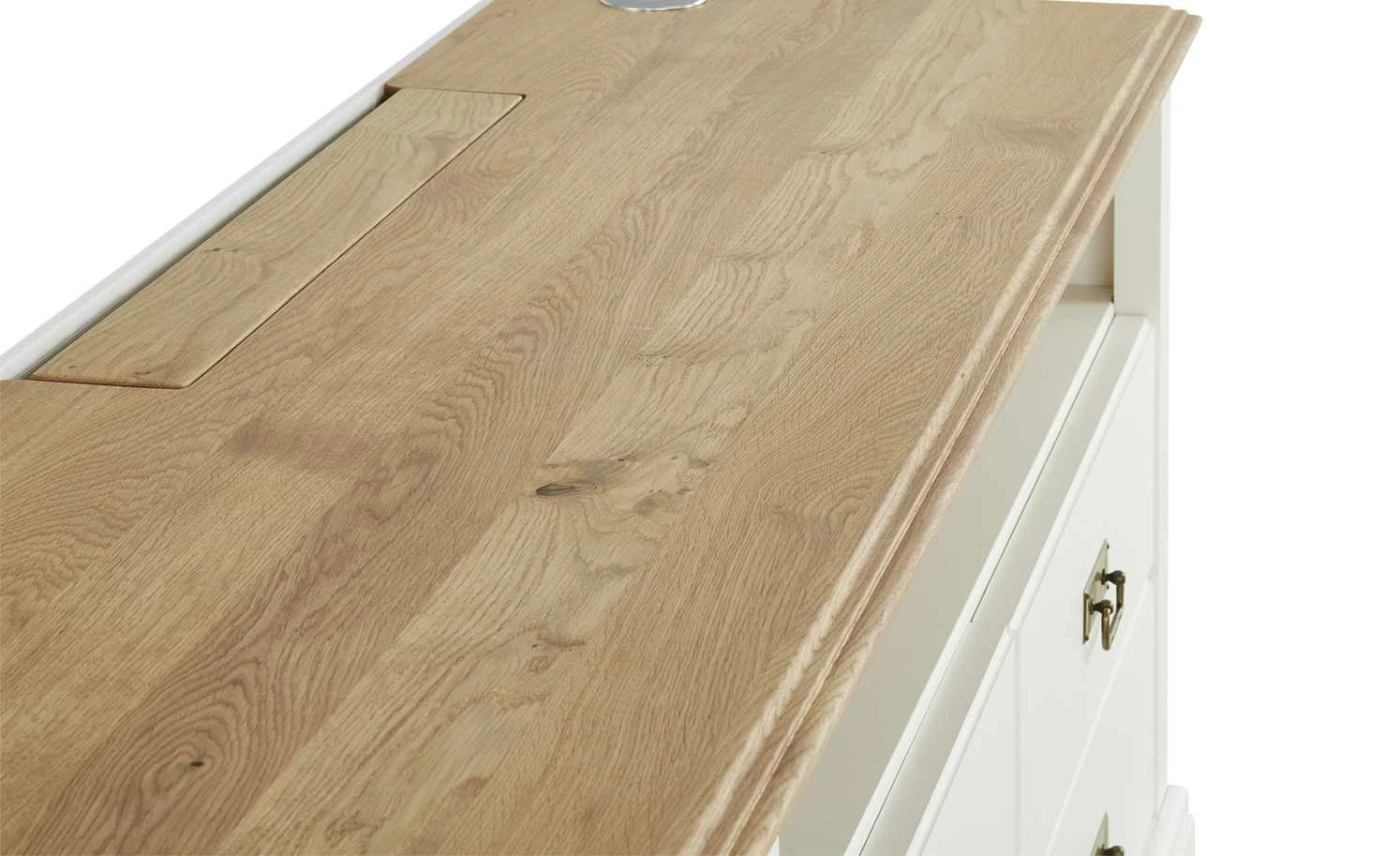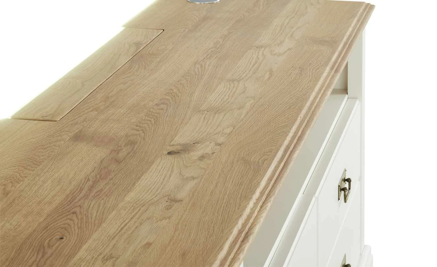 - Mehr zum Material: Korpus und Front aus nordischer Polarkiefer massiv in Reinweiß lackiert, Oberplatte aus Wildeiche natur massiv geölt