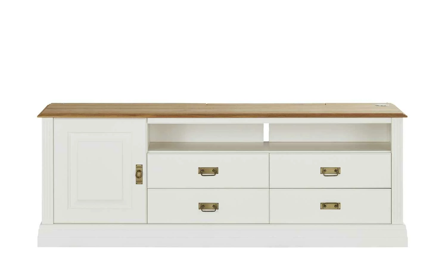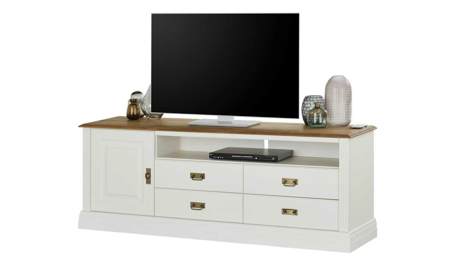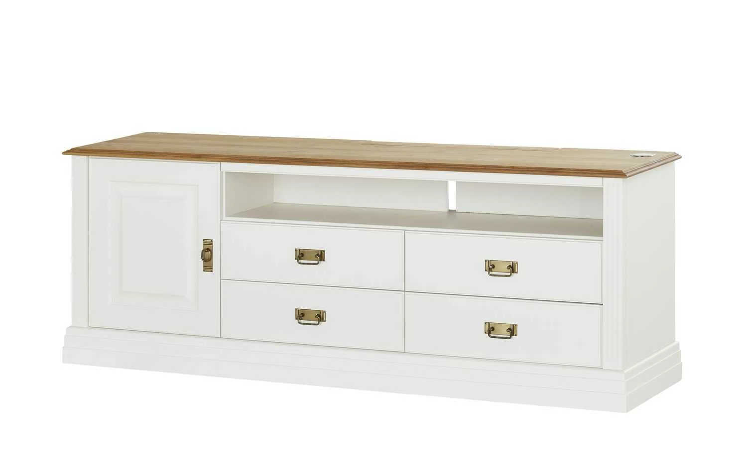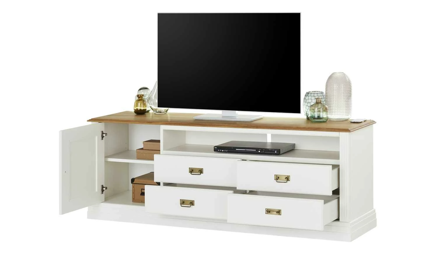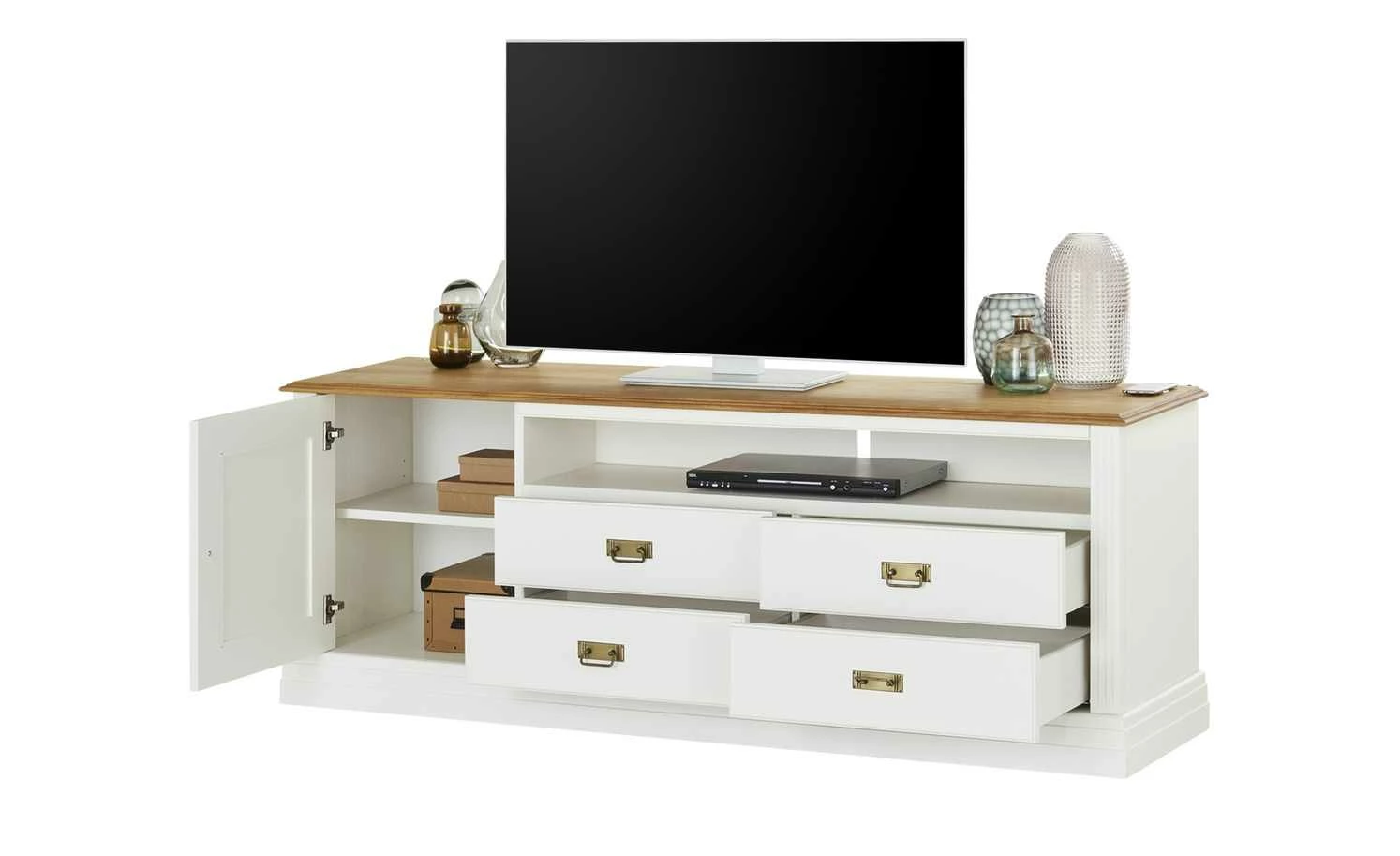 Das Landhausdesign strahlt Gemütlichkeit und Geborgenheit aus. Auch das TV-Lowboard Lina von der Marke maison bleue ist im Landhausstil designt. Passend dazu: der freundliche reinweiße Farbton. Die Abdeckplatte setzt sich in Wildeiche Natur ab. Ein schöner, natürlicher Kontrast zur hellen Farbe. Lina ist komplett aus Massivholz gefertigt. Dadurch ist das Lowboard besonders stabil und langlebig. Auch die Verarbeitung und fein lackierten bzw. geölten Oberflächen haben eine herausragende Qualität. Neben Platz für Ihren Fernseher und einem großen Gerätefach, bietet Lina Stauraum hinter einer Tür und in zwei Schubladen. Das Kabelmanagement sorgt dafür, dass störender Kabelsalat verhindert wird.