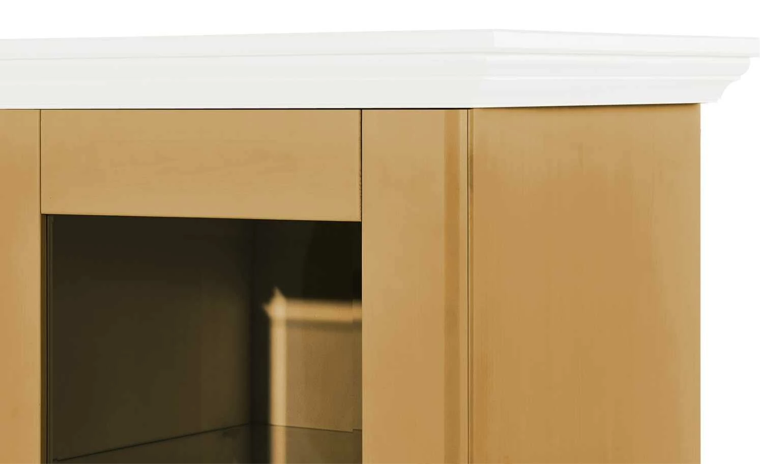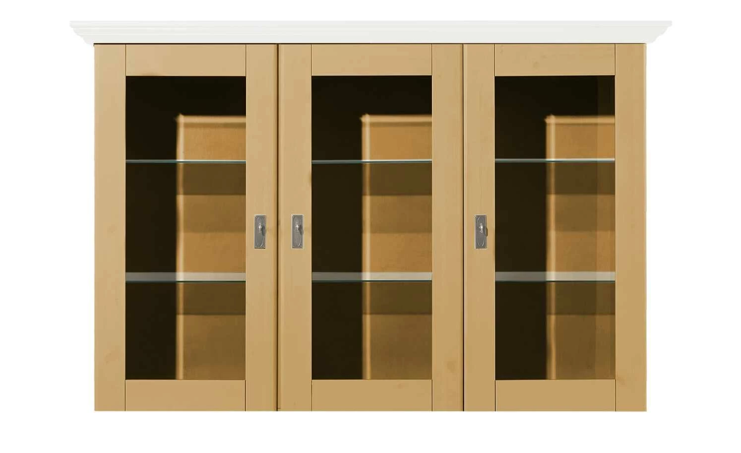 Vitrinen sind gleich doppelt praktisch. Sie bieten Stauraum – und zeitgleich können Sie darin Ihr Geschirr oder Porzellan in Szene setzen. Der Vitrinenaufsatz Florian von maison bleue ist eine Ergänzung für das gleichnamige Sideboard. Er wird einfach auf das Sideboard gesetzt. Der Aufsatz im Landhausstil verfügt über drei Türen mit Glaseinsatz. Für einen freien Blick in die Fächer dahinter. Innen können Sie gleich neun Vitrinenfächer nutzen. Florian besteht aus massiver Kiefer und ist weiß gebeizt und lackiert. Der Kranz setzt sich farblich ab.