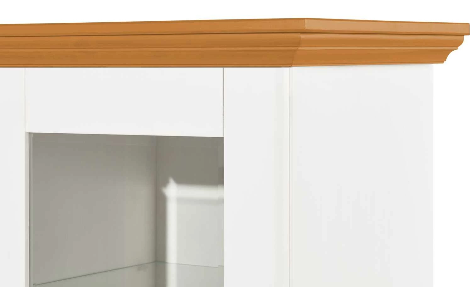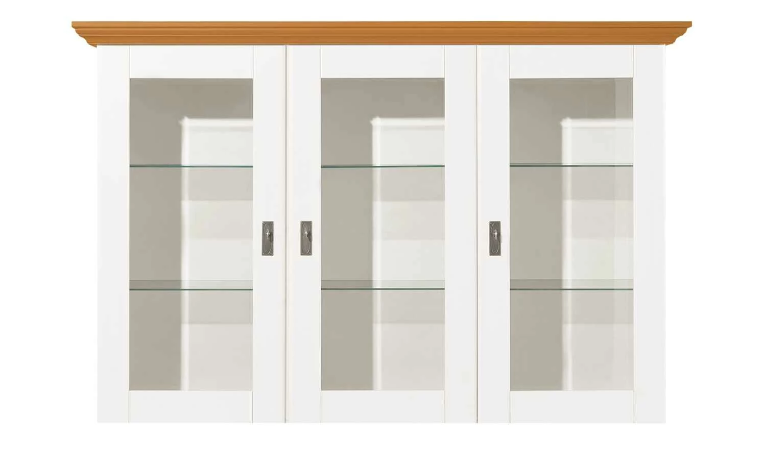 Vitrinen sind gleich doppelt praktisch. Sie bieten Stauraum – und zeitgleich können Sie darin Ihr Geschirr oder Porzellan in Szene setzen. Der Vitrinenaufsatz Florian von maison bleue ist eine Ergänzung für das gleichnamige Sideboard. Er wird einfach auf das Sideboard gesetzt. Der Aufsatz im Landhausstil verfügt über drei Türen mit Glaseinsatz. Für einen freien Blick in die Fächer dahinter. Innen können Sie gleich neun Vitrinenfächer nutzen. Florian besteht aus massiver Kiefer und ist weiß gebeizt und lackiert. Der Kranz setzt sich farblich ab.