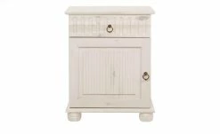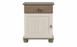 Diese optisch ansprechende Nachtkommode ist nicht nur praktisch, sondern bereichert Ihr Schlafzimmer auch dekorativ. Durch das rustikale Landhaus-Design und die Farbgestaltung in Weiß und Kiefer passt der Nachtschrank ideal zum gleichnamigen Bettgestell der Serie Bornholm. Die Nachkommode besteht aus massivem Kiefernholz – die Oberfläche ist lackiert. Im Inneren bietet die praktische Nachtkommode ausreichend Platz für alles, was Sie neben Ihrem Bett aufbewahren möchten. Oberhalb des geräumigen Faches mit Drehtür befindet sich eine Schublade. Die Zug-Griffe in Ringform aus Metall sind im Used-Look gehalten und sorgen neben ihrer Funktion auch für optische Highlights.
