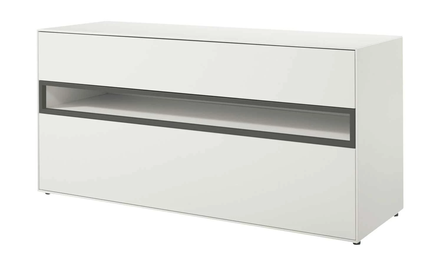 Das Lowboard now! easy by hülsta fällt durch sein stilvolles, gradliniges Design auf. Es ist mit einem großen und einem kleinen Schub ausgestattet. Diese können Sie mit der Push-to-Open-Funktion öffnen. Drücken Sie sie leicht an, damit die Schübe sich öffnen. Darüber hinaus hat now! easy ein offenes Fach. Wenn Sie farbige Highlights mögen, dann wählen Sie das reinweiße Modell mit einer Absetzung in Grau oder Natureichen-Furnier. Wenn Sie Purismus lieben, dann ist das Modell ganz in Reinweiß sicherlich ideal für Sie.