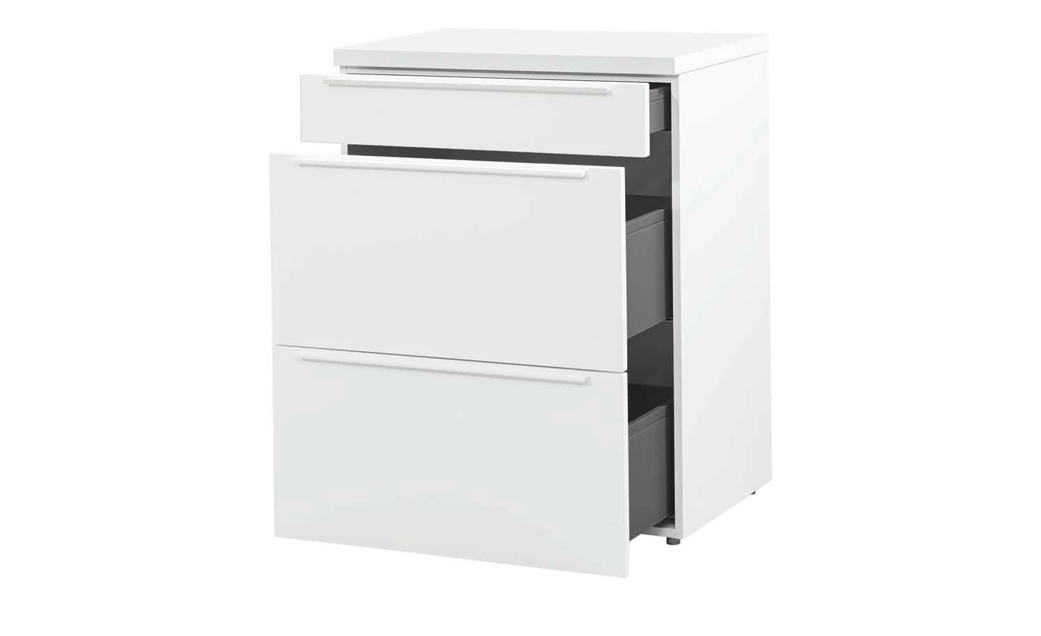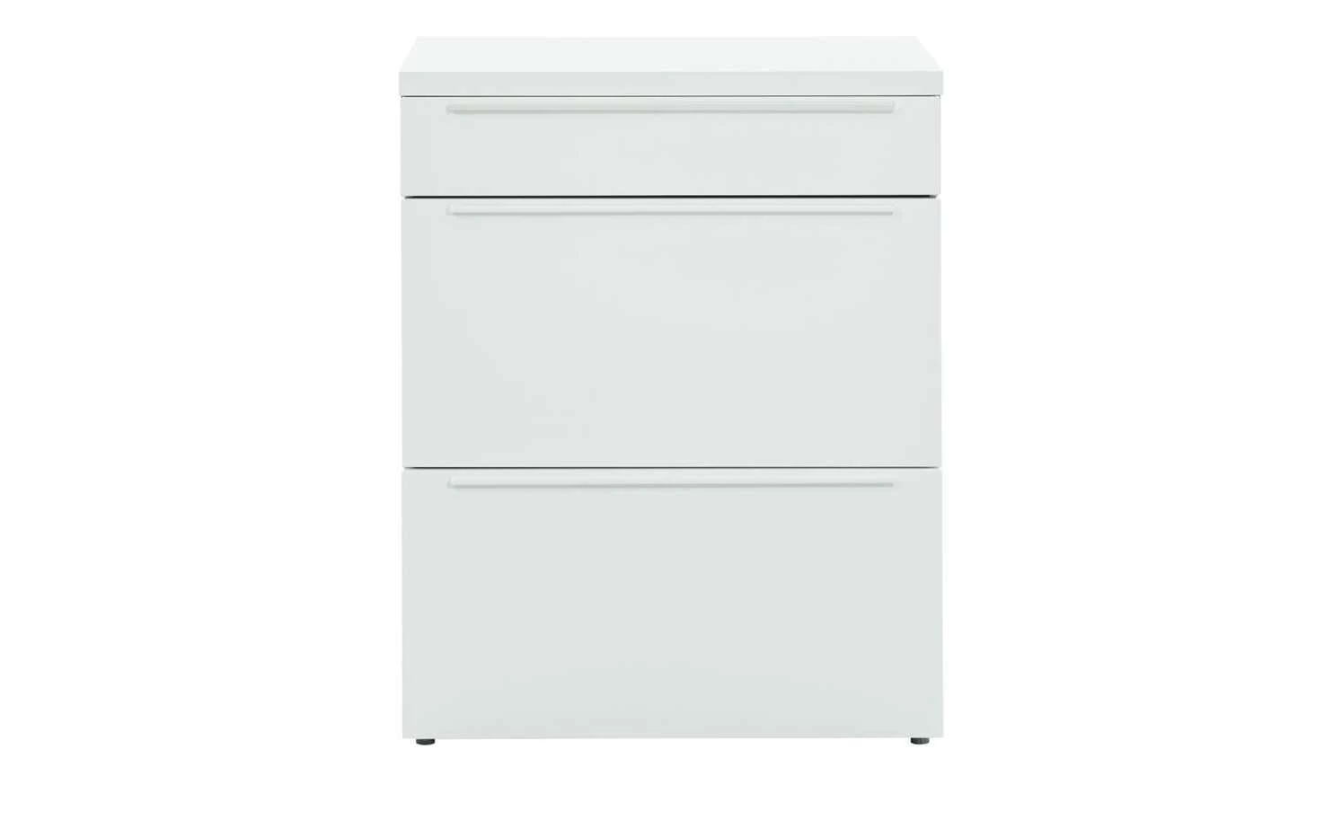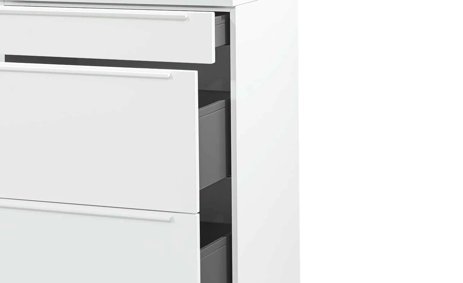 - Mehr zu Ausstattung / Funktion: Schubladen auf Unterflurkugelführung mit gedämpftem Selbsteinzug als Teilauszug, 1,7 cm hohe schwarze Kunststoff-Stellfüße, die durch Drehen Unebenheiten ausgleichen und einen schwebenden Charakter erzeugen, supermatte, samtige Oberflächen mit Anti-Fingerprint-Ausrüstung