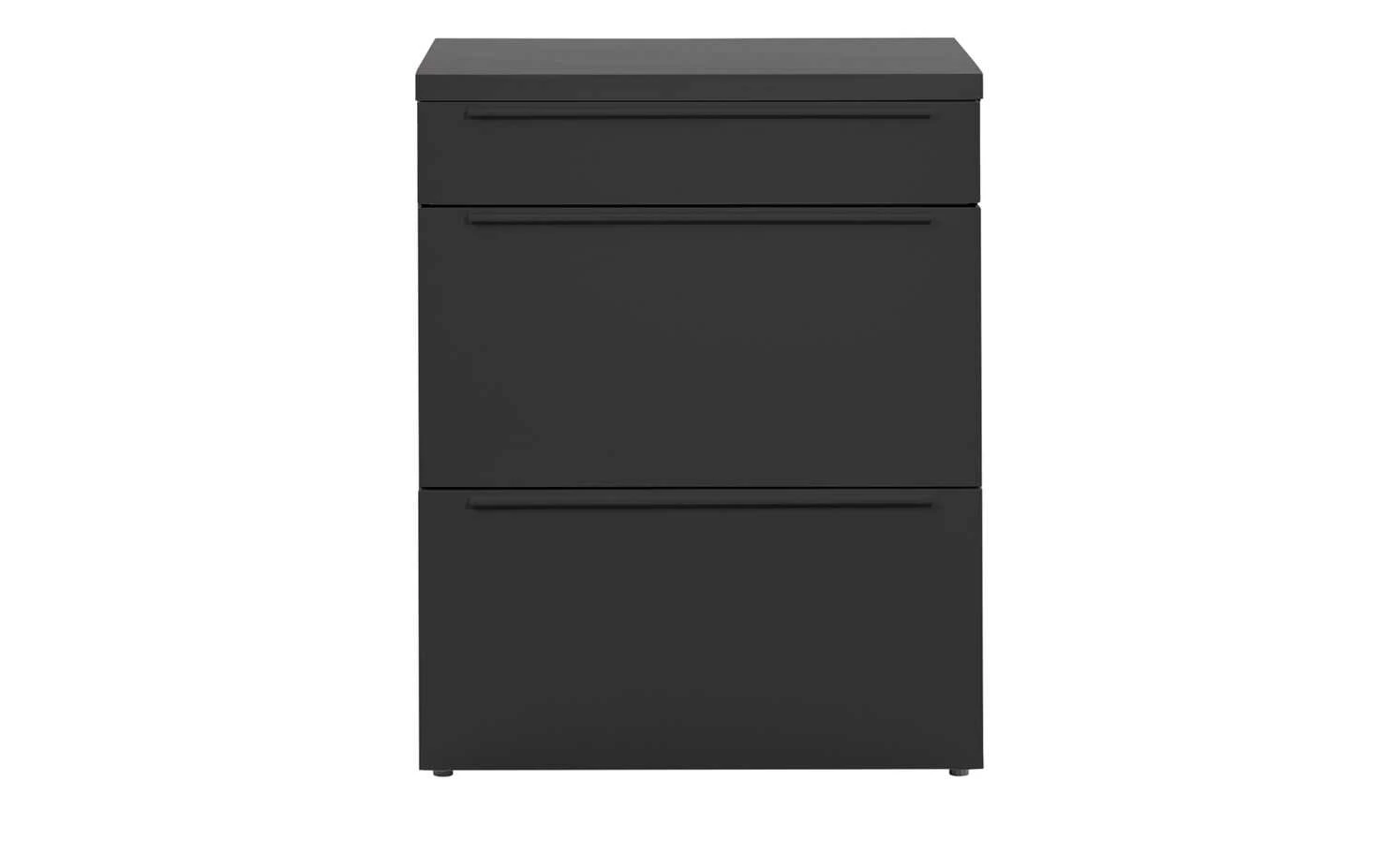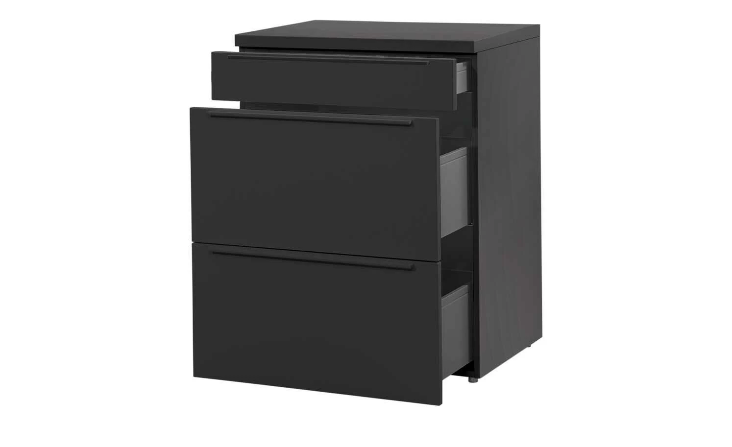 - Mehr zu Ausstattung / Funktion: Schubladen auf Unterflurkugelführung mit gedämpftem Selbsteinzug als Teilauszug, 1,7 cm hohe schwarze Kunststoff-Stellfüße, die durch Drehen Unebenheiten ausgleichen und einen schwebenden Charakter erzeugen, supermatte, samtige Oberflächen mit Anti-Fingerprint-Ausrüstung