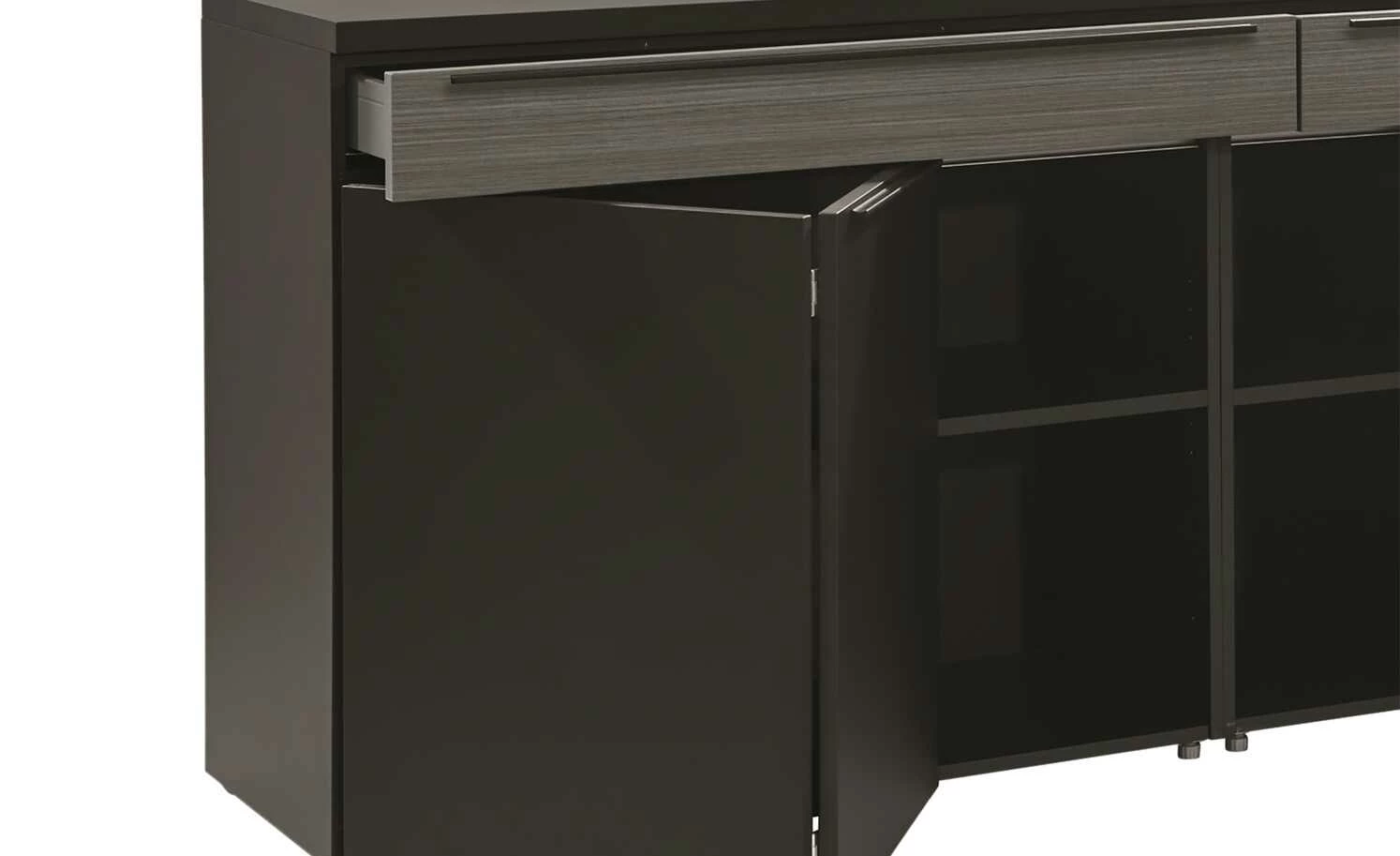 - Mehr zu Ausstattung / Funktion: 1,7 cm hohe schwarze Kunststoff-Stellfüße, die durch Drehen Unebenheiten ausgleichen und einen schwebenden Charakter erzeugen, Schubladen auf Unterflurkugelführung mit gedämpftem Selbsteinzug als Teilauszug, supermatte, samtige Oberflächen mit Anti-Fingerprint-Ausrüstung